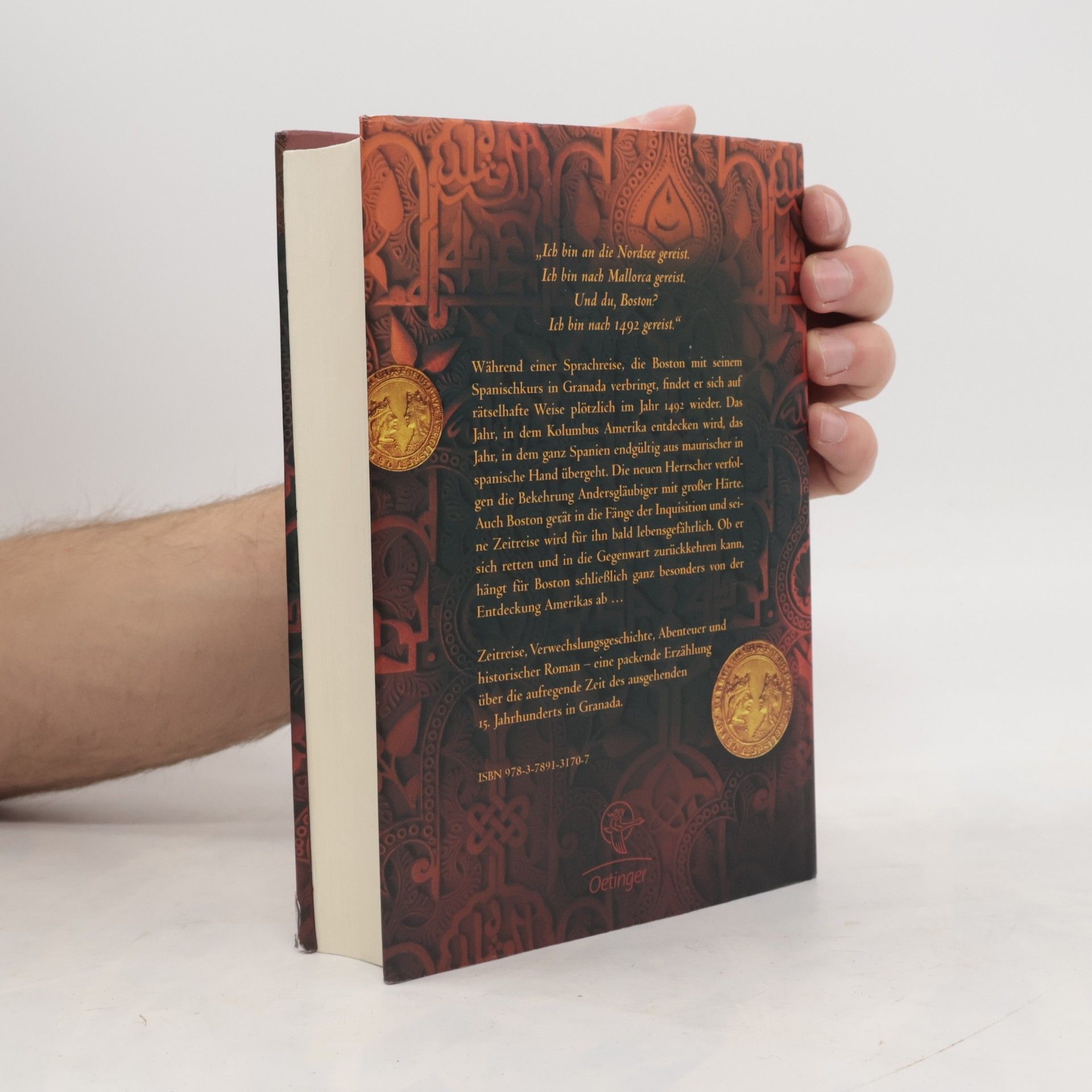 Granada, 1492. Ein Tor in der Zeit und plötzlich verändert sich die Welt …Gerade war Boston noch mit seinen Mitschülern auf dem arabischen Seidenmarkt in Granada. Plötzlich ist alles anders: Durch ein Tor in der Zeit ist Boston im Jahr 1492 gelandet. Dort wird es für ihn lebensgefährlich. Er erweckt Misstrauen am spanischen Königshof und auf der Alhambra gerät er in die grausamen Fänge der Inquisition. Doch zwei neue Freunde, Tariq und Salomon, als Muslim und Jude selbst bedroht, stehen ihm in dieser fast ausweglosen Situation bei. Aber die Rückkehr Bostons hängt nicht nur davon ab, ob er den Schlüssel zur Gegenwart findet, sondern auch von der Entdeckung Amerikas …