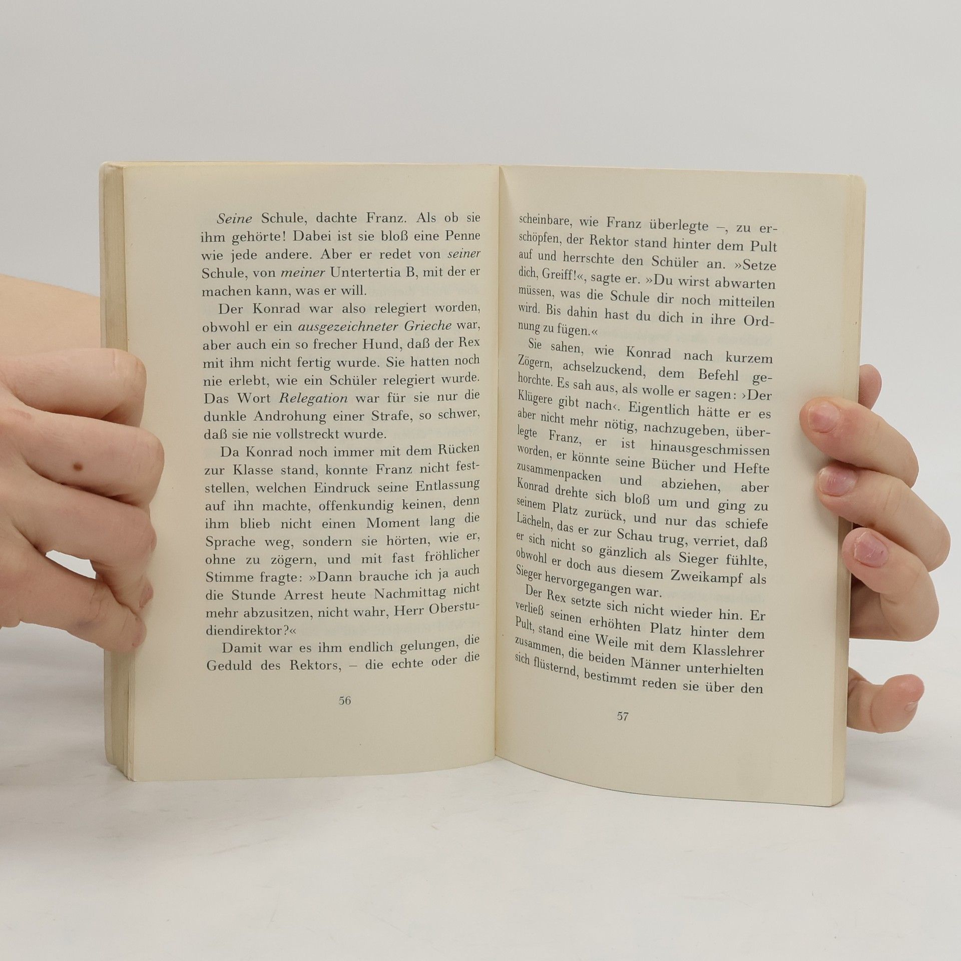 Der vierzehnjährige Franz Kien beschreibt eine Griechischstunde im Mai 1928. Schuldirektor Himmler kommt, um die Klasse zu inspizieren. Bald wird jedoch klar, daß er vorhat, ganz bestimmte Schüler zu examinieren. Nach dem Adligen Konrad von Greiff ist Franz Kien selbst an der Reihe. Der Schuldirektor unternimmt alles, um ihn zu blamieren.