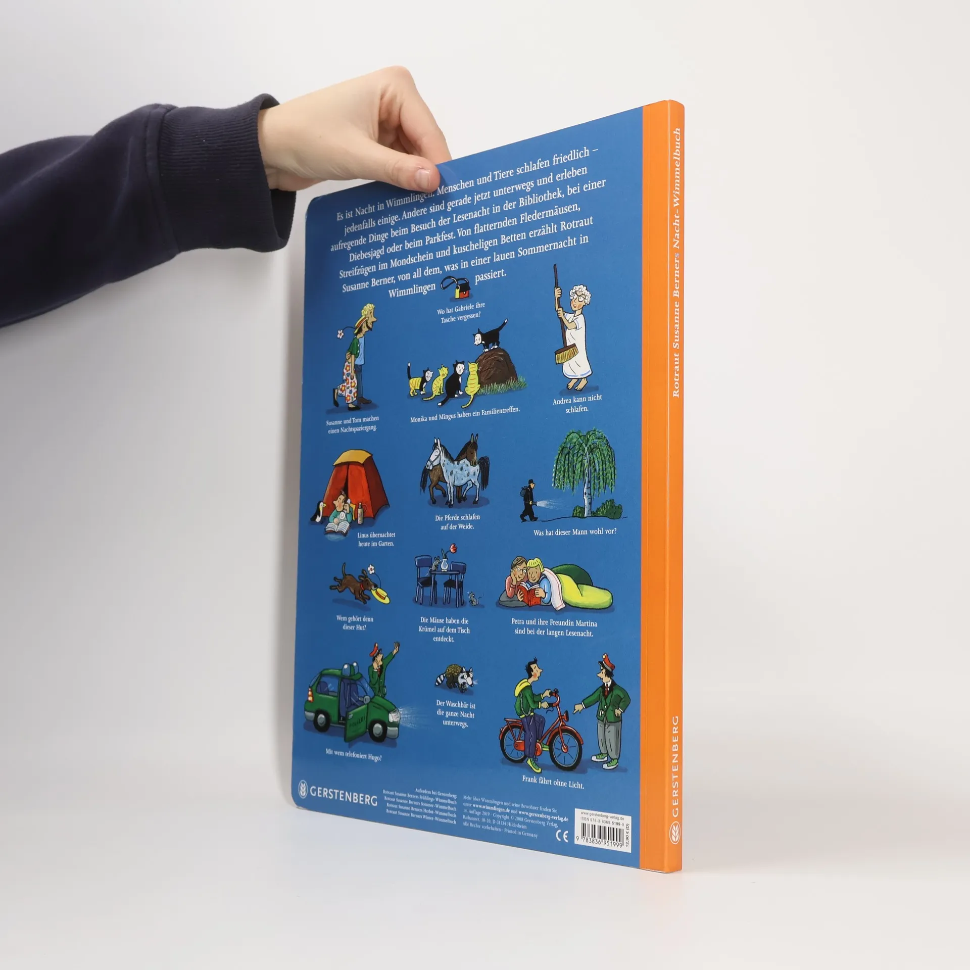 Es ist Nacht in Wimmlingen. Menschen und Tiere schlafen - jedenfalls einige. Andrea kann nicht einschlafen, weil Thomas im Stockwerk über ihr noch duscht. Niko schlummert dagegen friedlich unter einem Tuch in seinem Vogelbauer. Draußen flattern Fledermäuse herum und ein Igel schnuffelt durchs Gras. Im Kulturzentrum in der Bibliothek gibt es eine Lesenacht, im Erdgeschoss schimmern grünlich die Terrarien der Reptilienausstellung. Im Bahnhof steht der Nachtzug bereit. Auch wenn nachts längst nicht so viele Leute unterwegs sind, ist doch eine Menge los in dieser lauen Sommernacht in Wimmlingen. Ein Einbrecher nutzt die Dunkelheit, um in die Zahnarztpraxis einzubrechen. Ob er unerkannt entkommen kann? Höhepunkt und Abschluss dieses ganz besonderen Wimmelabenteuers bildet das Parkfest mit Feuerwerk. Unzählige Details machen dieses stimmungsvolle Nachtbuch zur idealen Bettlektüre für kleine und große Wimmelfans. Empfohlen für Kinder von 2 bis 6 Jahren.