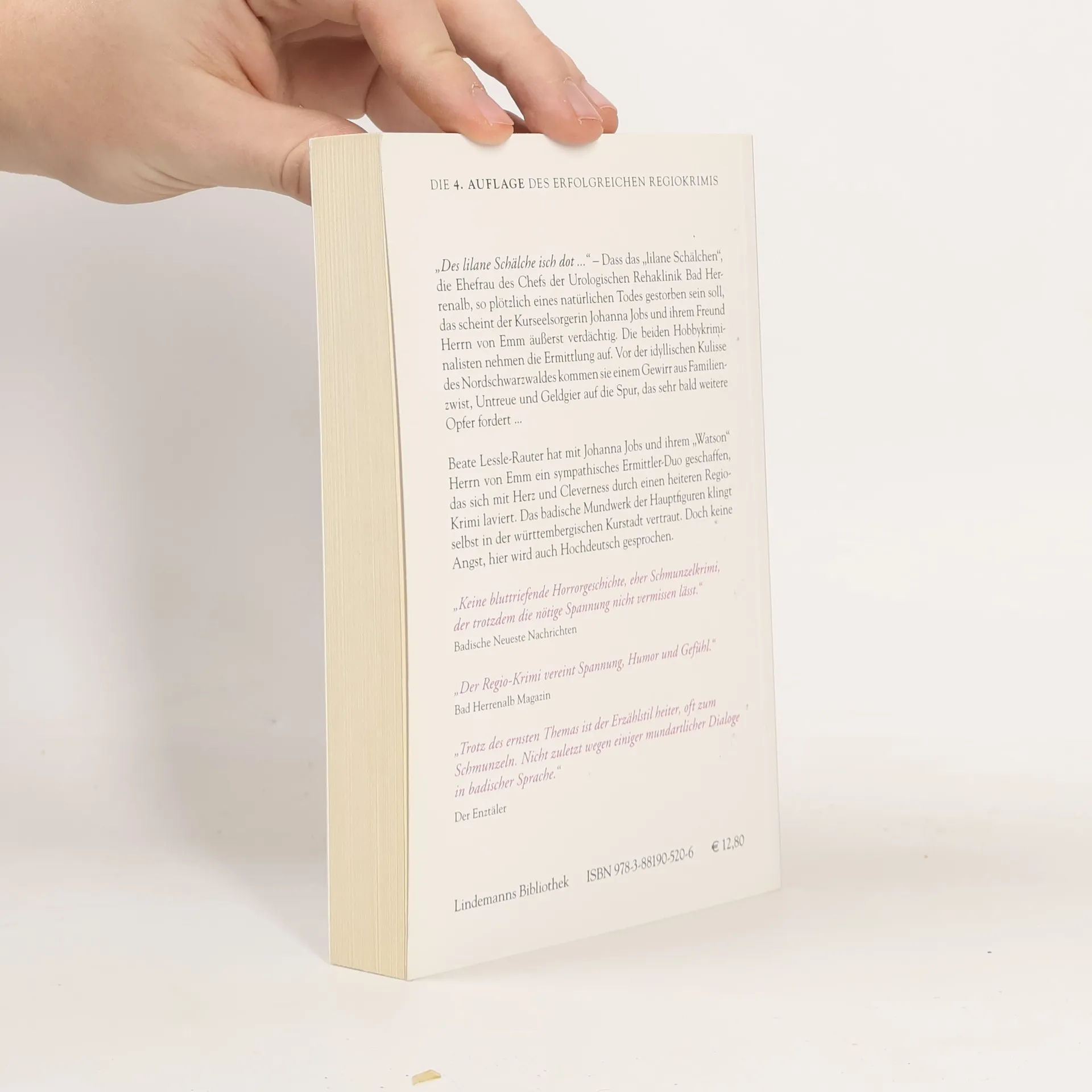 „Des lilane Schälche isch dot.“ Der plötzliche Tod von Rosa Kannenpütt, der Ehefrau des Chefs der Urologischen Rehaklinik Bad Herrenalb, scheint der Kurseelsorgerin Johanna Jobs und ihrem Freund Herrn von Emm äußerst verdächtig. Das kann nicht mit rechten Dingen zugegangen sein, das „lilane Schälche“ war doch kerngesund?! Die beiden Hobbykriminalisten nehmen die Ermittlung auf. Wusste die Tote vom Verhältnis ihres Mannes mit seiner Sekretärin? Warum benimmt sich der neue Zivi so seltsam? Und was macht die Polizei im Seelsorgebüro? Vor der idyllischen Kulisse des Nordschwarzwaldes kommen Jobs und von Emm gemeinsam mit ihrem Freund Kommissar Kupperer einem Gewirr aus Familienzwist, Untreue und Geldgier auf die Spur, das bald weitere Opfer fordert. Die Autorin Beate Lessle-Rauter hat mit Johanna Jobs und ihrem „Watson“ Herrn von Emm ein sympathisches Ermittler-Duo geschaffen, das sich mit Herz und Cleverness durch einen heiteren Regio-Krimi laviert. Das badische Mundwerk der Hauptfiguren klingt selbst in der württembergischen Kurstadt vertraut. Doch keine Angst, hier wird auch Hochdeutsch gesprochen.
