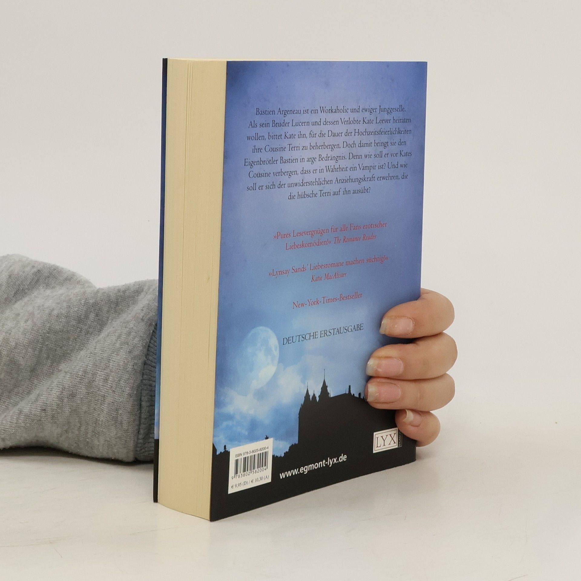 Als ewiger Junggeselle genießt Bastien Argeneau seine Freiheit. Besonders seit sein Bruder Lucern mit seiner Verlobten Kate Leever zusammengezogen ist und er das Penthouse der Familie ganz für sich allein hat. Als Kate ihn bittet, für die Dauer der Hochzeit ihre Cousine Terri zu beherbergen, gerät der Eigenbrötler Bastien jedoch in Bedrängnis. Wie soll er vor Kates Cousine verbergen, dass er in Wahrheit ein Vampir ist? Und noch entscheidender: Wie kann er sich der unwiderstehlichen Anziehungskraft erwehren, die die hübsche Terri auf ihn ausübt? „Eine witzige, verrückte Geschichte ... Leserinnen von Vampirromanen werden sich vor Lachen kaum halten können. Und die Liebesszenen sind ein erotischer Hochgenuss!“ Publishers Weekly