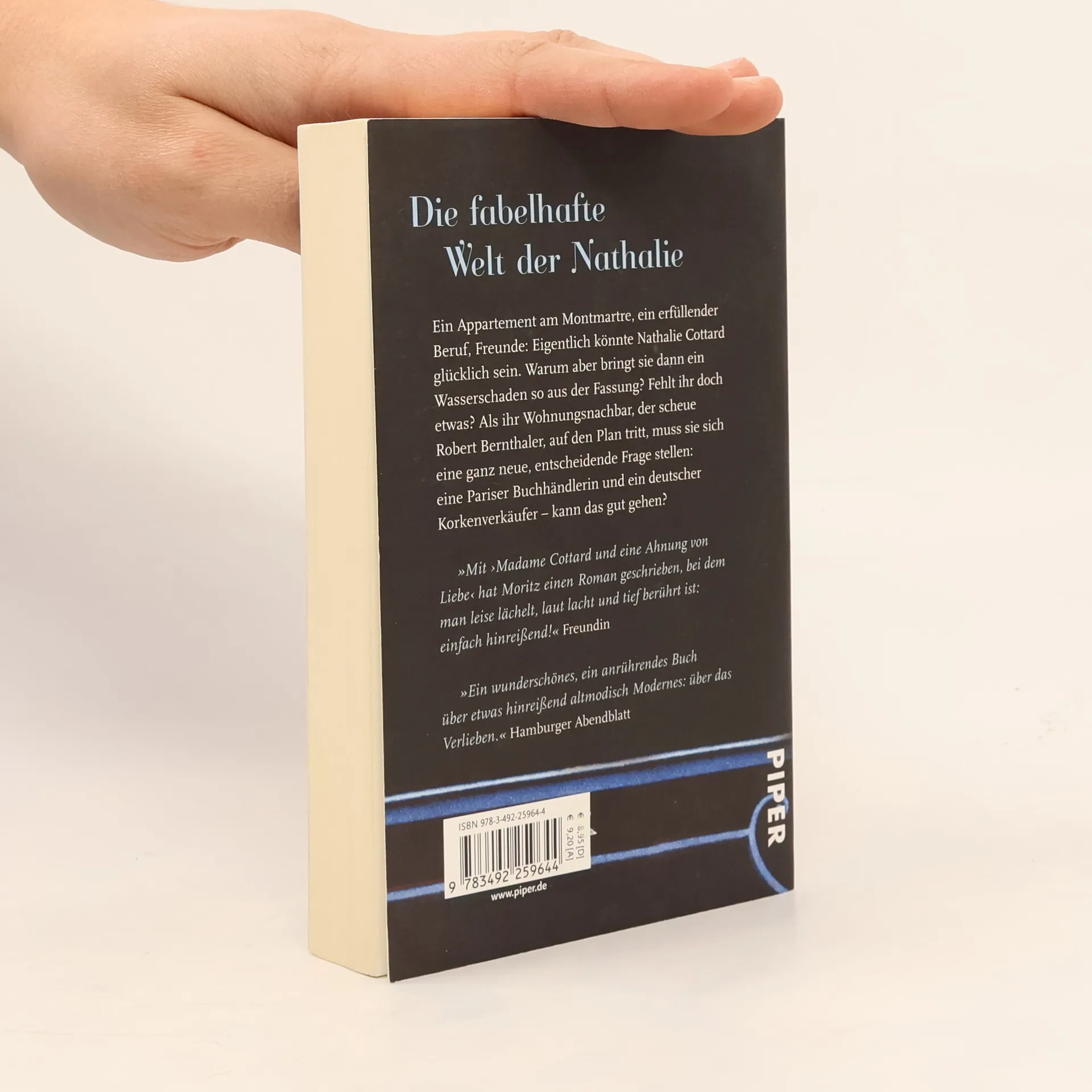 Ein Appartement am Montmartre, ein erfüllender Beruf, Freunde: Eigentlich könnte Nathalie Cottard glücklich sein. Warum aber bringt sie dann ein Wasserschaden so aus der Fassung? Fehlt ihr doch etwas? Als ihr Wohnungsnachbar, der scheue Robert Bernthaler, auf den Plan tritt, muss sie sich eine ganz neue, entscheidende Frage stellen: eine Pariser Buchhändlerin und ein deutscher Korkenverkäufer – kann das gut gehen?