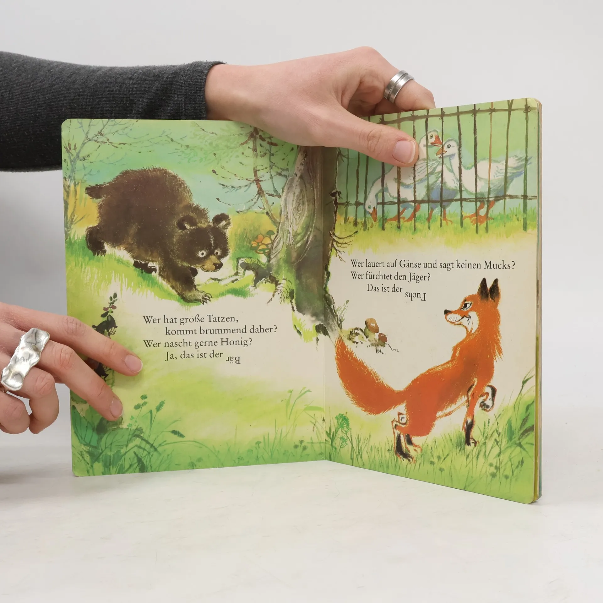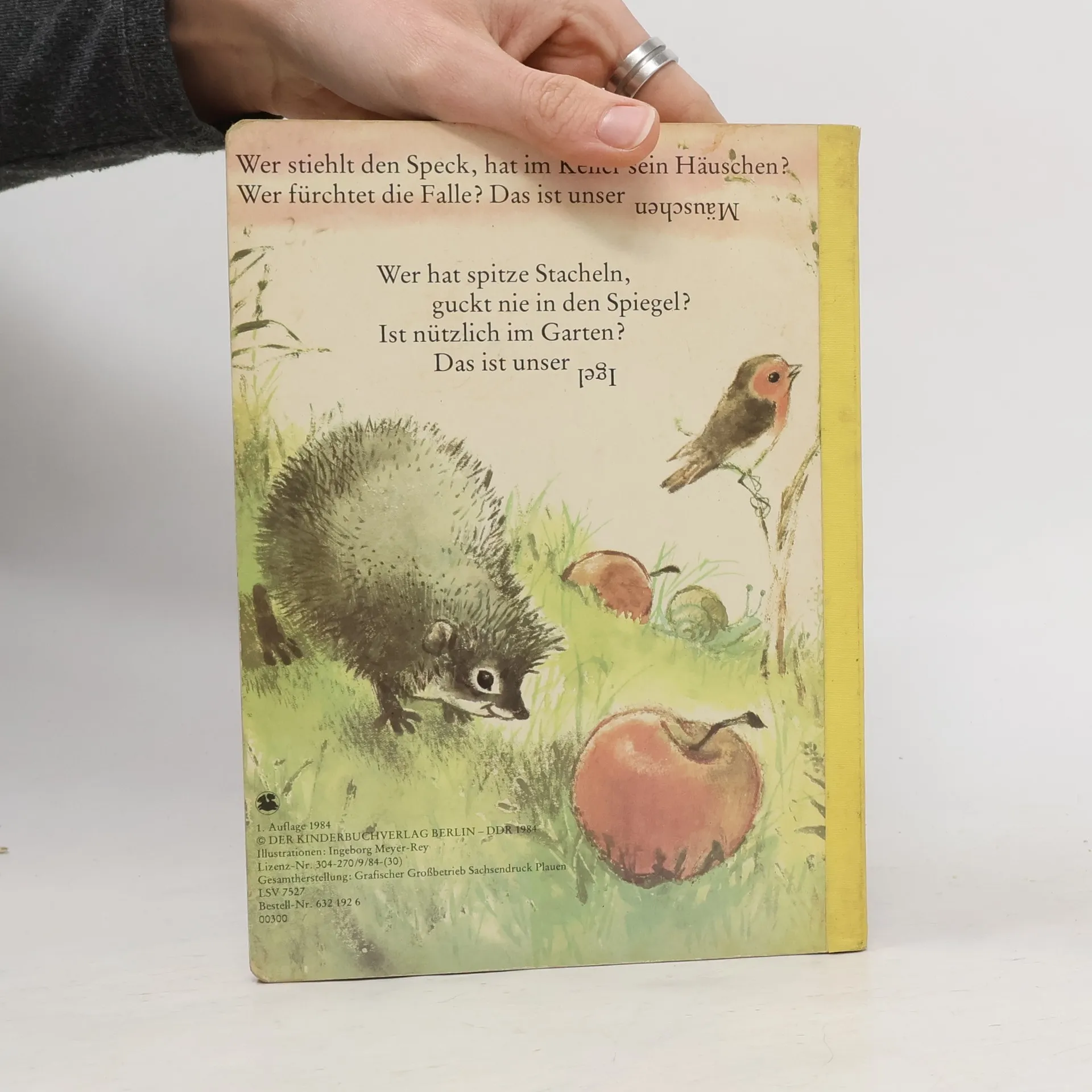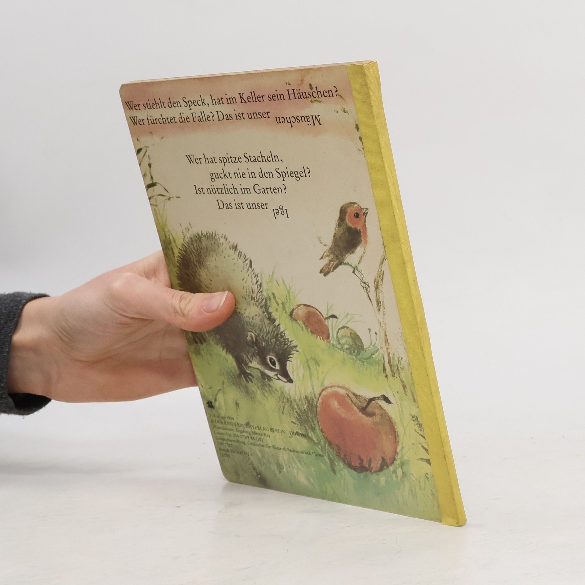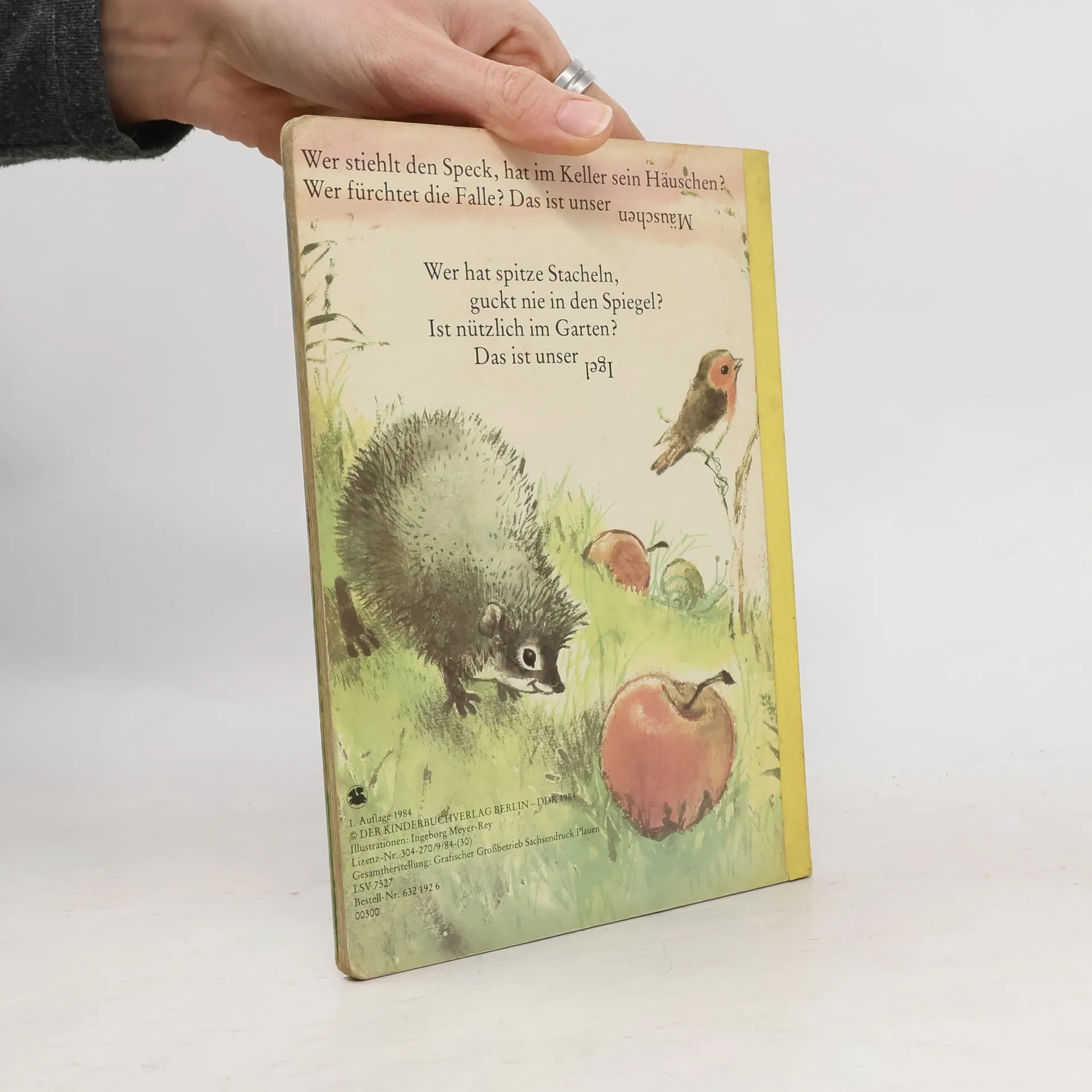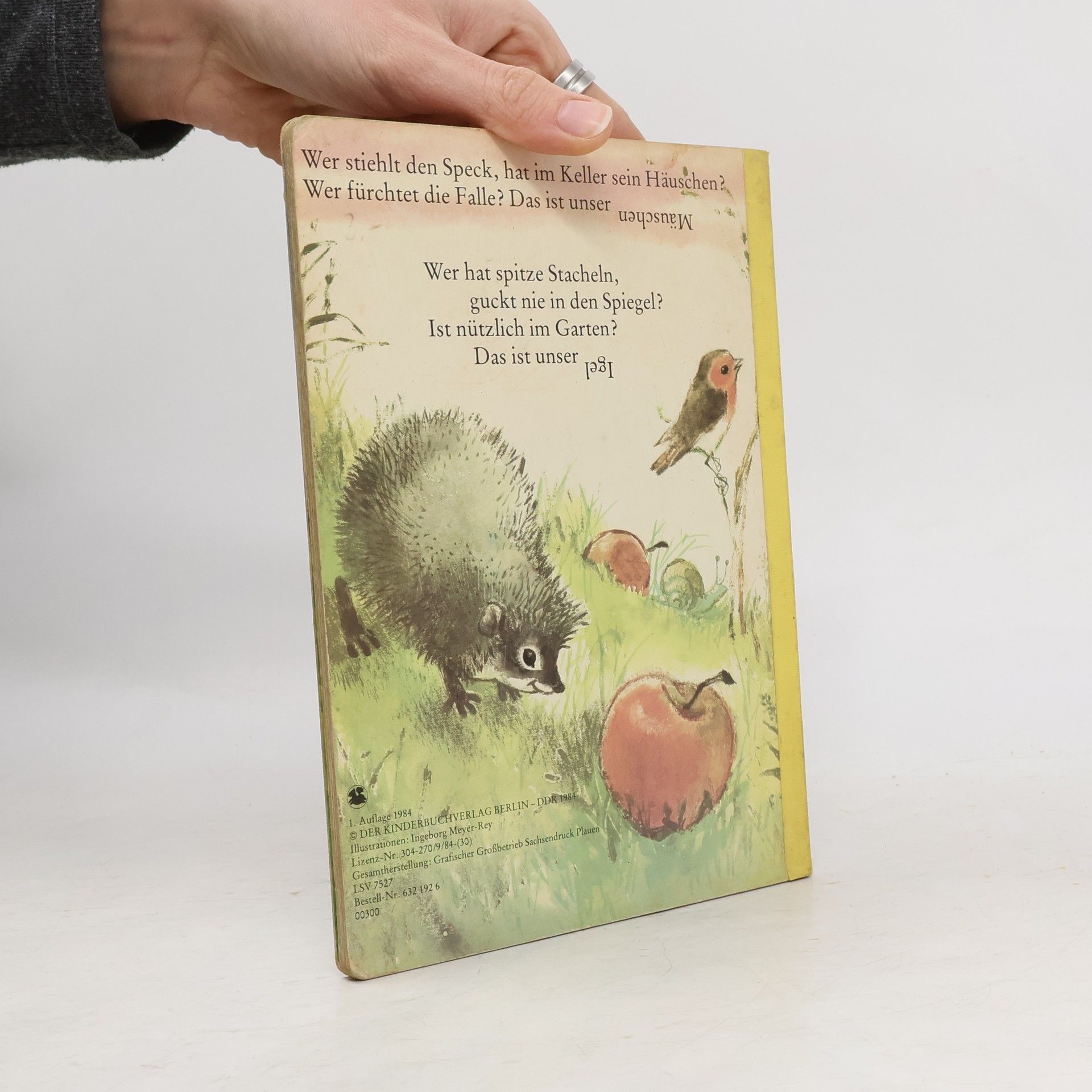 „Wer stiehlt den Speck, hat im Keller sein Häuschen? Wer fürchtet die Falle? Das ist unser.“ Hund und Hase, Igel und Mäuschen, Fuchs und Pferd: In kleinen Rätsel-Versen erzählt Fred Rodrian von den bekanntesten Tieren im Haus, auf dem Hof und im Wald. Wer errät, um welches Tier es sich handelt? Dieses von Ingeborg Meyer-Rey liebevoll illustrierte Pappbilderbuch erschien erstmals 1984 und wurde immer wieder neu aufgelegt.