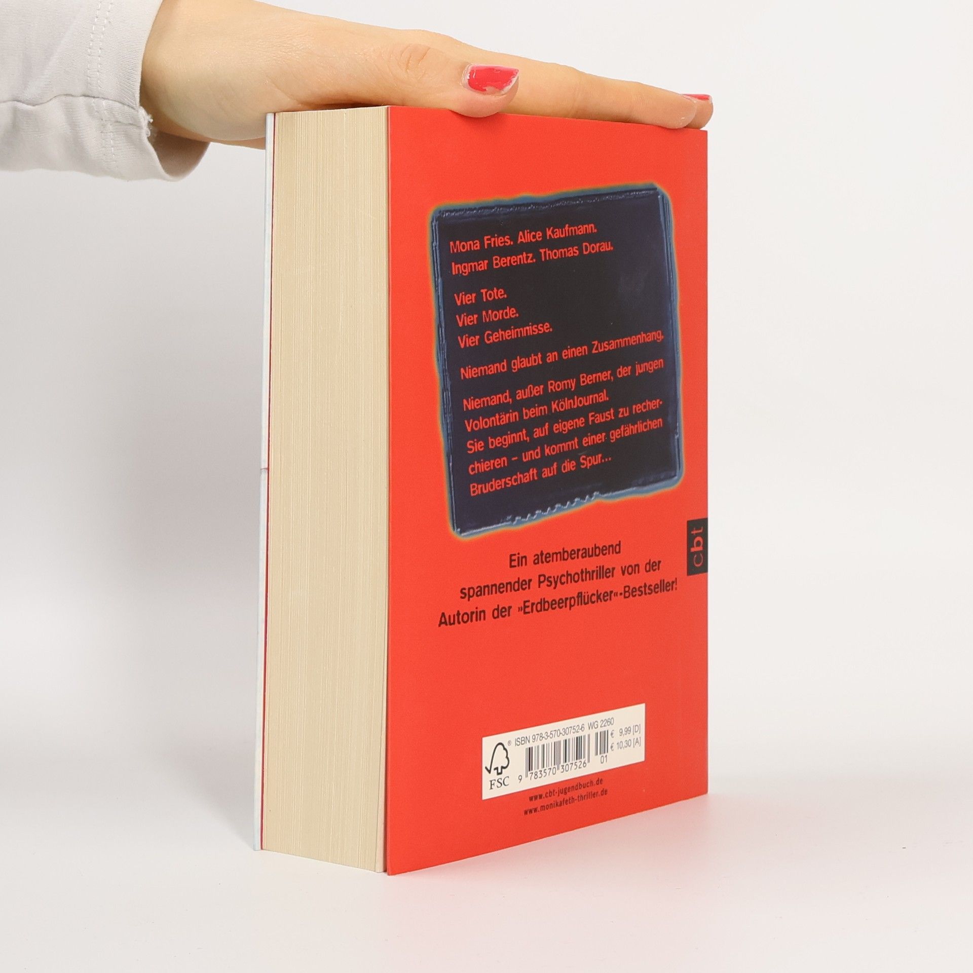 Psychothriller der Extraklasse Mona Fries. Alice Kaufmann. Ingmar Berentz. Thomas Dorau. Vier Tote. Vier Morde. Vier Geheimnisse. Niemand glaubt an einen Zusammenhang. Niemand, außer Romy Berner, der jungen Volontärin beim KölnJournal. Sie beginnt, auf eigene Faust zu recherchieren – und kommt einer gefährlichen Bruderschaft auf die Spur…