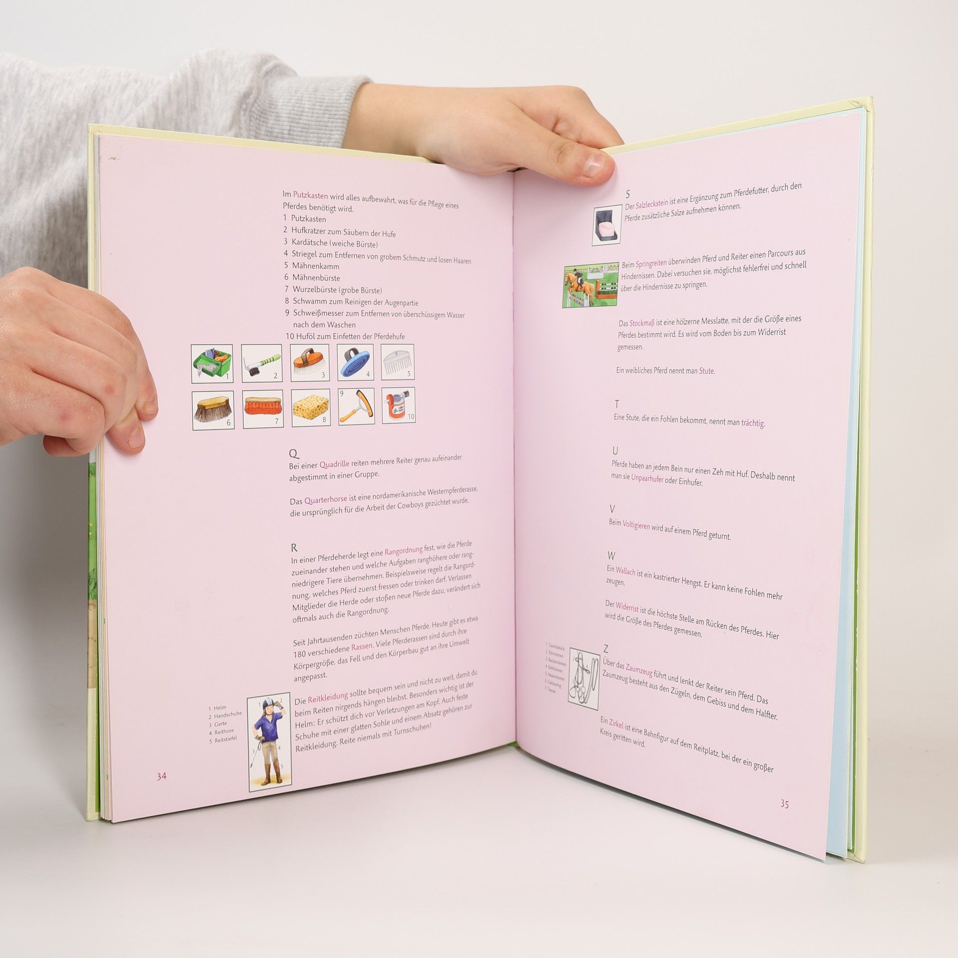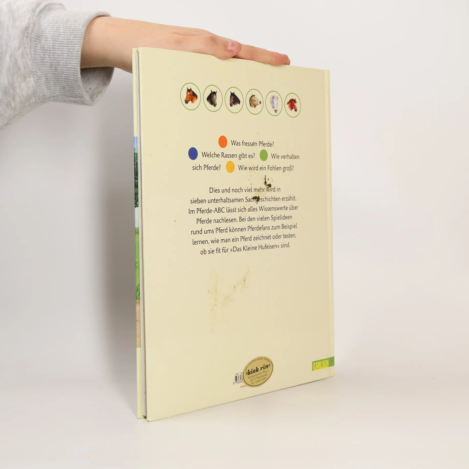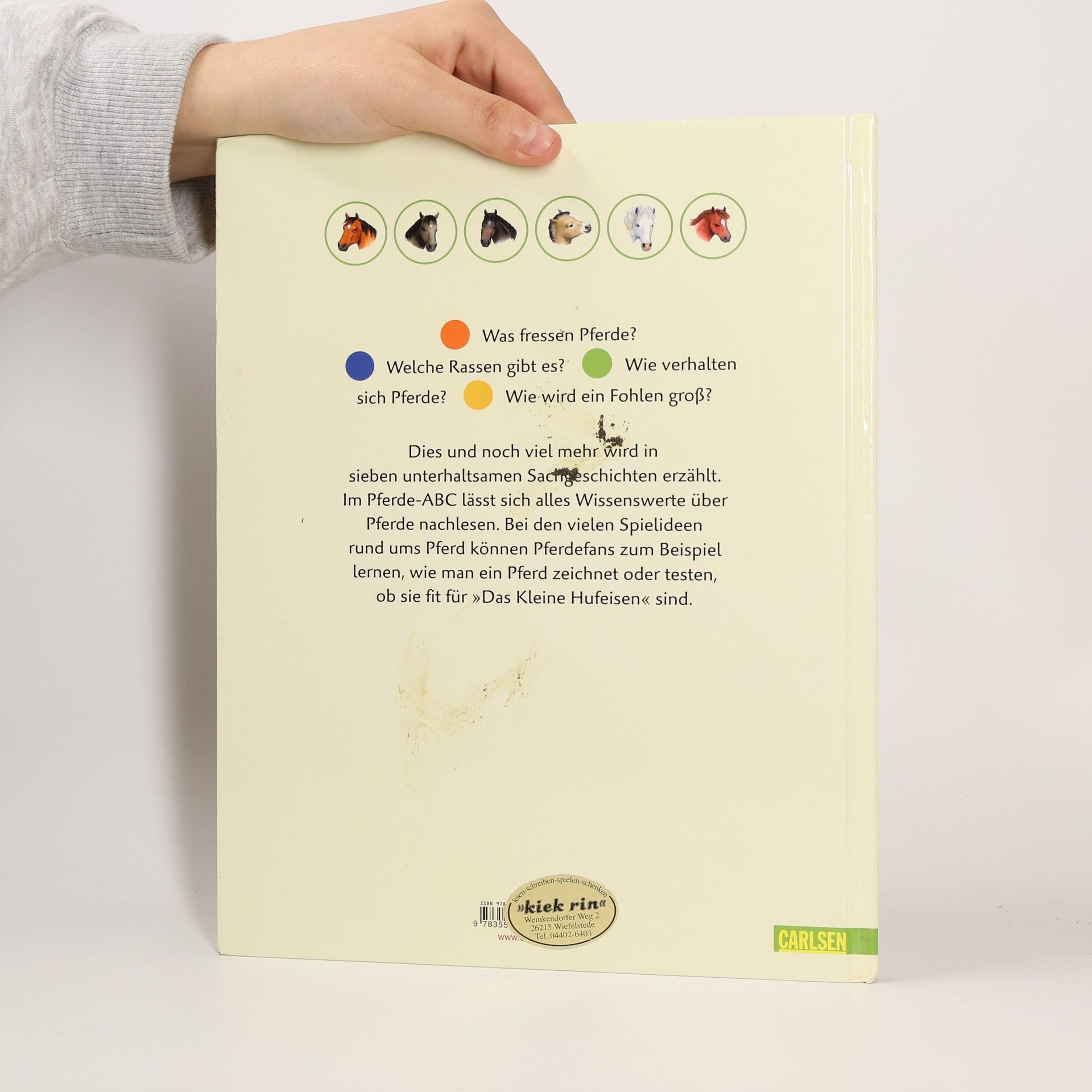 In 7 unterhaltsamen Pferdegeschichten erfahren pferdebegeisterte Jungen und Mädchen alles über ihre großen Freunde. Was sie fressen, welche Rassen es gibt, wie sich Pferde verhalten, wie ein Fohlen groß wird und vieles mehr. Im Pferde-ABC lässt sich alles Wissenswerte über Pferde nachlesen. Bei den vielen Spielideen rund ums Pferd können Pferdefans zum Beispiel lernen, wie man ein Pferd zeichnet oder testen, ob sie fit für „Das kleine Hufeisen“ sind.