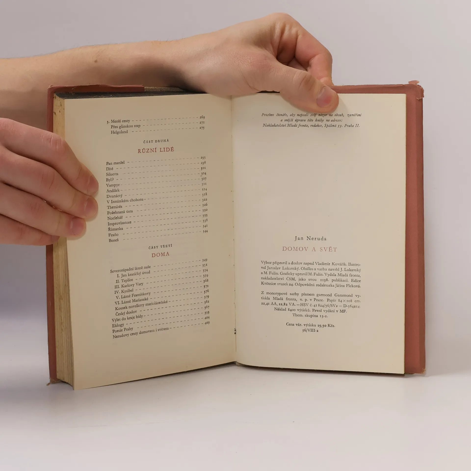 Ve svazku jsou otištěny fejetony a črty, zachycující dojmy a postřehy z Nerudova putování po Čechách a po Evropě. Z první Nerudovy zahraniční cesty jsou vytěženy "Pařížské obrázky", v nichž 29letý básník seznamoval české čtenáře se"starobylou a věčně novou, prokletou i žehnanou ... Paříží". Literárním výtěžkem pozdější a zároveň nejdelší Nerudovy cesty (z r. 1870), jejímž cílem byla starobylá kulturní města evropského jihu avýchodu(Cařihrad,Athény,Jerusalem, Kahira, Neapol, Řím, Benátky), jsou "Obrazy z ciziny" a "Různí lidé". Mistrovsky kreslené obrazy krajin a měst, moří, hor a řek i obrazy z kulturních dějin lidstva jsou doplněny záběry tragikomických příběhů,jejichž hrdiny jsou básníkovi spolucestující - světoběžní lidé rozličných osudů a charakterů. - V "Menších cestách" jsou vylíčeny básnikovy návštěvy Německa, severních přístavů a Helgolandu. - Dokladem toho, jak Neruda dovedl objevovat skryté krásy i v zdánlivě chudém domově, jsou "Eklogy" ze Šumavy a z Pošumaví, "Výlet do kraje bídy" z Hořovicka a "Poesie Prahy".
