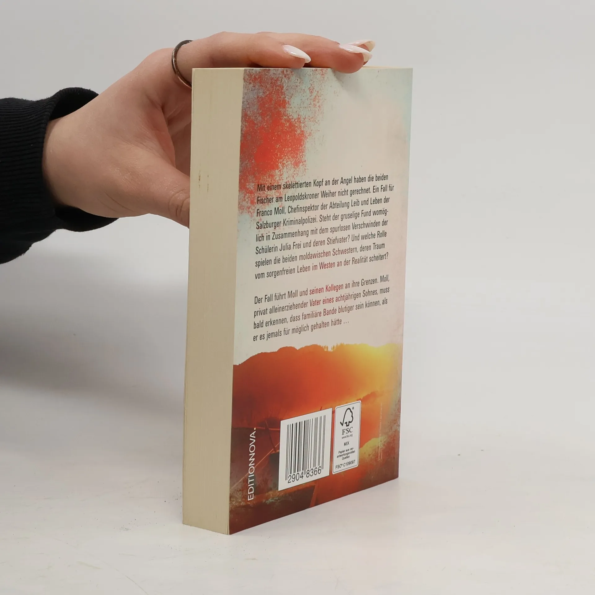 Mit einem skelettierten Kopf an der Angel haben die beiden Fischer am Leopoldskroner Weiher nicht gerechnet. Aber niemandem scheint der Kopf zu fehlen. Ein Fall für Franco Moll, Chefinspektor in der Abteilung „Leib und Leben“ der Salzburger Kriminalpolizei. Der alleinerziehende Vater kämpft nebenberuflich mit seinem 8-jährigen Sohn Felix und einem Karpfen in der Badewanne. Zur selben Zeit sucht eine Osteuropäerin verzweifelt nach ihrer ver missten Schwester und einer Möglichkeit, als Illegale zu überleben. Molls Kripo-Kollege Oberhollenzer kämpft derweil mit anderen Sorgen und opfert seinen Humor einer Krautsuppendiät. Der frischgebackene Jäger erwacht erst aus seiner Melancholie, als ein Wildschwein ein Leichenteil aus der Erde wühlt.