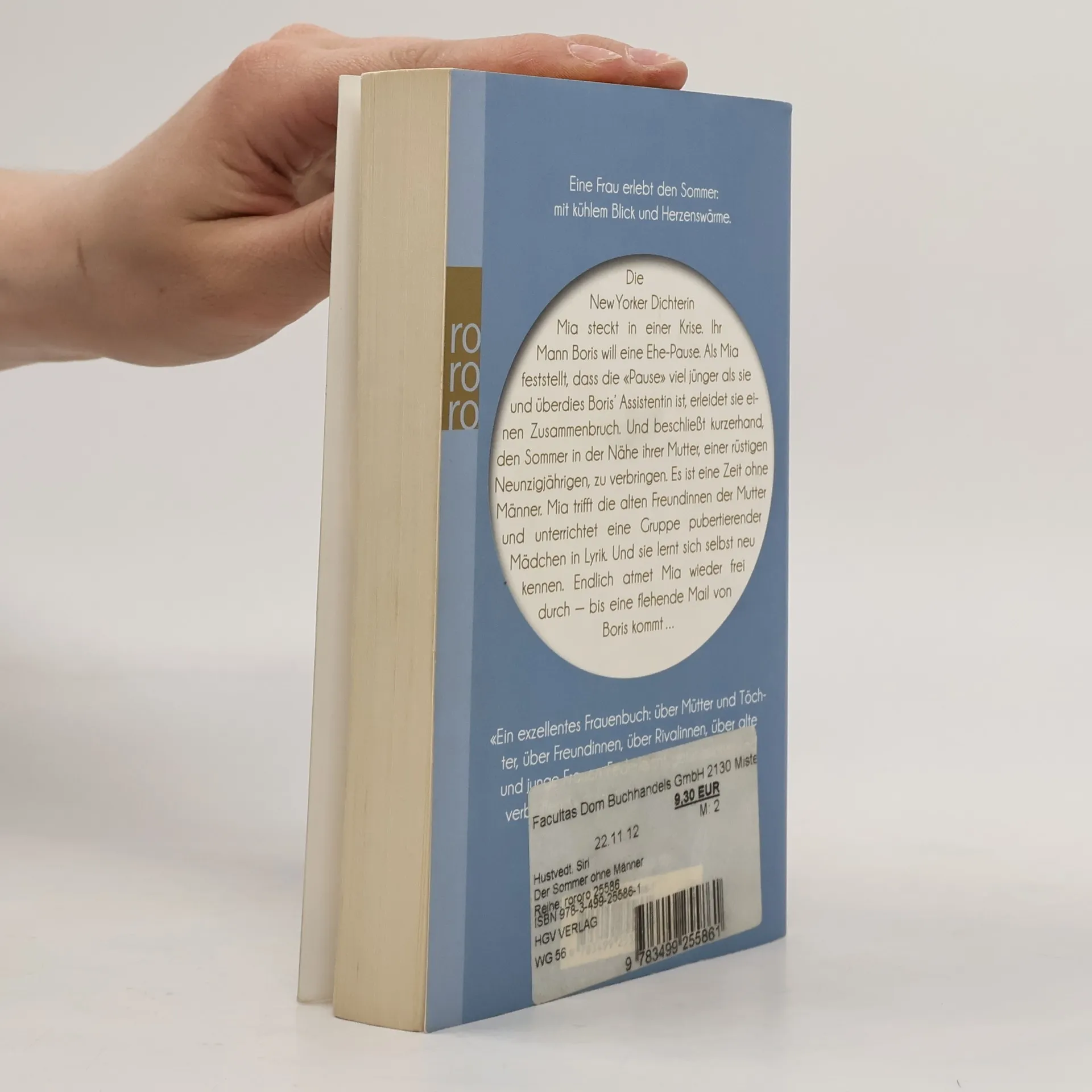 Eine Frau erlebt den Sommer: mit kühlem Blick und Herzenswärme. Die New Yorker Dichterin Mia steckt in einer Krise. Ihr Mann Boris will eine Ehe-Pause. Als Mia feststellt, dass die «Pause» viel jünger als sie und überdies Boris’ Assistentin ist, erleidet sie einen Zusammenbruch. Und beschließt kurzerhand, den Sommer in der Nähe ihrer Mutter, einer rüstigen Neunzigjährigen, zu verbringen. Es ist eine Zeit ohne Männer. Mia trifft die alten Freundinnen der Mutter und unterrichtet eine Gruppe pubertierender Mädchen in Lyrik. Und sie lernt sich selbst neu kennen. Endlich atmet Mia wieder frei durch — bis eine flehende Mail von Boris kommt ...