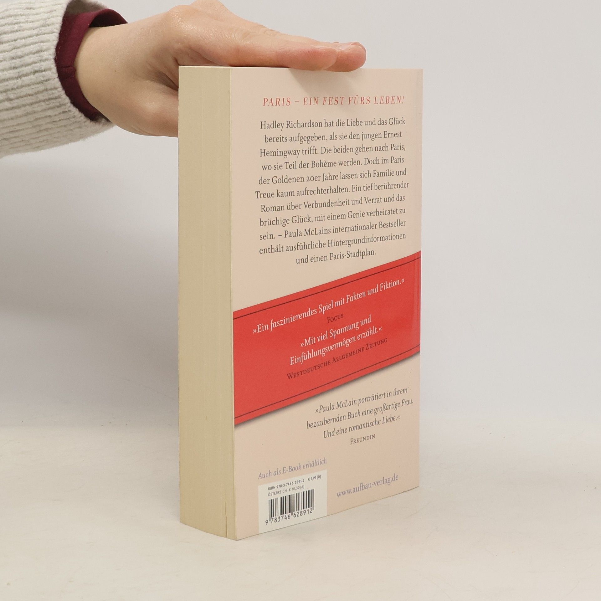Paris – ein Fest fürs Leben! Chicago 1920: Hadley Richardson, eine ruhige junge Frau von achtundzwanzig Jahren, hat Liebe und Glück bereits aufgegeben, als sie auf Ernest Hemingway trifft und sofort von seinem guten Aussehen, seiner Gefühlstiefe und seiner Fähigkeit, mit Worten zu verführen, gefangengenommen wird. Nach einer turbulenten Zeit gegenseitigen Umwerbens heiraten die beiden und lassen sich in Paris nieder, wo sie Teil einer schillernden Gruppe Amerikaner werden, unter ihnen Gertrude Stein, Ezra Pound, F. Scott und Zelda Fitzgerald. Doch das Paris der goldenen Zwanziger – fiebrig, glamourös, verwegen und noch vom Ersten Weltkrieg traumatisiert – ist mit den traditionellen Vorstellungen von Familie und Treue unvereinbar. Während Hadley, inzwischen Mutter geworden, mit Eifersucht und Selbstzweifeln ringt und Ernests unermüdliche literarische Anstrengungen allmählich Früchte zu tragen beginnen, sieht sich das Paar mit einer Enttäuschung konfrontiert, die das Ende all dessen bedeuten könnte, was es in Paris gemeinsam erträumt hatte. Paula McLains internationaler Bestseller enthält ausführliche Hintergrundinformationen und einen Paris-Stadtplan. „Ein faszinierendes Spiel mit Fakten und Fiktion.“ Fokus „Mit viel Spannung und Einfühlungsvermögen erzählt.“ Westdeutsche Allgemeine Zeitung „Paula McLain porträtiert in ihrem bezaubernden Buch eine großartige Frau. Und eine romantische Liebe.“ Freundin