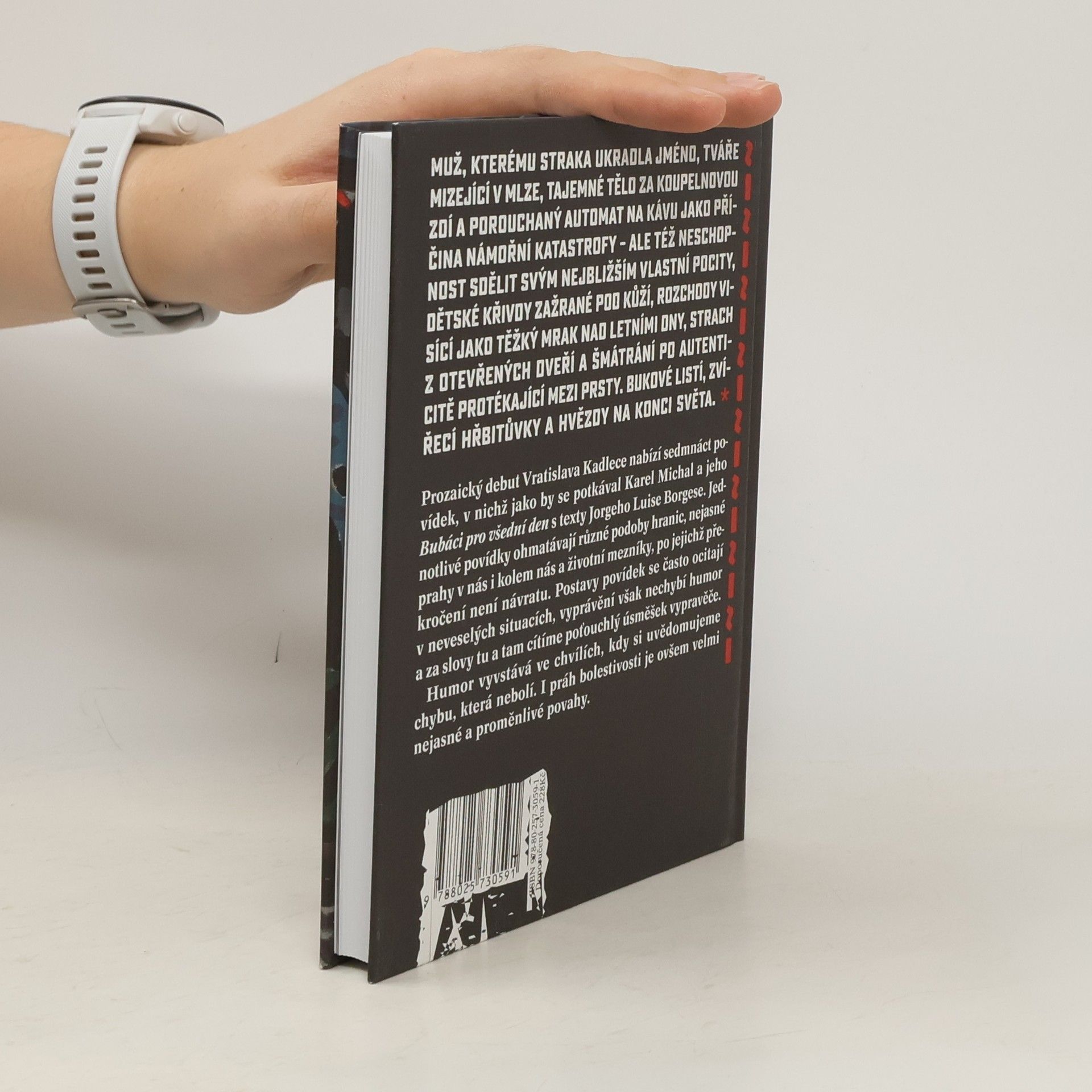 Muž, kterému straka ukradla jméno, tváře mizející v mlze, tajemné tělo za koupelnovou zdí a porouchaný automat na kávu jako příčina námořní katastrofy – ale též neschopnost sdělit svým nejbližším vlastní pocity, dětské křivdy zažrané pod kůží, rozchody visící jako těžký mrak nad letními dny, strach z otevřených dveří a šmátrání po autenticitě protékající mezi prsty. Bukové listí, zvířecí hřbitůvky a hvězdy na konci světa. Prozaický debut Vratislava Kadlece nabízí sedmnáct povídek různé délky a rozmanité formy, v nichž jako by se potkával Karel Michal a jeho Bubáci pro všední den s texty Jorge Luise Borgese. Jednotlivé povídky ohmatávají různé podoby hranic, nejasné prahy v nás i kolem nás a životní mezníky, po jejichž překročení není návratu. Postavy povídek se často ocitají v neveselých situacích, vyprávění však nechybí místy potemnělý, jindy zas jasnější humor. Humor vyvstává ve chvílích, kdy si uvědomujeme chybu, která – řečeno s Aristotelem – nebolí. I práh bolestivosti je ovšem velmi nejasné a proměnlivé povahy.