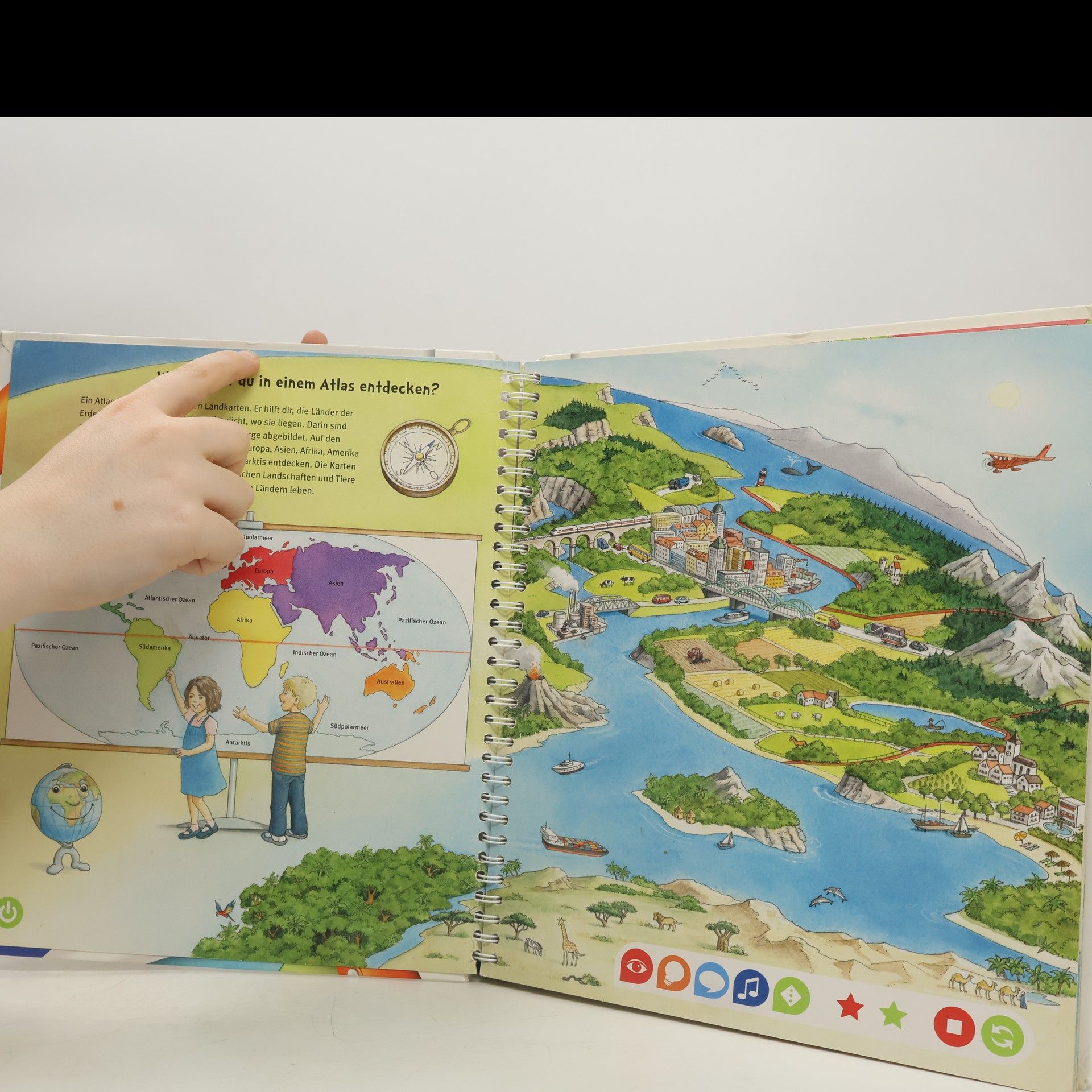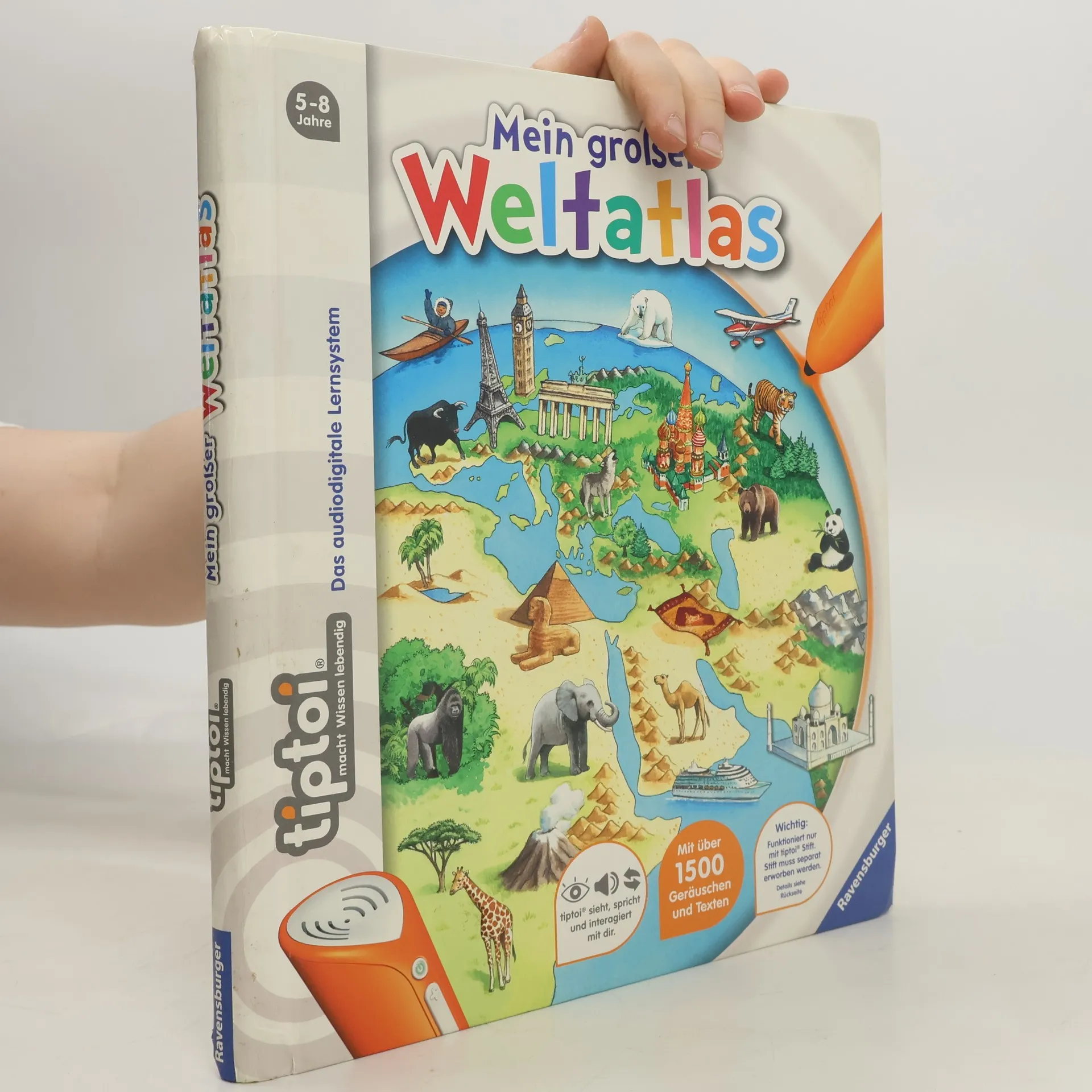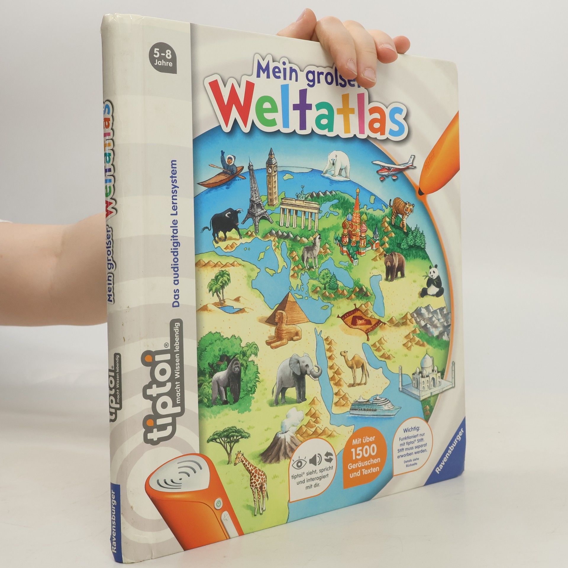 Mit tiptoi auf Weltreise Ferne Länder und Meere, Tiere und Landschaften. Wo liegt Europa? Was isst man in Asien? Wo leben die giftigsten Tiere? Kontinent für Kontinent wird im Detail vorgestellt. Exotische Tiere, fremde Sprachen, berühmte Bauwerke, landestypische Melodien und vieles mehr können entdeckt und erlebt werden. Außerdem wird auch das Kartenlesen vermittelt. So können die Kinder mit dem tiptoi-Stift selbstständig auf eine interaktive Weltreise gehen. Mein großer Weltatlas bietet Sachwissen auf Augenhöhe. Die Kinder können sich dank der einfachen und intuitiven Nutzung mit dem tiptoi-Stift das Wissen selbst erschließen. Geschichten, Lieder und Spiele laden dabei immer wieder zum selbstständigen Entdecken und Erforschen ein.