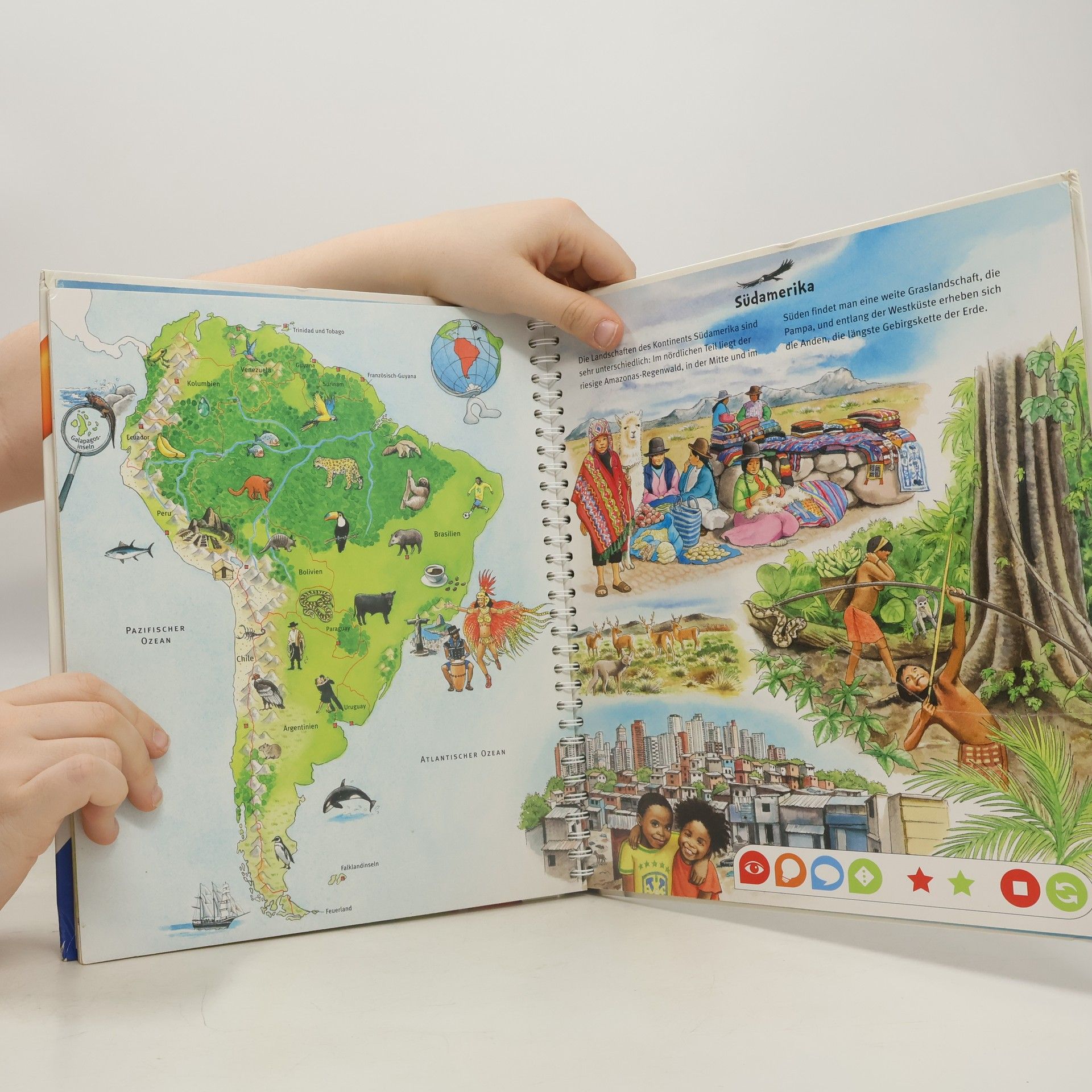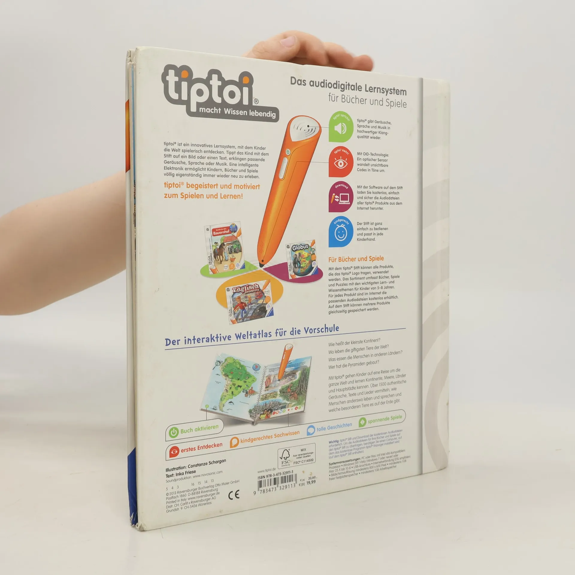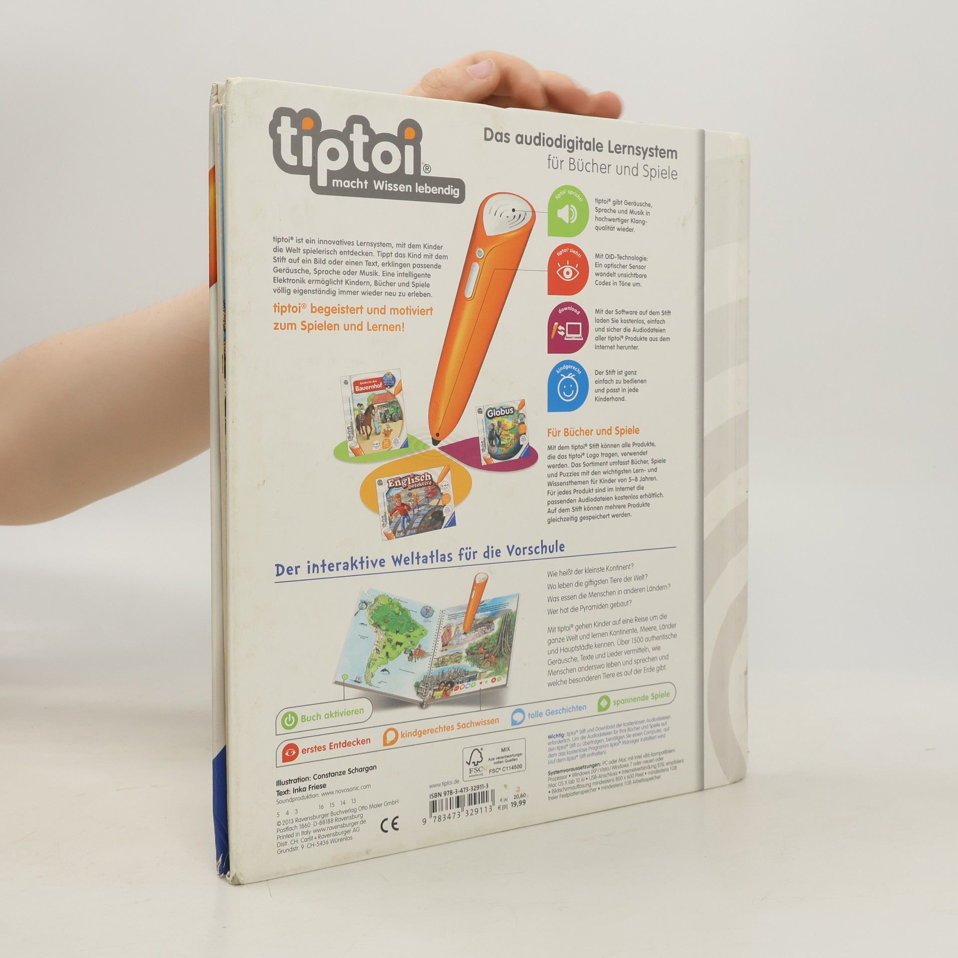 Mit tiptoi auf Weltreise Ferne Länder und Meere, Tiere und Landschaften. Wo liegt Europa? Was isst man in Asien? Wo leben die giftigsten Tiere? Kontinent für Kontinent wird im Detail vorgestellt. Exotische Tiere, fremde Sprachen, berühmte Bauwerke, landestypische Melodien und vieles mehr können entdeckt und erlebt werden. Außerdem wird auch das Kartenlesen vermittelt. So können die Kinder mit dem tiptoi-Stift selbstständig auf eine interaktive Weltreise gehen. Mein großer Weltatlas bietet Sachwissen auf Augenhöhe. Die Kinder können sich dank der einfachen und intuitiven Nutzung mit dem tiptoi-Stift das Wissen selbst erschließen. Geschichten, Lieder und Spiele laden dabei immer wieder zum selbstständigen Entdecken und Erforschen ein.