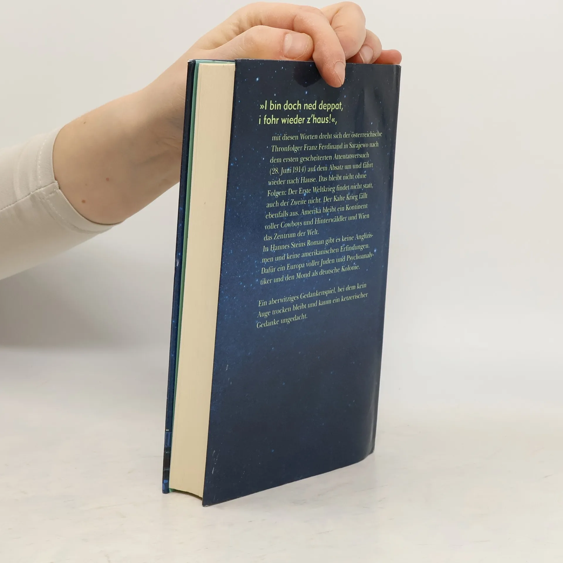 Der Erste Weltkrieg hat nicht stattgefunden, und Amerika ist ein Kontinent der Hinterwäldler. In dieser Welt gibt es keine Anglizismen, keine amerikanischen Erfindungen und keinen Krieg, sondern ein Europa voller Juden, den Mond als deutsche Kolonie und Wien als Zentrum der Welt. Der Schlüsselsatz „I bin doch ned deppat, i fohr wieder z'haus“ wird vom österreichischen Thronfolger Franz Ferdinand am 28. Juni 1914 in Sarajewo geäußert, als ein Attentäter versucht, ihn zu töten. Ohne den Ersten Weltkrieg gibt es auch keinen Zweiten oder Kalten Krieg, keine Entkolonialisierung und keine Konflikte mit dem Islam. Die europäischen Staaten wahren ihre komplizierte Machtbalance, und ein augusteischer Frieden herrscht. Amerika bleibt ein rückständiger Kontinent, während Europa von Monarchen regiert wird. Das k.u.k.-Reich mit Wien als Hauptstadt ist der Nabel der Welt. In dieser Szenerie entwickelt sich die Geschichte des jungen Protagonisten Alexej, der eine Liaison mit einer Gesellschaftsdame eingeht, deren Mann auf dem Mond weilt – einer deutschen Kolonie, wo er als k.u.k.-Hofastronom arbeitet. Dramatische Nachrichten von dort kündigen an, dass ein Komet auf Kollisionskurs zur Erde ist und in wenigen Monaten einschlagen soll.