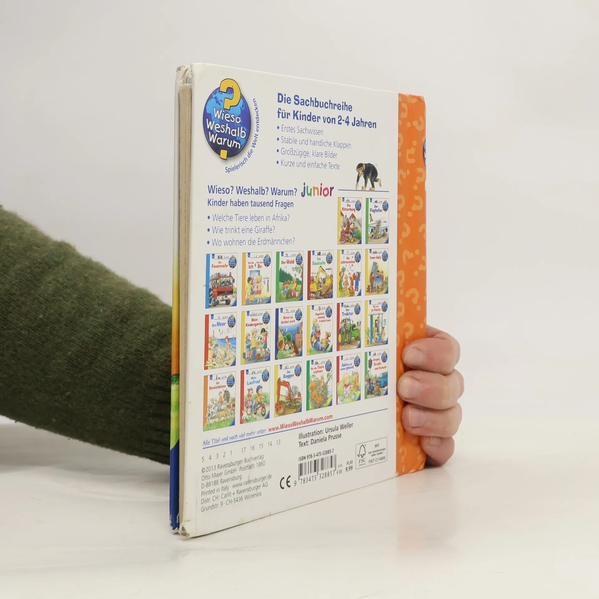 In diesem Buch ist tierisch was los: Wie trinkt eine Giraffe? Was kann der Elefant alles mit seinem Rüssel anstellen? Wie spielen Affen- und Löwenkinder? Und wo wohnen die Erdmännchen? Dank lustiger Klappen tauchen Kinder in die afrikanische Wildnis ein. Dabei beobachten sie ihre Lieblingstiere, die sie sonst nur aus dem Zoo kennen, in ihrem heimischen Lebensraum beim Fressen, Baden und Spielen. Ein lustiges Tier-Suchspiel verrät den Kindern zudem, was die Tiere Afrikas bei Nacht machen. Wieso? Weshalb? Warum? junior Die Sachbuchreihe für Kinder von 2–4 Jahren Jeden Tag entdecken Kinder etwas Neues – und haben viele Fragen. Wann kommt die Feuerwehr? Was machen die Tiere im Winter? Warum muss ich Zähne putzen? Die beliebte Sachbuchreihe Wieso? Weshalb? Warum? junior beantwortet die Fragen der Kinder auf Augenhöhe. Sie beleuchtet unterschiedlichste Themen aus ihrer Alltags- und Interessenswelt altersgerecht und mit viel Liebe zum Detail. Die Reihe ist speziell auf kleine Hände und die Bedürfnisse der Kleinsten angepasst. Klare und liebevolle Bilder, kurze Sachtexte sowie handliche Klappen, die Bewegungen veranschaulichen und überraschende und lustige Einblicke gewähren, ermöglichen Kindern, sich ihre Themen selbst zu erschließen. Der Spaß am eigenhändigen Entdecken, die liebevolle Umsetzung und die hochwertige Ausstattung garantieren langanhaltende Freude an jedem Buch.