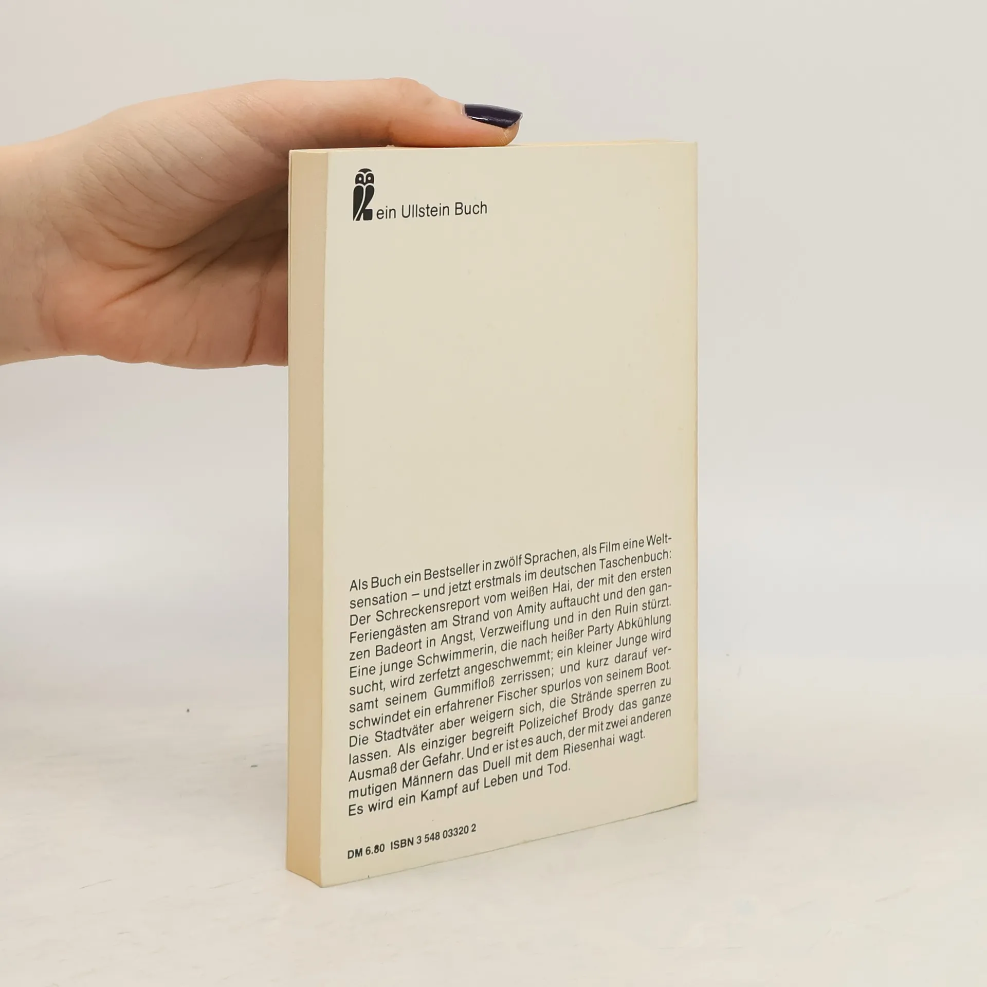 Ein Wundertier von sieben Meter Länge kreuzt wie ein U-Boot vor der schönen friedlichen Küste von Long Island: ein weißer Hai, der die Einwohner des kleinen Touristenbadeortes Amity in Furcht und Schrecken versetzt. Man bekommt den Riesenfisch nicht zu sehen, aber sein erstes Opfer wird zum grausigen Beweis für seine Existenz. Polizeichef Martin Brody erkennt als Einziger die Gefahr, doch er muss dem Druck der ansässigen Geschäftsleute und des Bürgermeisters nachgeben und den Unglücksfall verschweigen. Der Leichtsinn bleibt nicht ohne Folgen … Währenddessen verguckt sich Brodys Ehefrau in den smarten Meeresbiologen Matt Hooper, und Brody hat bald an allen Fronten zu kämpfen, zuletzt Auge um Auge mit dem Hai. Im Frühjahr 2014 feiert der Roman, dessen Verfilmung Filmgeschichte geschrieben hat, sein 40-jähriges Jubiläum.
