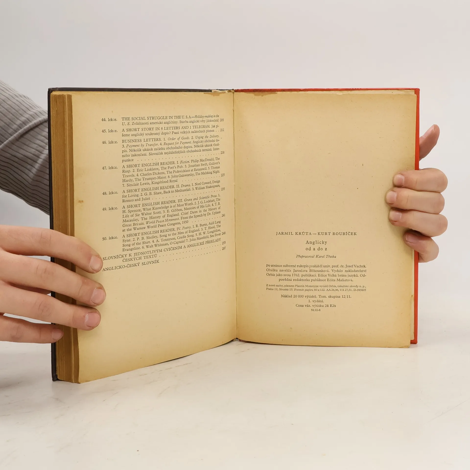 Učebnice angličtiny v padesáti lekcích. Soustavná učebnice probírá v prvých lekcích základy anglické gramatiky a správné výslovnosti, postupně rozšiřuje základní slovní fond, v krátkých i delších konverzacích a ukázkách seznamuje se zvláštnostmi živého,literárního, novinářského i obchodního jazyka a s nejdůležitějším odborným názvoslovím. Je doplněna stručným anglicko-českým slovníkem.