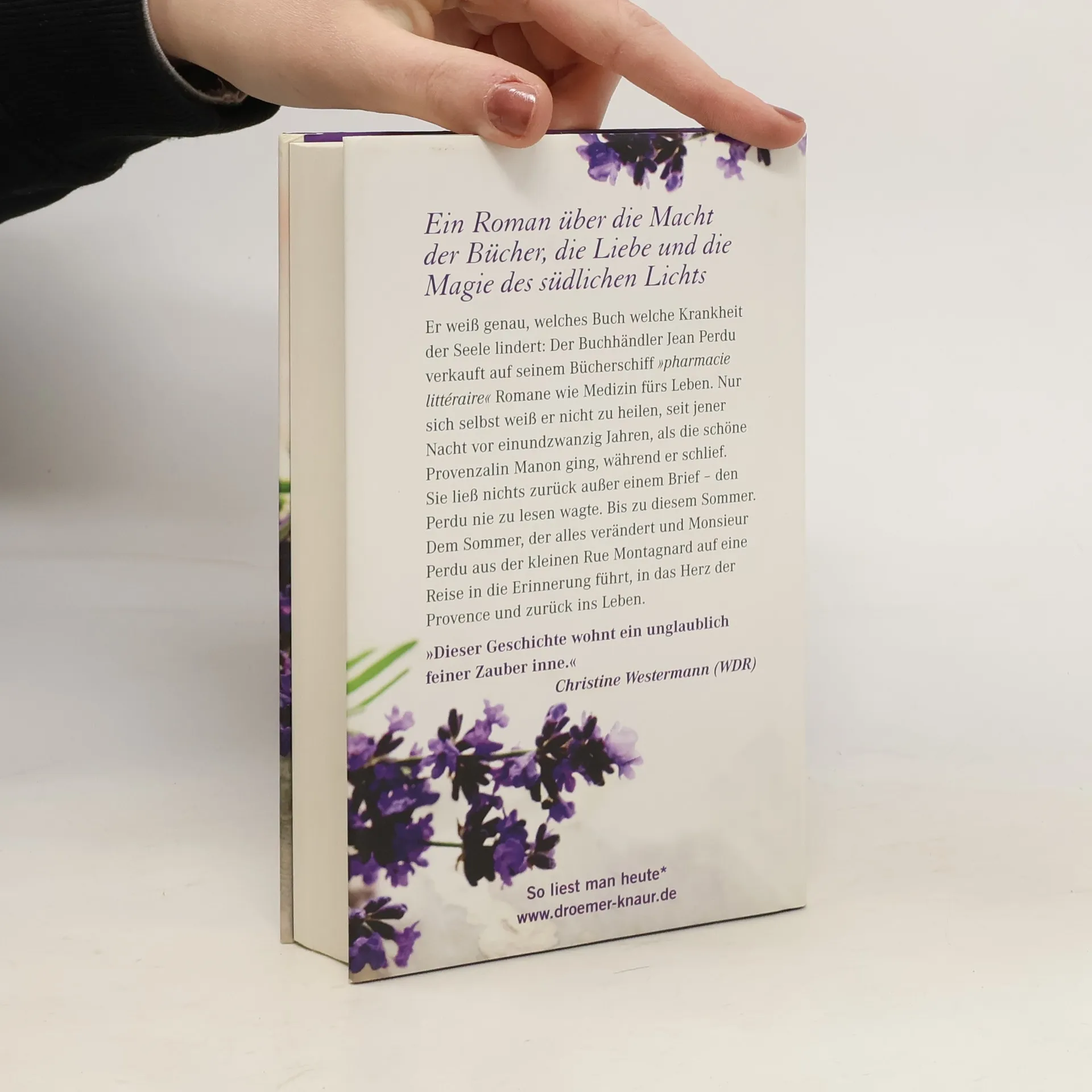 Er weiß genau, welches Buch welche Krankheit der Seele lindert: Auf seinem Bücherschiff, der »literarischen Apotheke«, verkauft der Pariser Buchhändler Jean Perdu Romane wie Medizin fürs Leben. Nur sich selbst weiß er nicht zu heilen, seit jener Nacht vor 21 Jahren, als die schöne Provenzalin Manon ging, während er schlief. Sie ließ nichts zurück außer einem Brief – den Perdu nie zu lesen wagte. Bis zu diesem Sommer. Dem Sommer, der alles verändert und Monsieur Perdu aus der kleinen Rue Montagnard auf eine Reise in die Erinnerung führt, in das Herz der Provence und zurück ins Leben.