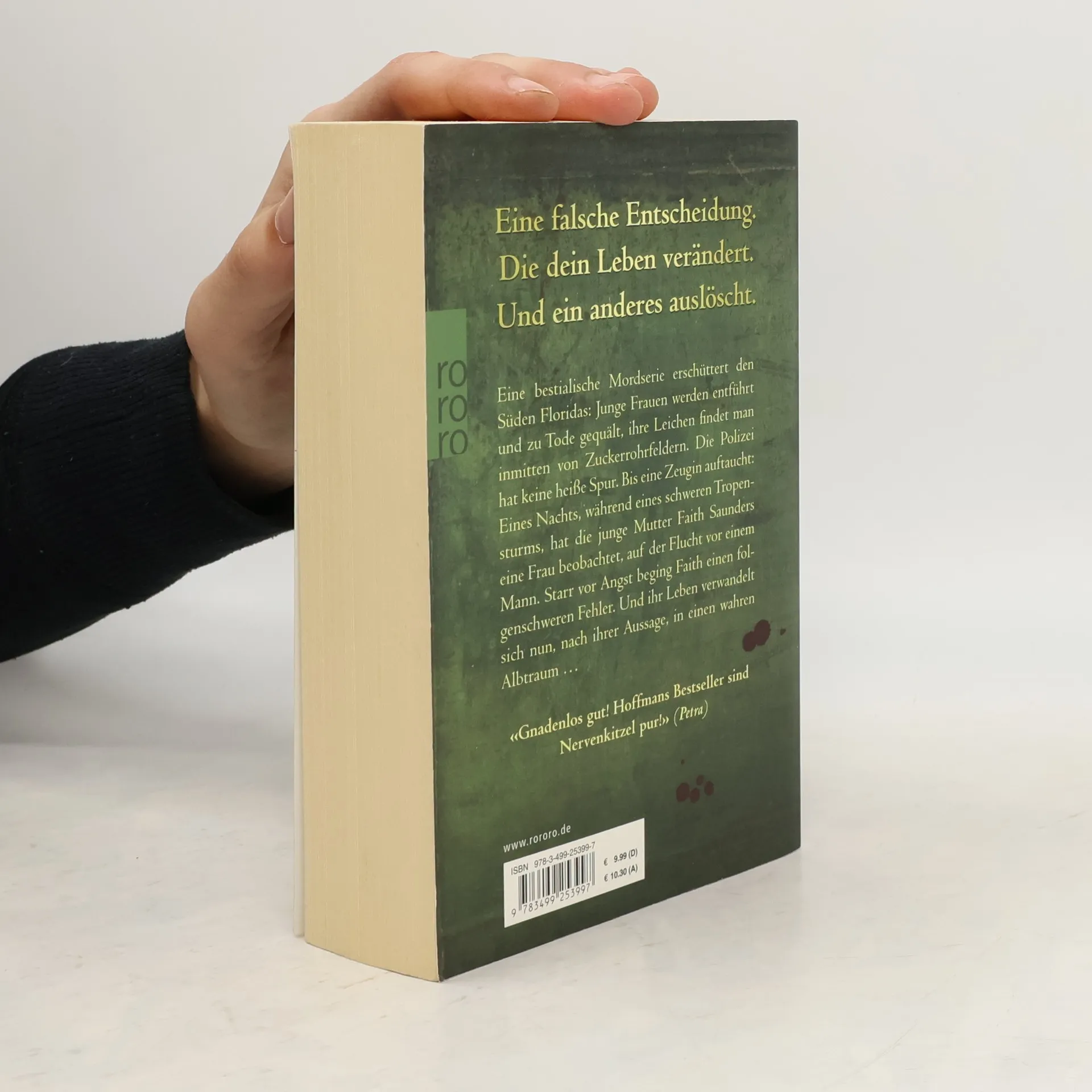 Eine falsche Entscheidung.Die dein Leben verändert.Und ein anderes auslöscht.Eine bestialische Mordserie erschüttert den Süden Floridas: Junge Frauen werden entführt und zu Tode gequält, ihre Leichen findet man inmitten von Zuckerrohrfeldern. Die Polizei hat keine heiße Spur. Bis eine Zeugin auftaucht: Eines Nachts, während eines schweren Tropensturms, hat die junge Mutter Faith Saunders eine Frau beobachtet, auf der Flucht vor einem Mann. Starr vor Angst beging Faith einen folgenschweren Fehler. Und ihr Leben verwandelt sich nun, nach ihrer Aussage, in einen wahren Albtraum …