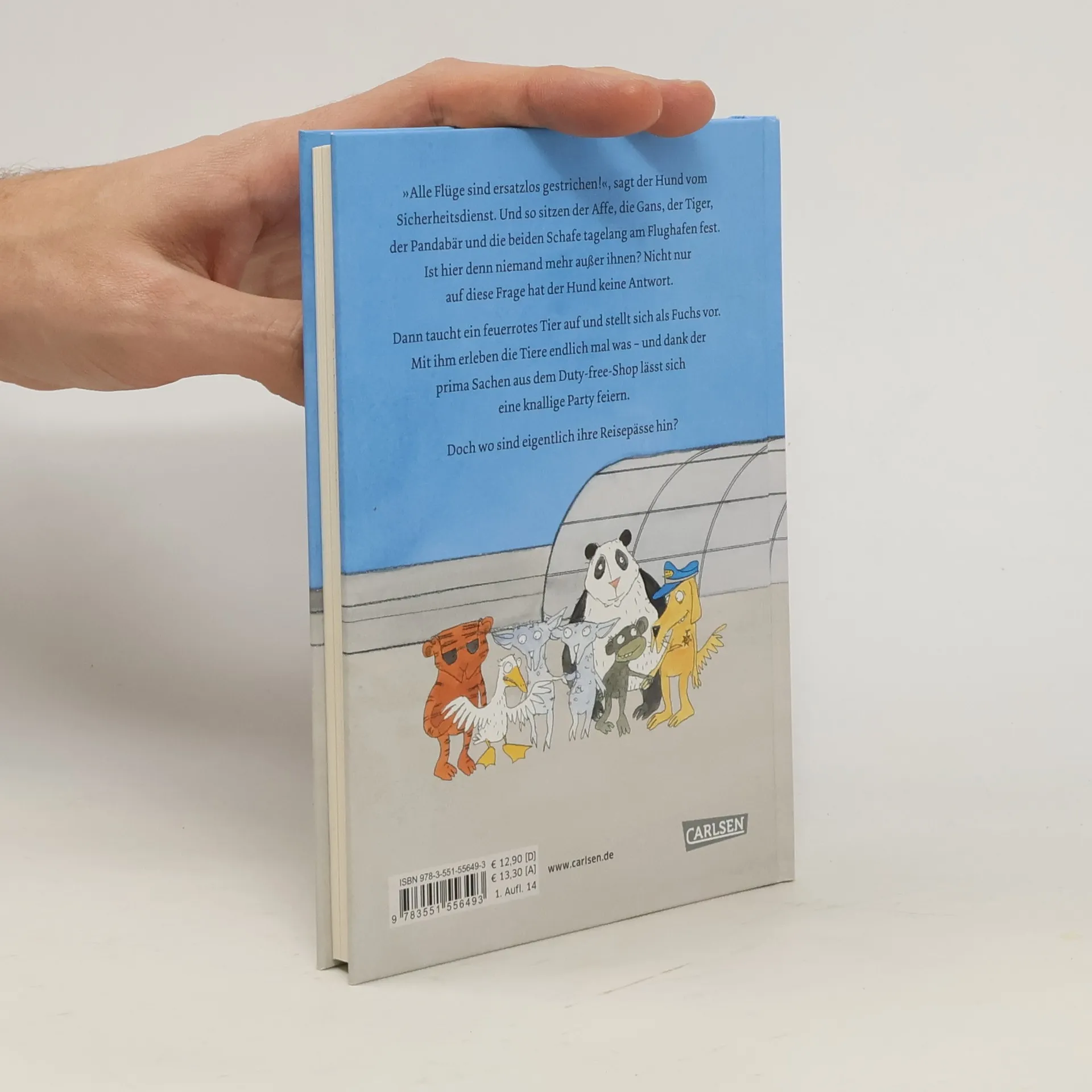 „Alle Flüge sind ersatzlos gestrichen!“, sagt der Hund vom Sicherheitsdienst. Und so sitzen der Panda, der Affe, die Gans, der Tiger und die beiden Schafe am Flughafen fest. Aber wieso ist eigentlich das ganze Gebäude verlassen? Nicht nur auf diese Frage hat der Hund keine Antwort. Dann taucht ein feuerrotes Tier auf und stellt sich als Fuchs vor. Mit ihm erleben die Tiere endlich mal was – und dank all der tollen Sachen aus dem Duty Free Shop lässt sich eine knallige Party feiern. Doch wo sind nur ihre Reisepässe hin?