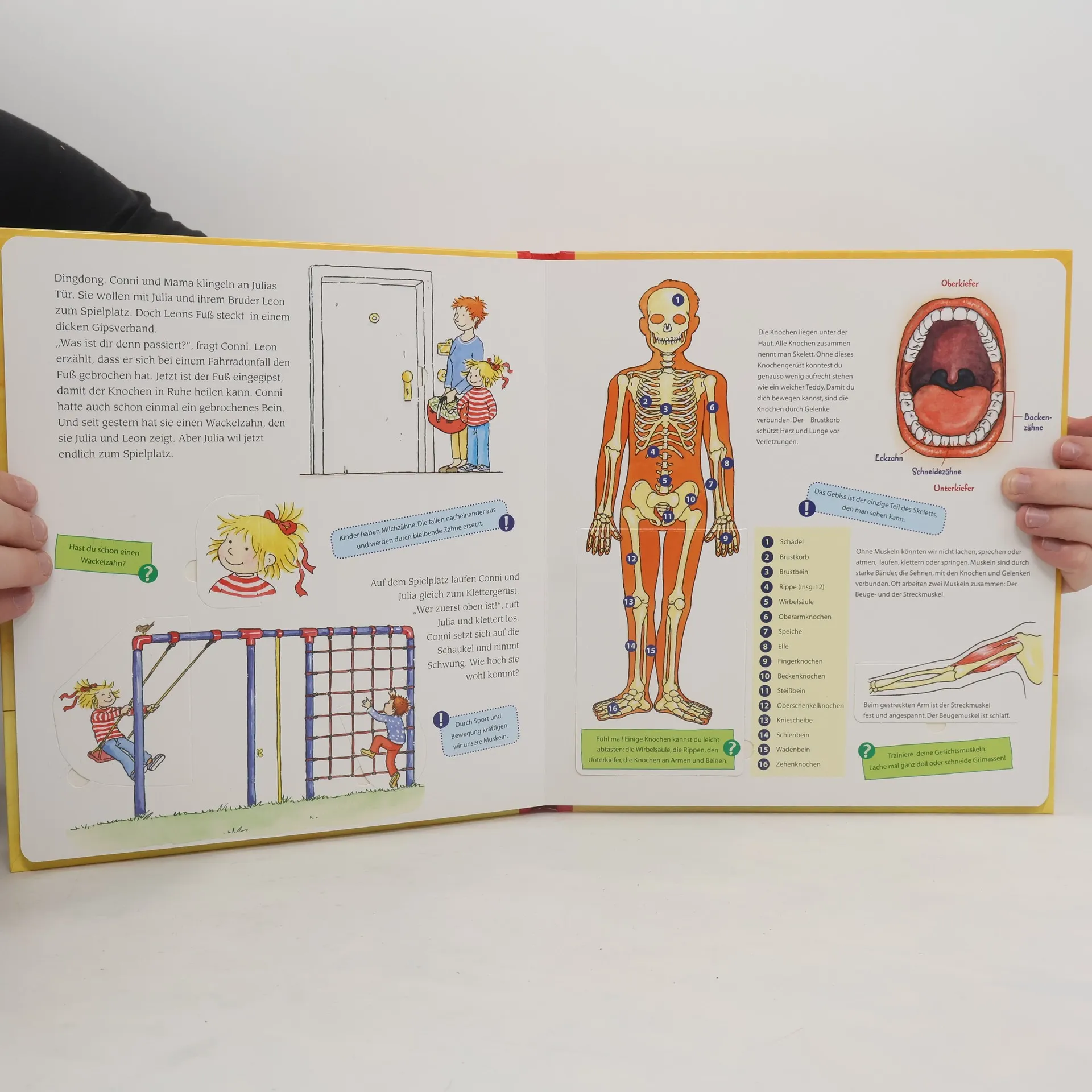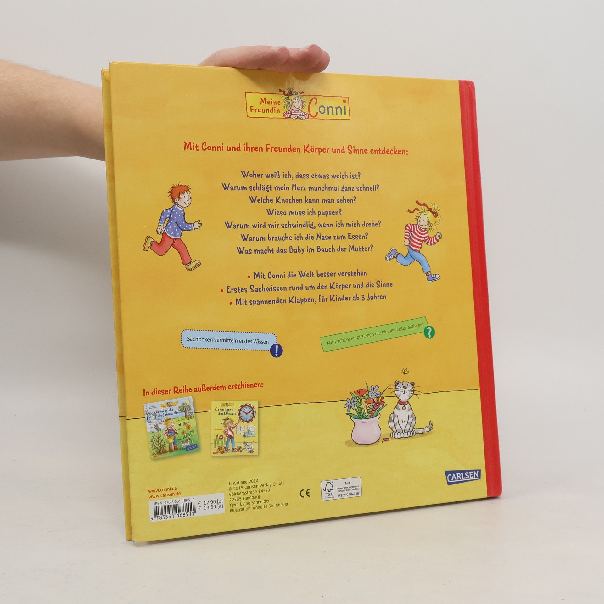 Die Kinder können in diesem reichhaltigen, klar und anschaulich erklärenden Buch mit Conni und ihren Freunden den menschlichen Körper und unsere Sinne entdecken. Kinder haben viele Fragen: Warum schlägt mein Herz manchmal ganz schnell? Welche Knochen kann man sehen? Wieso muss ich pupsen? Warum wird mir schwindlig, wenn ich mich drehe? Warum brauche ich die Nase zum Essen? Was macht das Baby im Bauch der Mutter? Mit über 20 Klappen.
