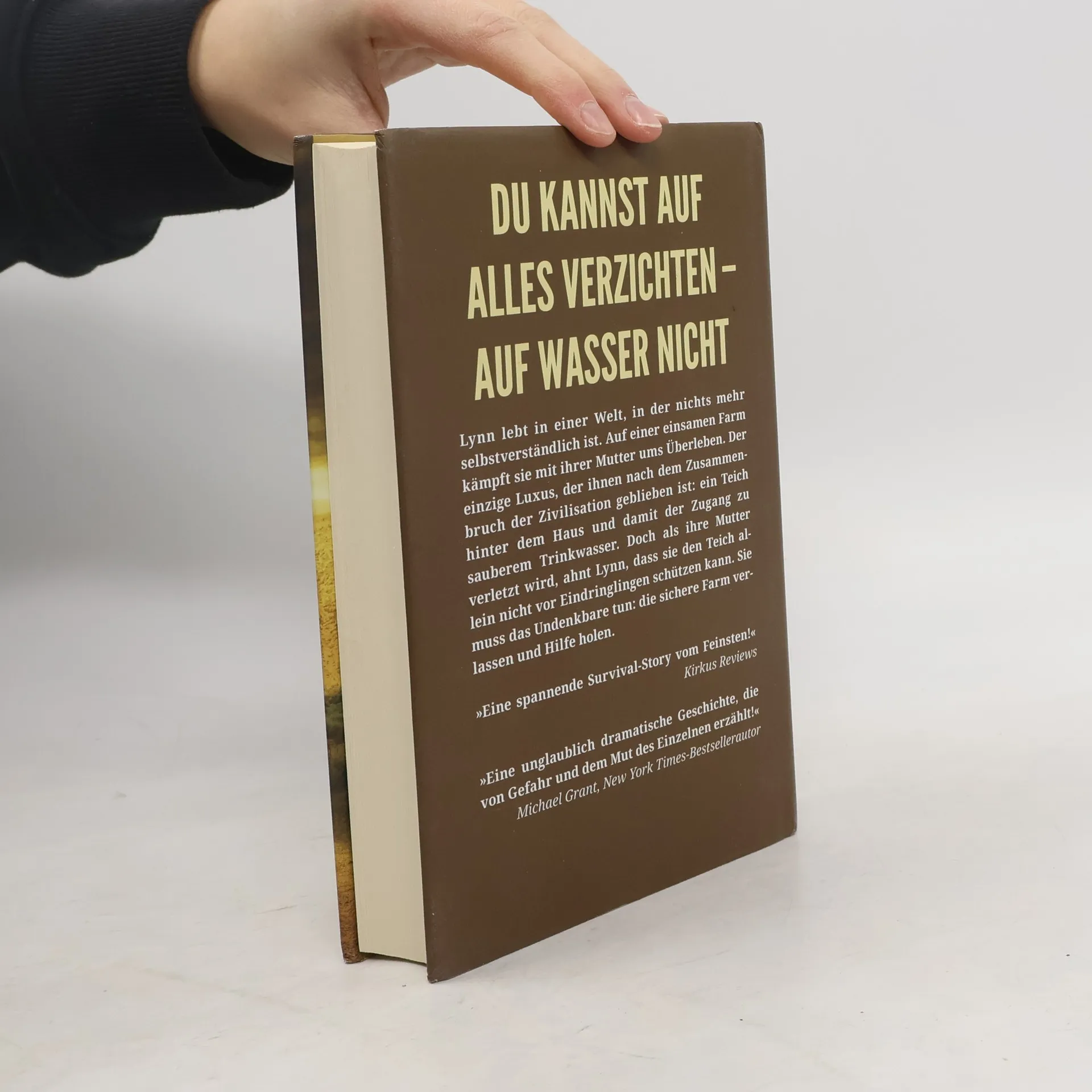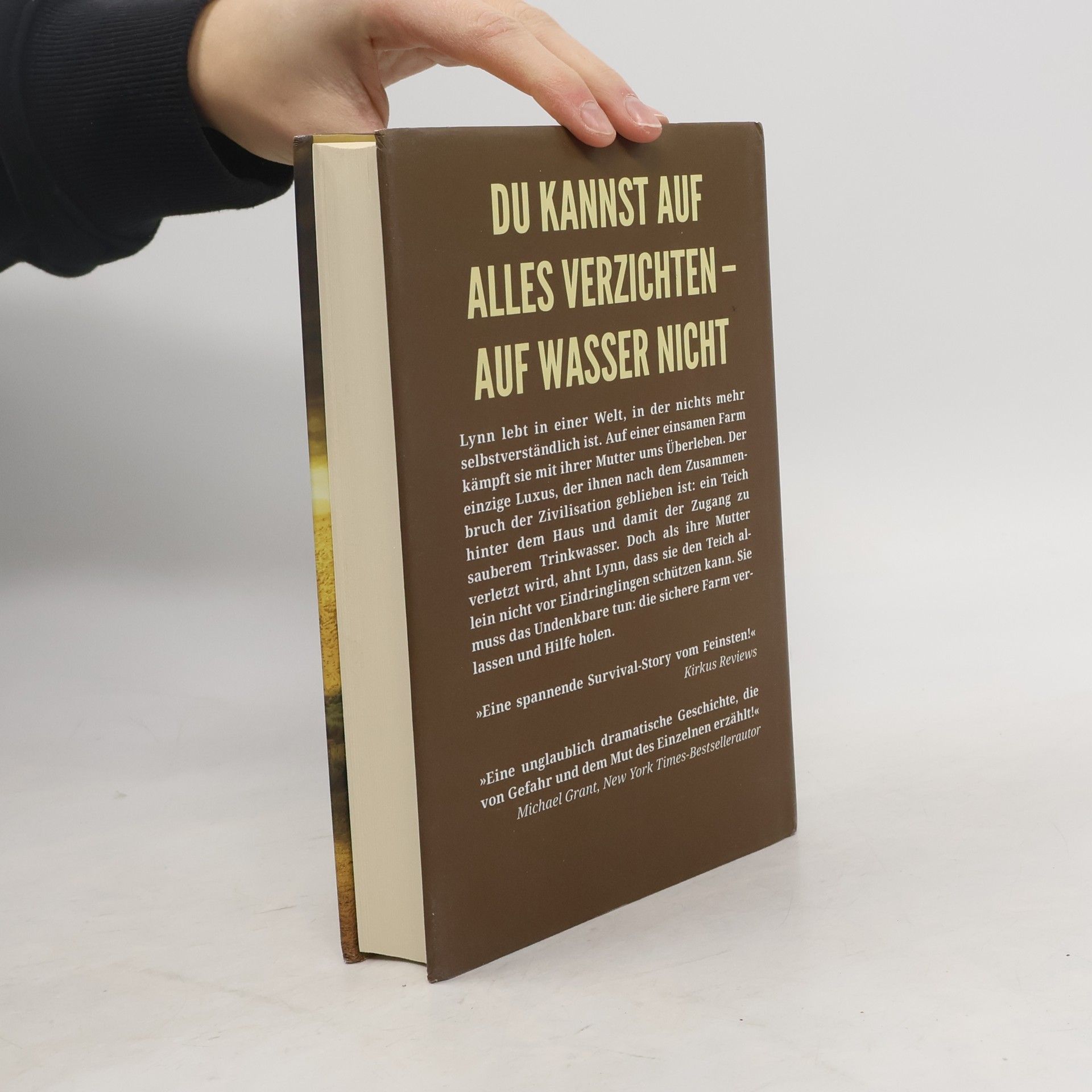 In einer Welt ohne Wasser kann jeder Tag der letzte sein Nach einer Choleraepidemie und dem Zusammenbruch der Zivilisation ist sauberes Wasser das wertvollste Gut. Die sechzehnjährige Lynn hat schon früh gelernt, es um jeden Preis zu verteidigen. Gemeinsam mit ihrer Mutter bewohnt sie ein einsames Farmhaus und verbringt ihre Tage damit, Brennholz und Nahrung zu beschaffen. Und den Teich hinter dem Haus vor durstigen Eindringlingen zu schützen. Als eines Tages ein Fremder auftaucht und Lynn und ihre Mutter Fußspuren um den Teich herum entdecken, wird ihnen sofort klar, dass jemand ihre geheime Quelle entdeckt hat. Der Ernstfall, auf den Lynn seit Jahren vorbereitet ist, scheint einzutreten. Eigentlich hat sie keine Angst. Doch dann wird ihre Mutter von Kojoten schwer verletzt. Und Lynn muss sich in den umliegenden Siedlungen Hilfe suchen, denn allein kann sie die Farm nicht retten.