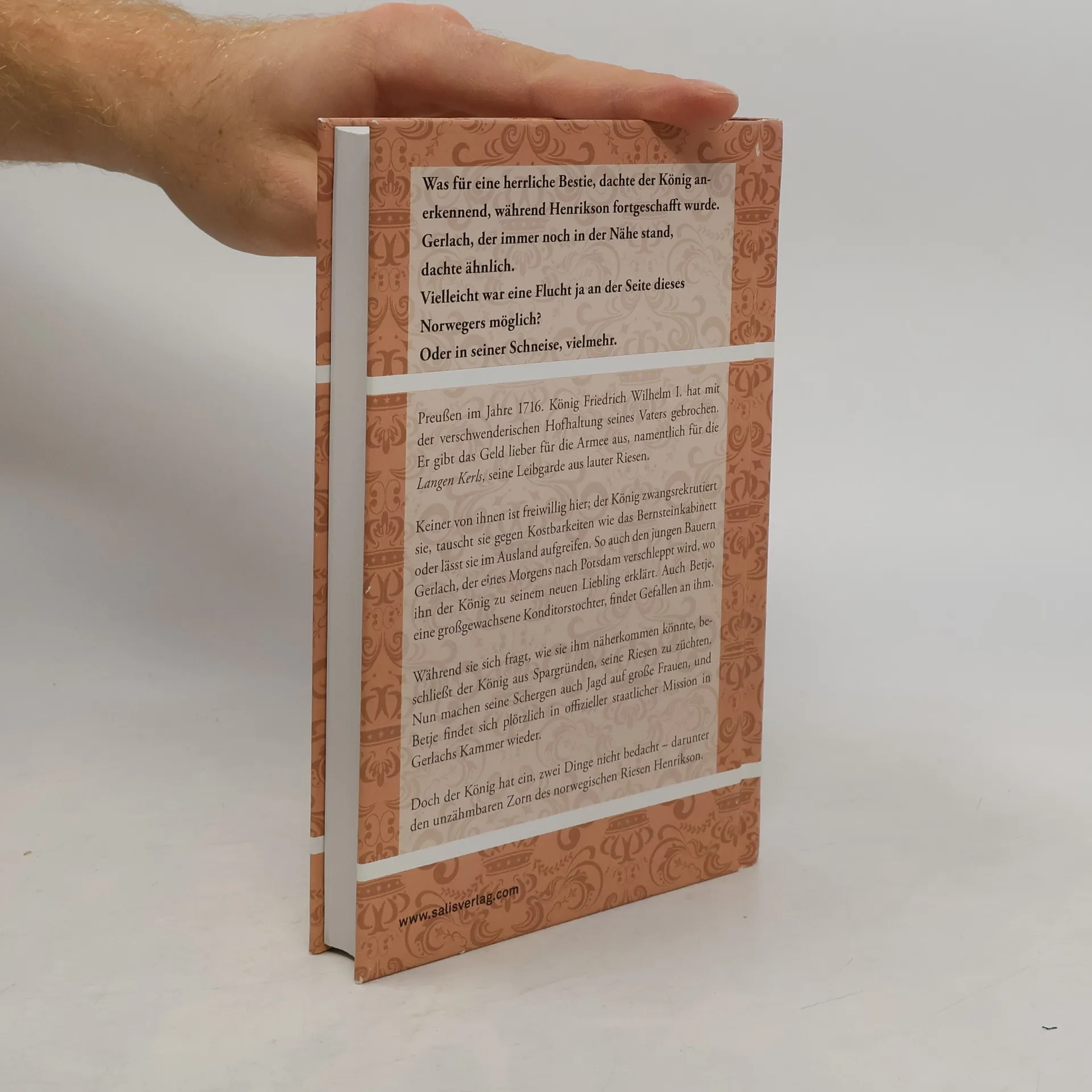 Preußen im Jahre 1716. König Friedrich Wilhelm I. hat mit der verschwenderischen Hofhaltung seines Vaters gebrochen. Er gibt das Geld lieber für die Armee aus – namentlich für die Langen Kerls, seine Leibgarde aus lauter Riesen. Keiner von ihnen ist allerdings freiwillig hier; der König hat sie gekauft, gegen Kostbarkeiten wie das Bernsteinzimmer getauscht oder schlicht entführen lassen. So auch den jungen Bauern Gerlach, der eines Morgens nach Potsdam verschleppt wird, wo ihn der König zu seinem neuen Liebling erklärt. Auch Betje, eine groß gewachsene, schöne Bäckerstochter, findet Gefallen an ihm. Während sie sich fragt, wie sie Gerlach näherkommen könnte, hat der König einen grandiosen Einfall: Aus Spargründen beschließt er, seine Riesen zu züchten. Nun machen seine Häscher auch Jagd auf große Frauen, und Betje findet sich plötzlich in offizieller staatlicher Mission in Gerlachs Kammer wieder. Doch der König hat ein, zwei Dinge nicht bedacht – darunter den unzähmbaren Zorn des norwegischen Riesen Henrikson …