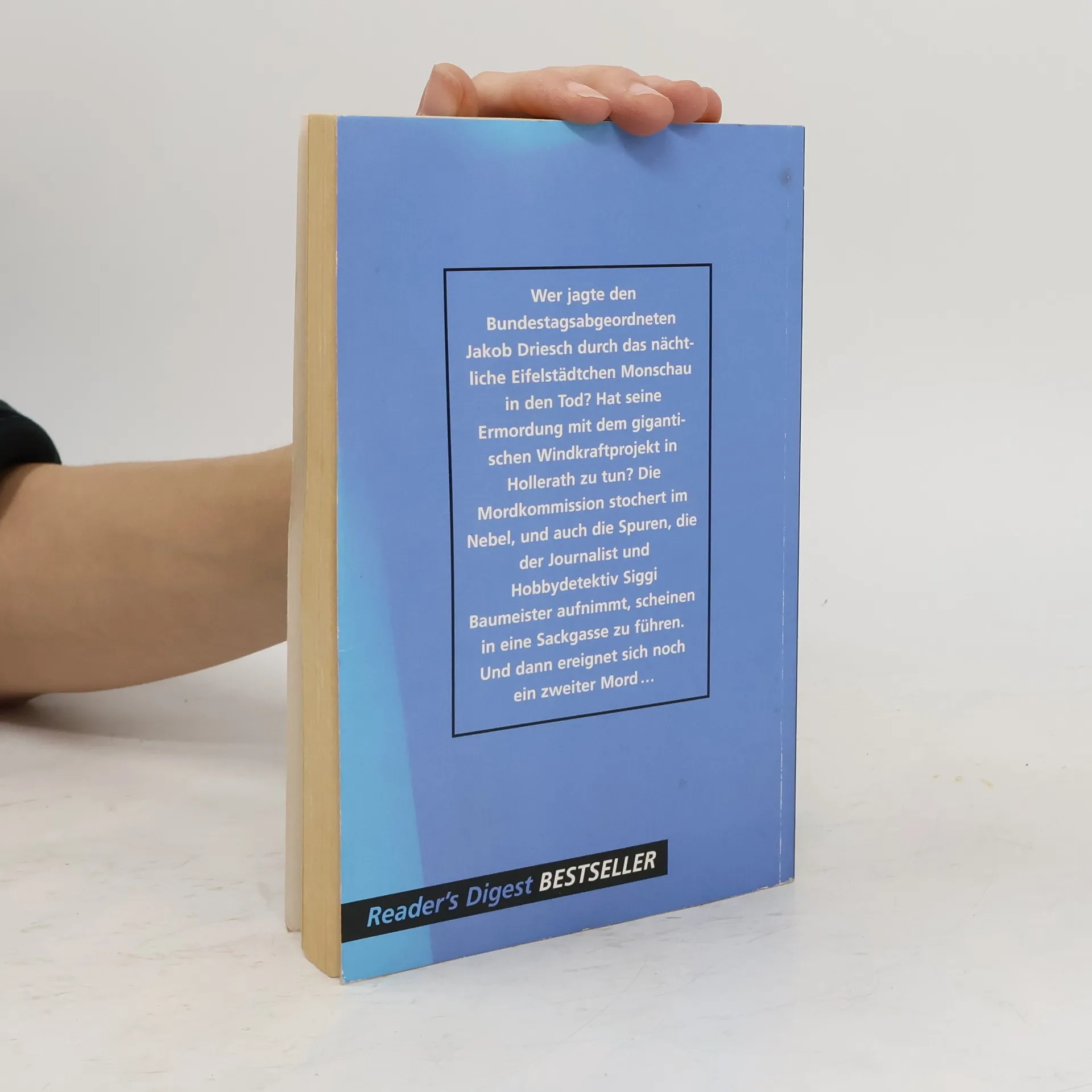 Der achte Band der Eifel-Serie. Wer jagte den Bundestagsabgeordneten Jakob Driesch durch das nächtliche Monschau in den Tod? Warum wurde die lebenslustige Annette von Hülsdonk vom Pferd geschossen? Die Mordkommission stochert im Nebel. Haben die Morde mit dem gigantischen Windkraftprojekt in Hollerath zu tun? Doch jede Spur, die der Journalist Siggi Baumeister, der Kriminalrat a. D. Rodenstock und dessen Frau Emma aufnehmen, scheint in eine Sackgasse zu führen.