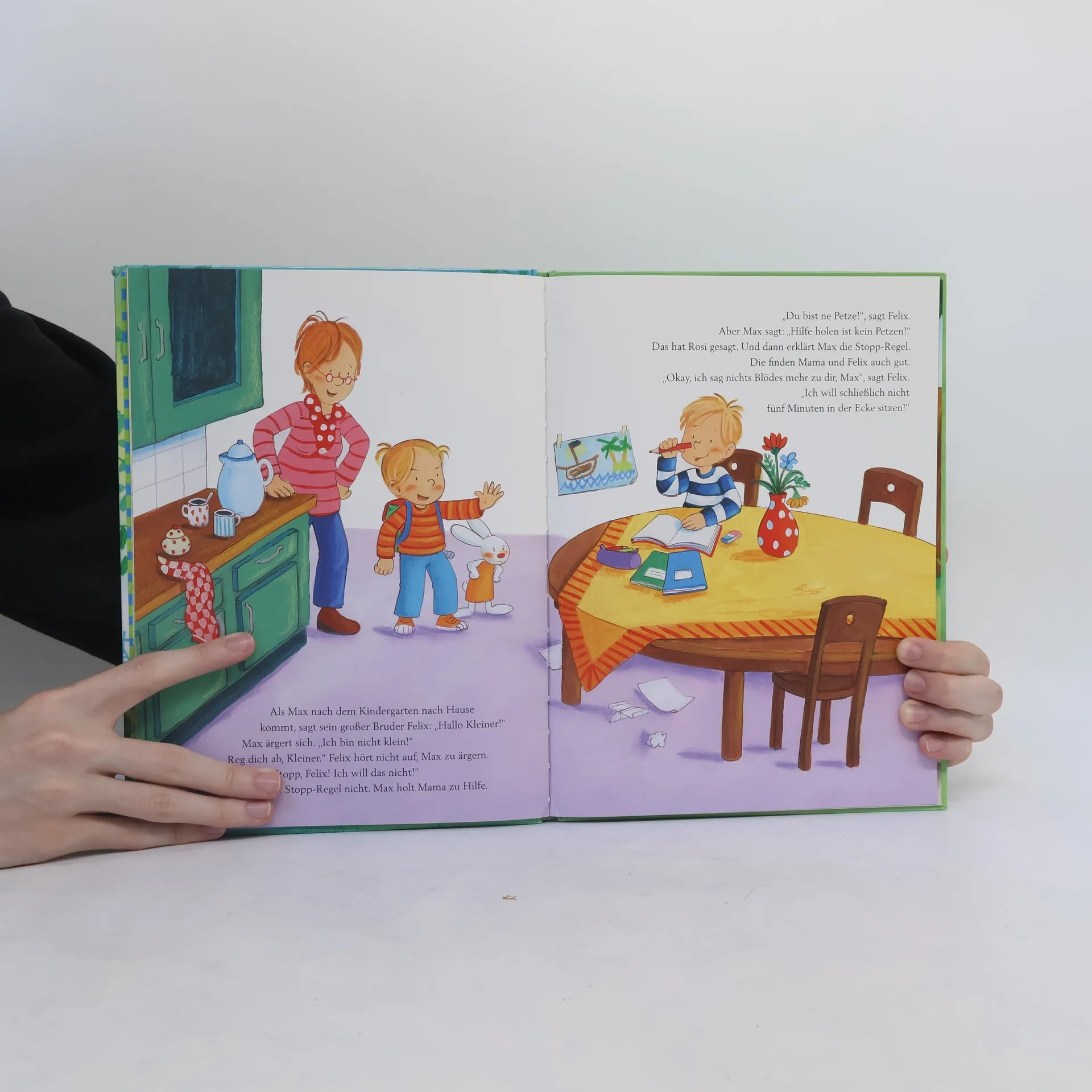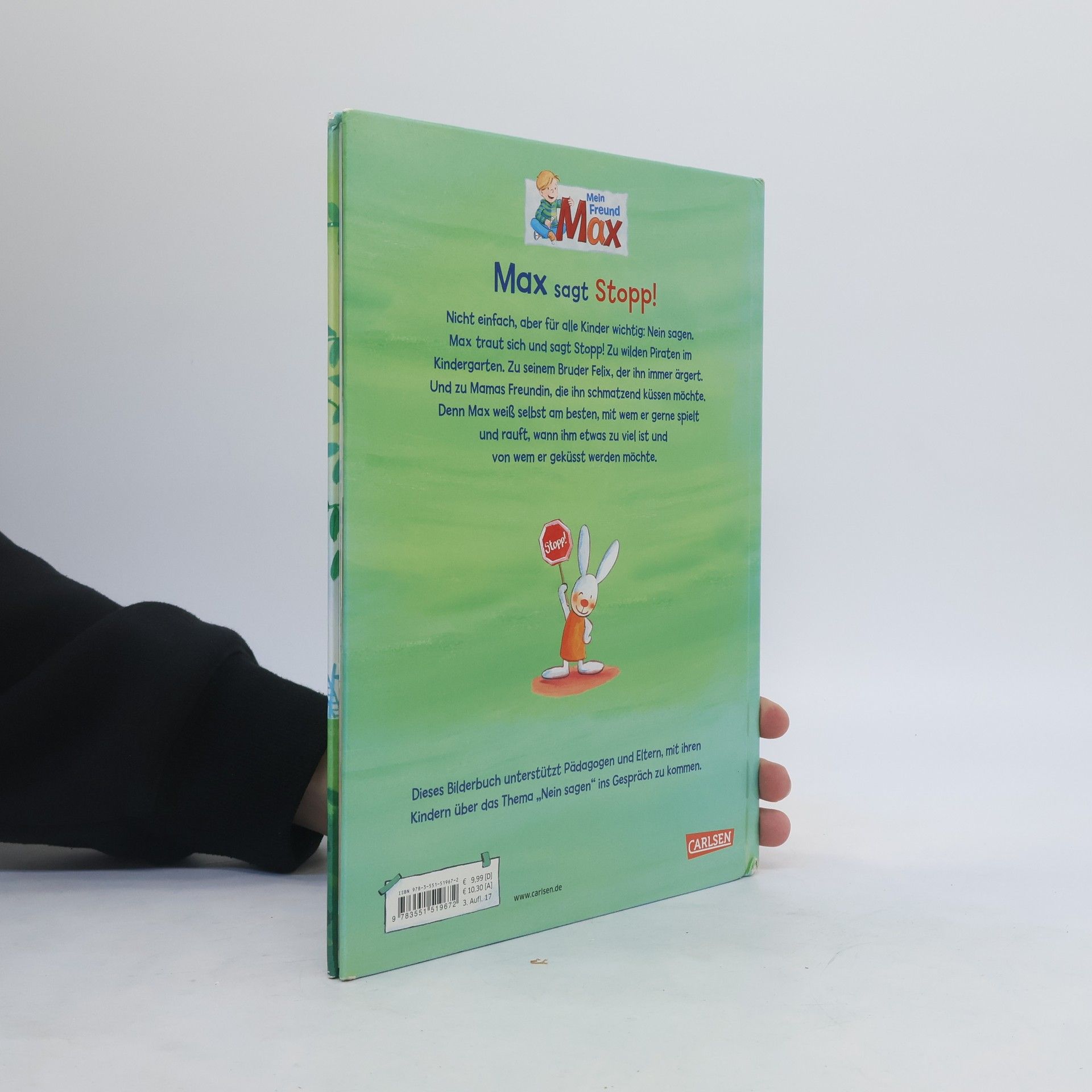Nicht einfach, aber für alle Kinder wichtig: Nein sagen. Max traut sich und sagt Stopp! Zu wilden Piraten im Kindergarten. Zu seinem Bruder Felix, der nicht aufhört ihn zu ärgern. Und zu Mamas Freundin, die ihn schmatzend küssen möchte. Denn Max weiß selbst am besten, mit wem er gerne spielt und rauft, wann ihm etwas zu viel ist und von wem er geküsst werden möchte. Dieses Bilderbuch unterstützt Pädagogen und Eltern dabei, mit ihren Kindern über das Thema „Nein sagen“ ins Gespräch zu kommen.