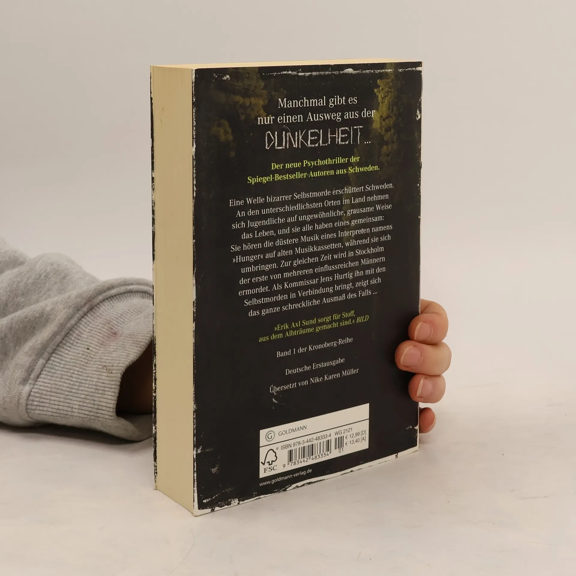 Der erste, in sich abgeschlossene Band der neuen Kronoberg-Reihe. Eine Welle bizarrer Selbstmorde erschüttert Schweden. An den unterschiedlichsten Orten im Land nehmen sich Jugendliche auf ungewöhnliche, grausame Weise das Leben, und sie alle haben eines gemeinsam: Sie hören die düstere Musik eines Interpreten namens „Hunger“ auf alten Musikkassetten, während sie sich umbringen. Zur gleichen Zeit wird in Stockholm der erste von mehreren einflussreichen Männern ermordet. Als Kommissar Jens Hurtig ihn mit den Selbstmorden in Verbindung bringt, zeigt sich das ganze schreckliche Ausmaß des Falls ... Ausstattung: eingelegtes Lesezeichen