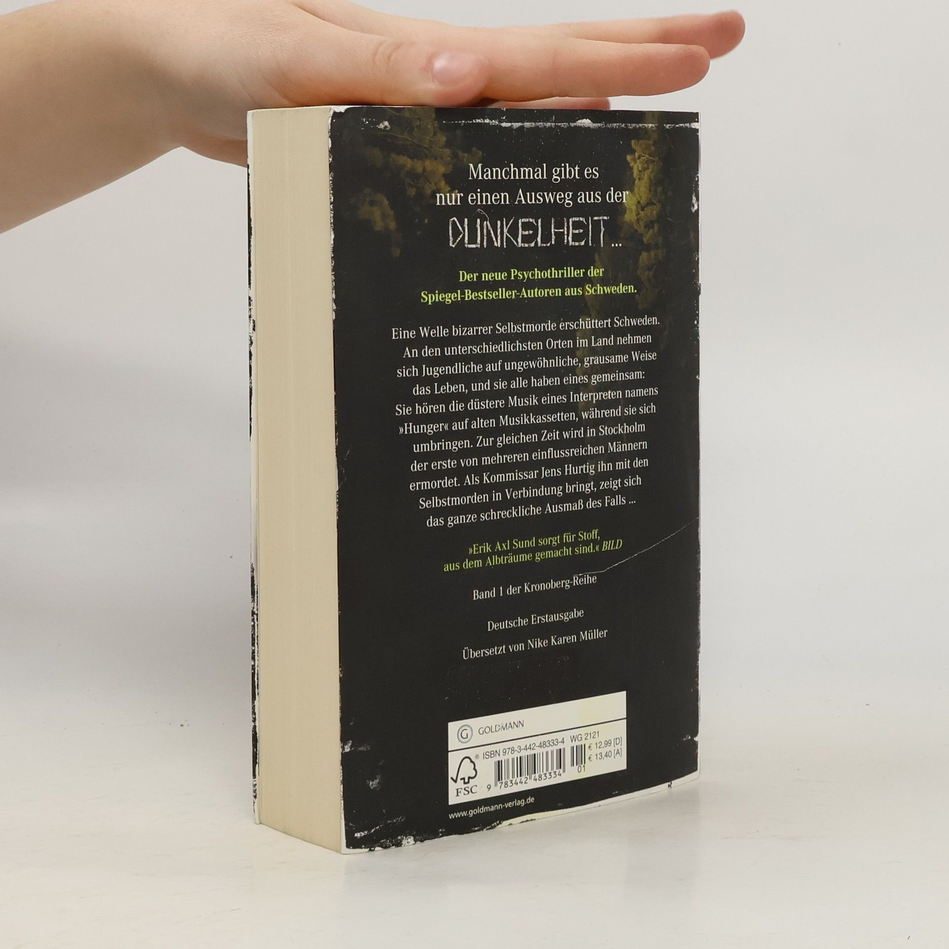 Der erste, in sich abgeschlossene Band der neuen Kronoberg-Reihe. Eine Welle bizarrer Selbstmorde erschüttert Schweden. An den unterschiedlichsten Orten im Land nehmen sich Jugendliche auf ungewöhnliche, grausame Weise das Leben, und sie alle haben eines gemeinsam: Sie hören die düstere Musik eines Interpreten namens „Hunger“ auf alten Musikkassetten, während sie sich umbringen. Zur gleichen Zeit wird in Stockholm der erste von mehreren einflussreichen Männern ermordet. Als Kommissar Jens Hurtig ihn mit den Selbstmorden in Verbindung bringt, zeigt sich das ganze schreckliche Ausmaß des Falls ... Ausstattung: eingelegtes Lesezeichen