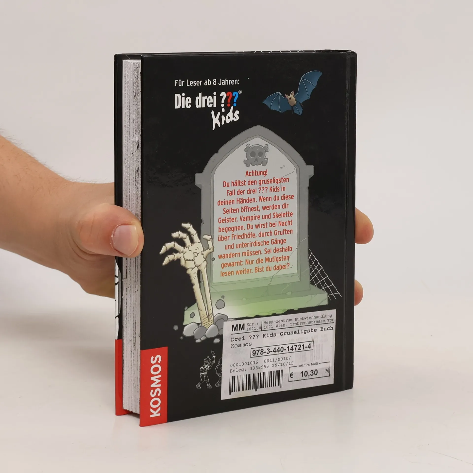 In der Stadtbibliothek finden „Die drei ??? Kids“ das gruseligste Buch aller Zeiten! Niemand weiß, woher es kommt, niemand kann ahnen, welche Gefahr sich hinter der nächsten Seite verbirgt. Denn jede zweite Doppelseite ist verschlossen! Nur die Mutigsten lesen weiter und gelangen mit Justus, Peter und Bob an die unheimlichsten Orte: nächtliche Friedhöfe, unterirdische Gänge, geheime Gruften. Überall lauern Geister, Skelette und Vampire. Doch mit Scharfsinn und der Hilfe ihrer Fans trotzen die Kultdetektive allen Gefahren. Und am Ende nimmt die Geschichte eine unerwartete Wendung...