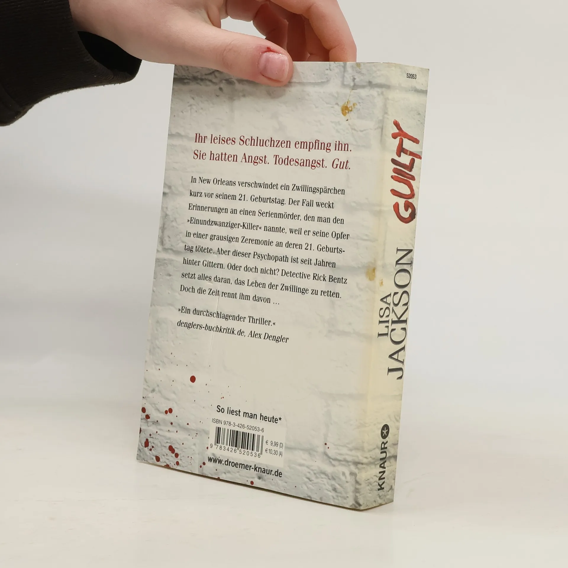 Die amerikanische Bestseller-Autorin Lisa Jackson lässt ihre Detectives Rick Bentz und Reuben Montoya erneut in einem kniffligen Serienmörder-Fall ermitteln. Der Thriller „Guilty“ ist nach „Desire“ der 8. Band der Serie rund um Bentz und Montoya. In New Orleans verschwindet ein Zwillingspaar kurz vor seinem 21. Geburtstag. Der Fall weckt Erinnerungen an einen Serienmörder, den man den „Einundzwanziger-Killer“ nannte, weil er seine Opfer in einer grausigen Zeremonie an deren 21. Geburtstag tötete. Aber dieser Psychopath ist seit Jahren hinter Gittern. Oder doch nicht? Detective Rick Bentz befürchtet das Schlimmste. Zusammen mit seinem Partner Detective Reuben Montoya versucht er fieberhaft, den Killer zu fassen und das Leben der Zwillinge zu retten. Doch die Zeit rennt ihnen davon … „Perfekt geplotteter Thriller, nervenzerreißend spannend.“ (Romantic Times Book Reviews)