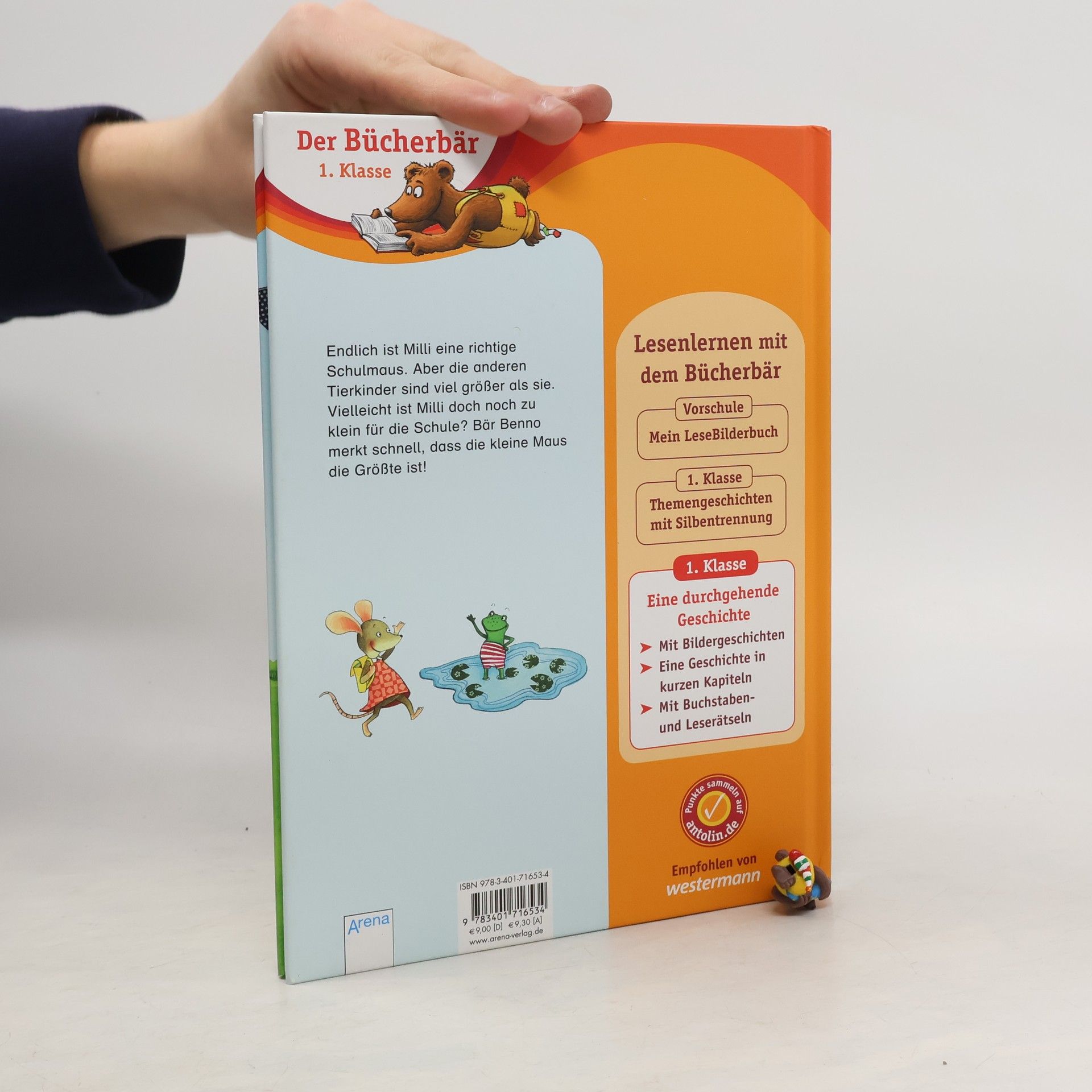 Endlich ist Milli eine richtige Schulmaus. Aber die anderen Tierkinder sind viel größer als sie. Vielleicht ist Milli doch noch zu klein für die Schule? Bär Benno merkt schnell, dass die kleine Maus die Größte ist! Lesenlernen mit dem Bücherbär Dieses Buch richtet sich an Leseanfänger in der 1. Klasse. Die übersichtlichen Leseeinheiten und kurzen Zeilen sind ideal zum Lesenlernen. Zahlreiche Bildergeschichten unterstützen das Textverständnis. Zusätzlich regen lustige Buchstaben- und Leserätsel am Ende des Buches zum Nachdenken und zum Gespräch über die Geschichte an. Denn Kinder, die viel Gelegenheit zum Sprechen haben, lernen auch schneller lesen. Empfohlen von Westermann Mit Bücherbärfigur am Lesebändchen Der Titel ist auf Antolin. de gelistet