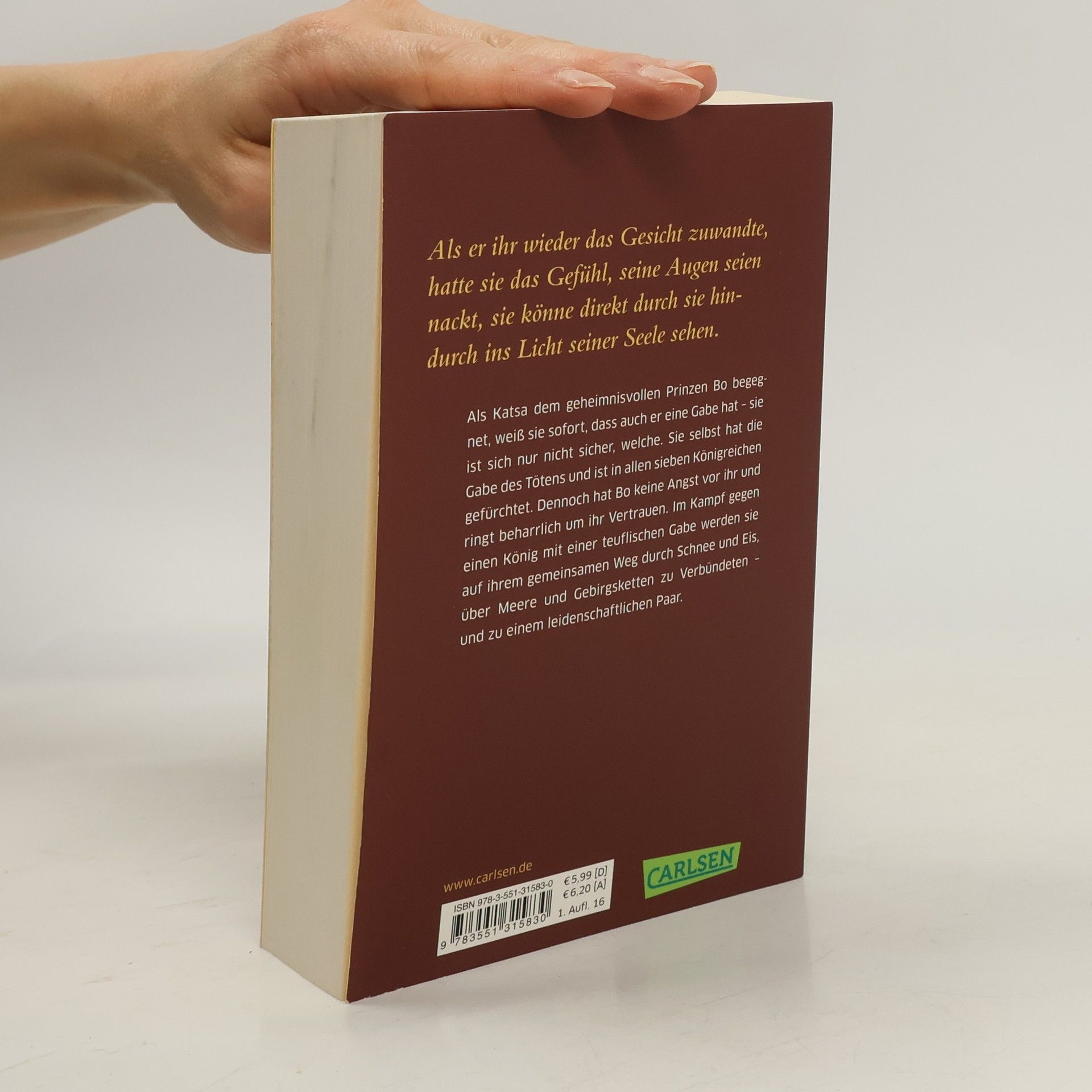 Als Katsa dem geheimnisvollen Prinzen Bo begegnet, weiß sie sofort, dass auch er eine Gabe hat – sie ist sich nur nicht sicher, welche. Sie selbst hat die Gabe des Tötens und ist in allen sieben Königreichen gefürchtet. Dennoch hat Bo keine Angst vor ihr und ringt beharrlich um ihr Vertrauen. Im Kampf gegen einen König mit einer teuflischen Gabe werden sie auf ihrem gemeinsamen Weg durch Schnee und Eis, über Meere und Gebirgsketten zu Verbündeten – und zu einem leidenschaftlichen Paar. Alle Bände der romantischen Serie: Die Beschenkte (Band 1) Die Flammende (Band 2) Die Königliche (Band 3)
