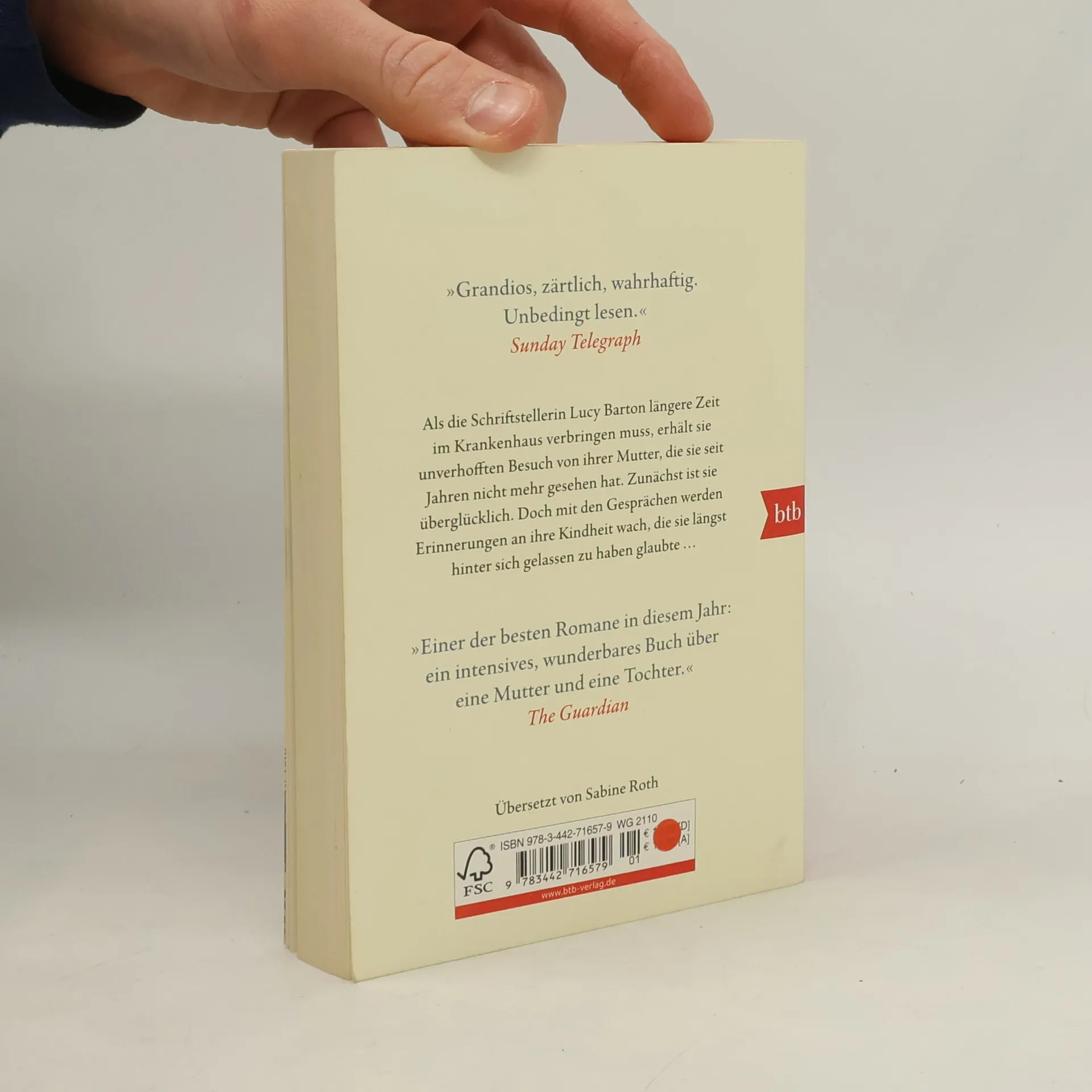 Lucy Barton erzählt ihre Geschichte. Sie muss sie erzählen, weil sie auf der Suche nach der Wahrheit ist, als Schriftstellerin wie als Mensch. Und es gibt zu vieles, was ihr Leben geprägt hat und ihr immer noch keine Ruhe lässt. Das wird ihr klar, als sie wegen einer unerklärlichen, lebensbedrohenden Infektion nach einem Routineeingriff längere Zeit im Krankenhaus bleiben muss und plötzlich ihre Mutter an ihrem Bett sitzt. Ihre Mutter, die sie nicht mehr gesehen hat, seit sie ihr Zuhause in einem kleinen Kaff in Illinois verlassen hat. Während sie erschöpft und glücklich der Stimme ihrer Mutter lauscht, die ihr Geschichten von den Leuten aus ihrer Heimat erzählt und was aus ihnen geworden ist, während Mutter und Tochter ein neues Band zu formen scheinen, auch wenn sie nur schweigend aus dem Fenster auf das beleuchtete Chrysler Building gegenüber schauen, kommt alles wieder hoch: die bettelarme Kindheit, die Schwierigkeiten in der Familie, der Mangel an Zärtlichkeit und Zuneigung. Wie der Wunsch, Schriftstellerin zu werden, ihr half, ihre Ängste zu bekämpfen, wie fremd sie sich dennoch manchmal in New York vorkommt. Ihre Ehe mit einem Mann aus einem wohlbehüteten Elternhaus und die vielen Abgründe, die sich zwischen ihnen auftun, trotz des gemeinsamen Lebens und der zwei heißgeliebten Töchter …