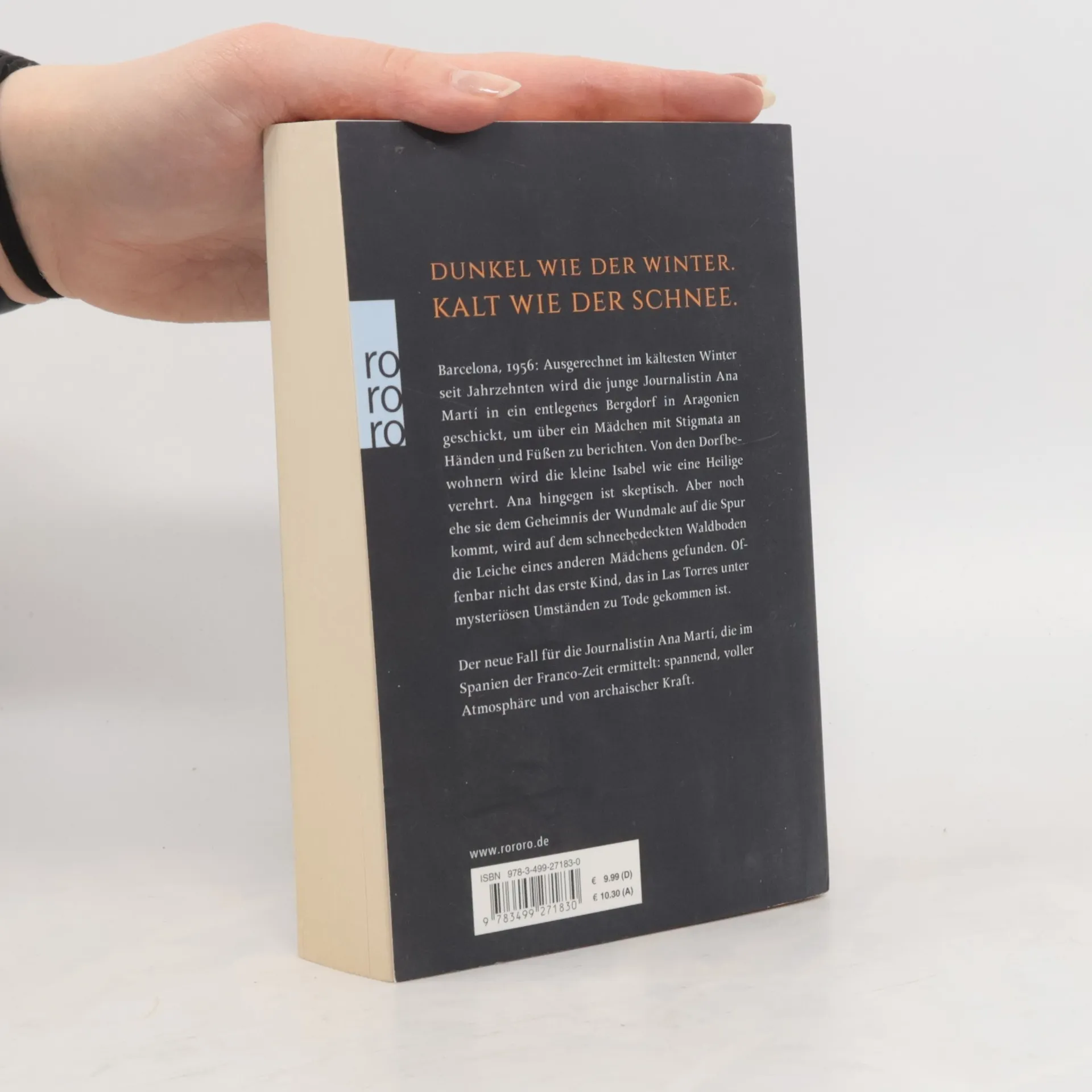 Dunkel wie der Winter. Kalt wie der Schnee. Barcelona, 1956: Ausgerechnet im kältesten Winter seit Jahrzehnten wird die junge Journalistin Ana Martí in ein entlegenes Bergdorf in Aragonien geschickt, um über ein Mädchen mit Stigmata an Händen und Füßen zu berichten. Von den Dorfbewohnern wird die kleine Isabel wie eine Heilige verehrt. Ana hingegen ist skeptisch. Aber noch ehe sie dem Geheimnis der Wundmale auf die Spur kommt, wird auf dem schneebedeckten Waldboden die Leiche eines anderen Mädchens gefunden. Offenbar nicht das erste Kind, das in Las Torres unter mysteriösen Umständen zu Tode gekommen ist ... Der neue Fall für die Journalistin Ana Martí, die im Spanien der Franco-Zeit ermittelt: spannend, voller Atmosphäre und von archaischer Kraft.