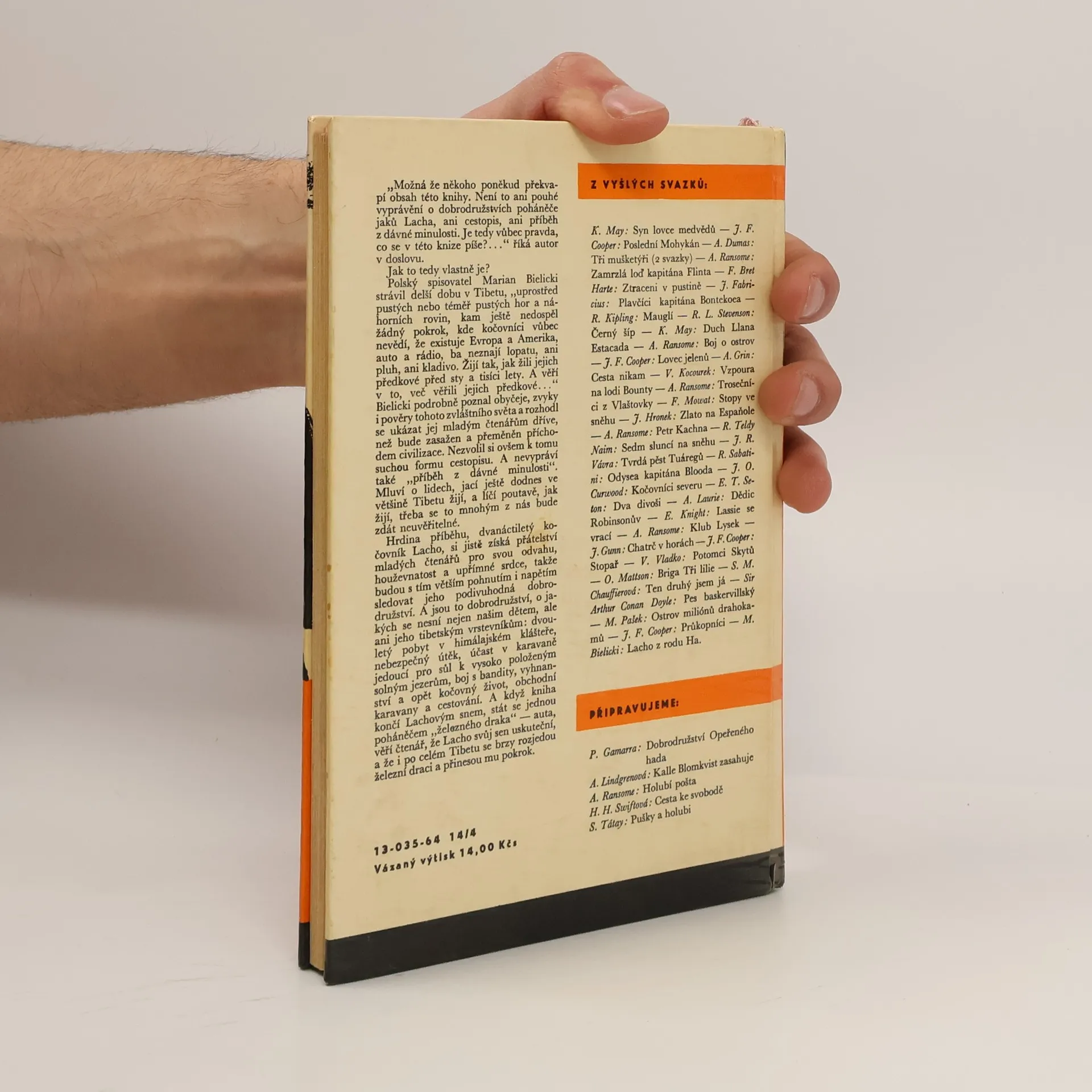 Hrdina příběhu, dvanáctiletý kočovník Lacho, si jistě získá přátelství mladých čtenářů pro svou odvahu, houževnatost a upřímné srdce, takže budou s tím větším pohnutím i napětím sledovat jeho podivuhodná dobrodružství. A jsou to dobrodružství, o jakých se nesní nejen našim dětem, ale ani jeho tibetským vrstevníkům: dvouletý pobyt v himálajském klášteře, nebezpečný útěk, účast v karavaně jedoucí pro sůl k vysoko položeným solným jezerům, boj s bandity, vyhnanství a opět kočovný život, obchodní karavany a cestování. A když kniha končí Lachovým snem, stát se jednou poháněčem „železného draka“ – auta, věří čtenář, že Lacho svůj sen uskuteční, a že i po celém Tibetu se brzy rozjedou železní draci a přinesou mu pokrok. 13-035-64