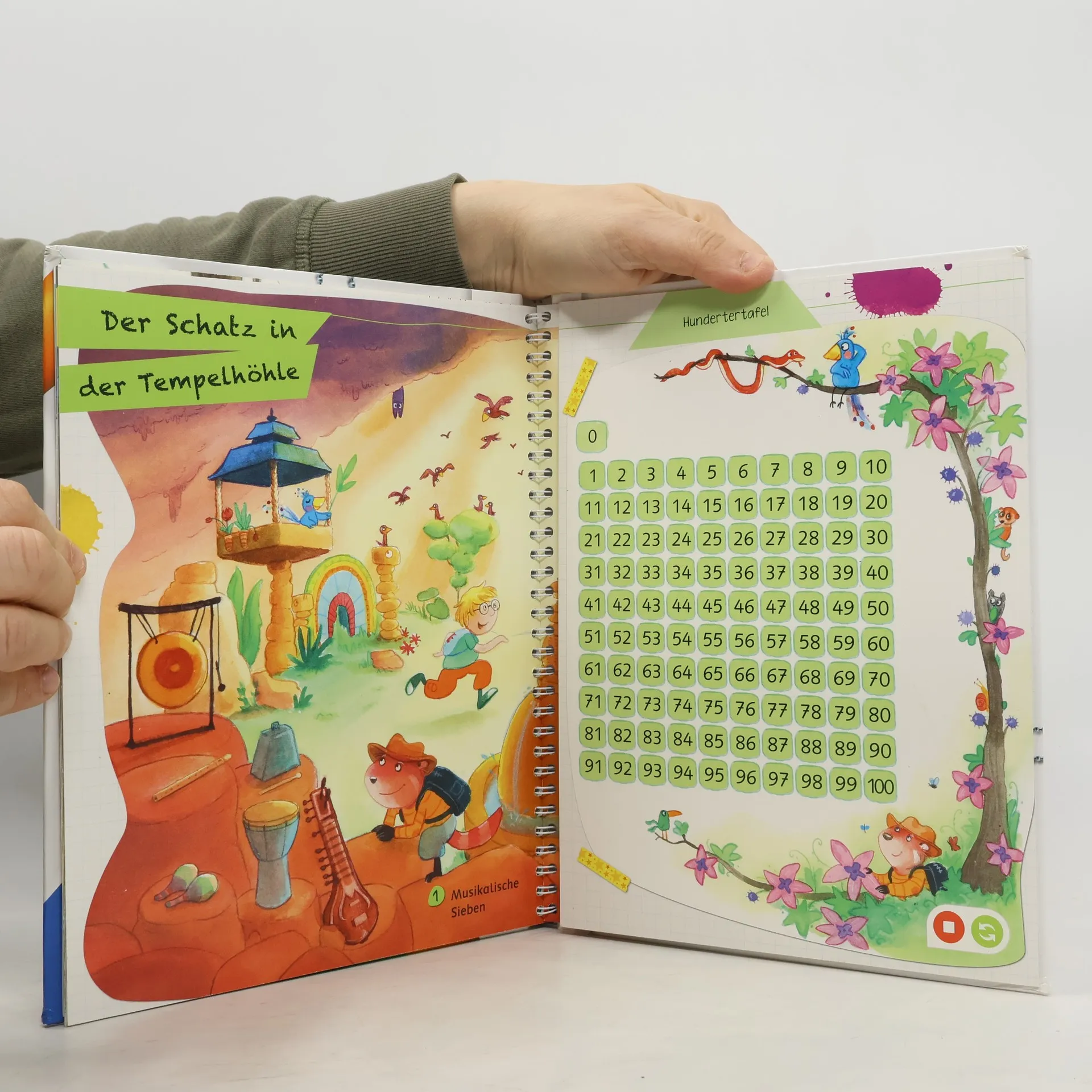 So macht Rechnen Spaß! Leni und David machen sich gemeinsam mit Abenteurer Marvin und Mathegenie Kurt auf die Suche nach dem großen Schatz im Einmaleins-Gebirge. Auf ihrem Weg gelangen sie in eine fantastische Höhlenwelt, in der sie zahlreiche Rechenaufgaben lösen und kniffelige Hindernisse überwinden müssen. Am Ende kommen die vier dem Geheimnis des Schatzes in einer verfallenen Tempelruine auf die Spur. Mit der Reihe tiptoi Lern mit mir! erleben die Kinder spielerisch, interaktiv und selbstständig verschiedene Lernthemen für die Grundschule. In den Bänden der Reihe können sie so Deutsch- und Mathematik-Inhalte für die 1. Klasse vertiefen, das kleine 1 x 1 üben oder Deutschland mit seinen Gebirgen, Städten und Sehenswürdigkeiten kennenlernen. Alle Inhalte werden kindgerecht und in Bezug auf die Lehrpläne der jeweiligen Fächer vermittelt. In jedem Buch gibt es viele knifflige und lustige Aufgaben in zahlreichen Varianten und mit motivierender Lösungskontrolle. Dies sorgt für wiederholte Beschäftigung und nachhaltigen Lernerfolg. Lustige Geräusche und spannende Geschichten runden das interaktive Erlebnis ab. Die Reihe ist somit die ideale Unterstützung zum Aneignen und selbständigen Vertiefen des Schulstoffs. tiptoi-Stift nicht enthalten. Muss separat erworben werden.