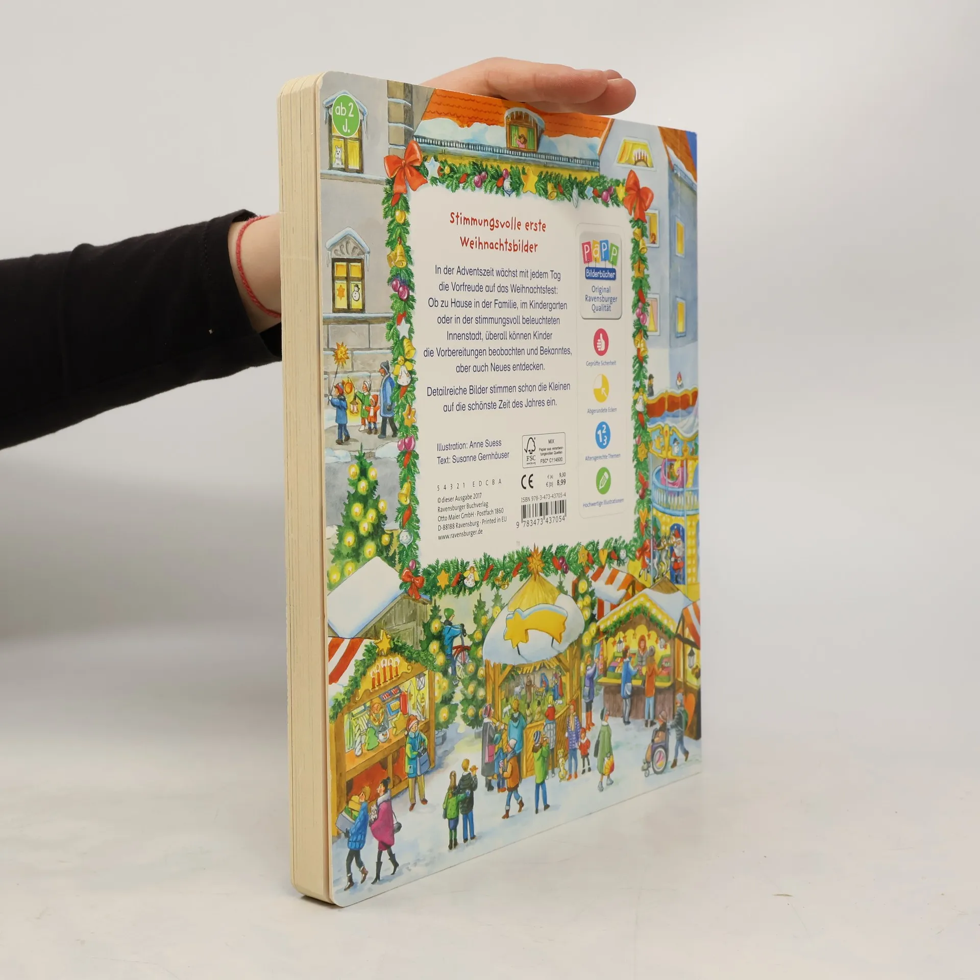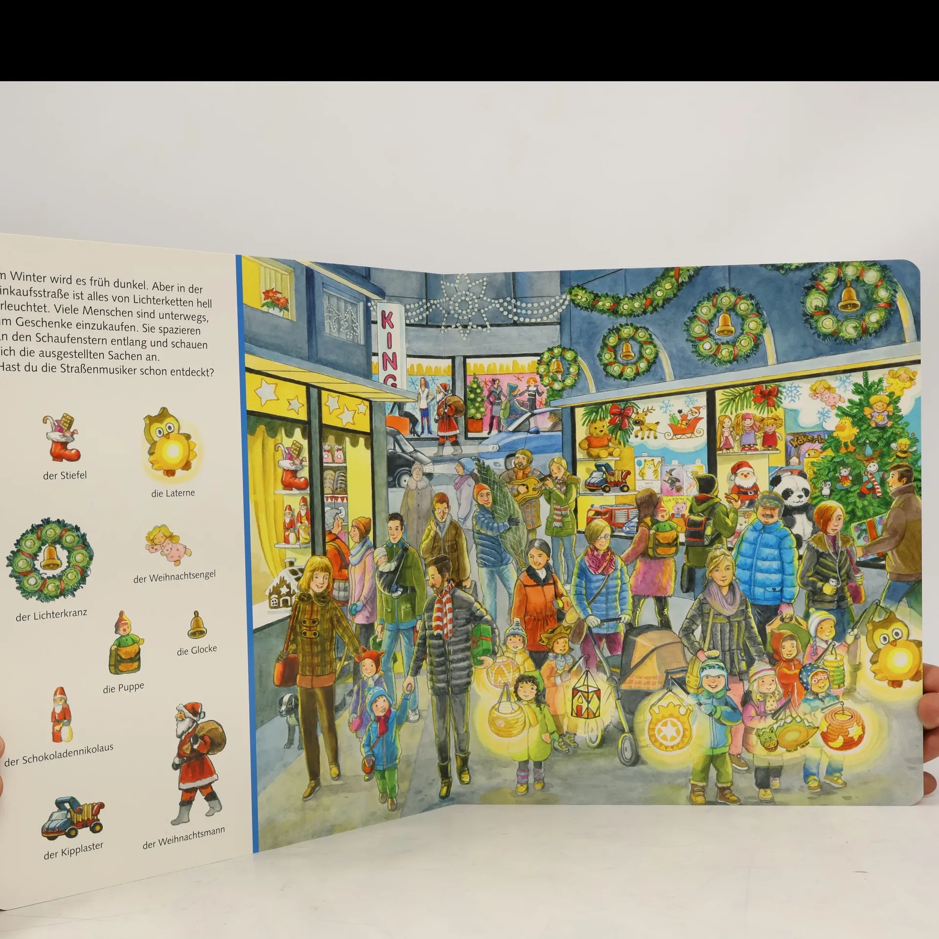 Großformatige, stimmungsvolle Weihnachtsbilder, seitlich ergänzt durch zahlreiche Suchvignetten, unterhalten die Kleinsten in der Vorweihnachtszeit.