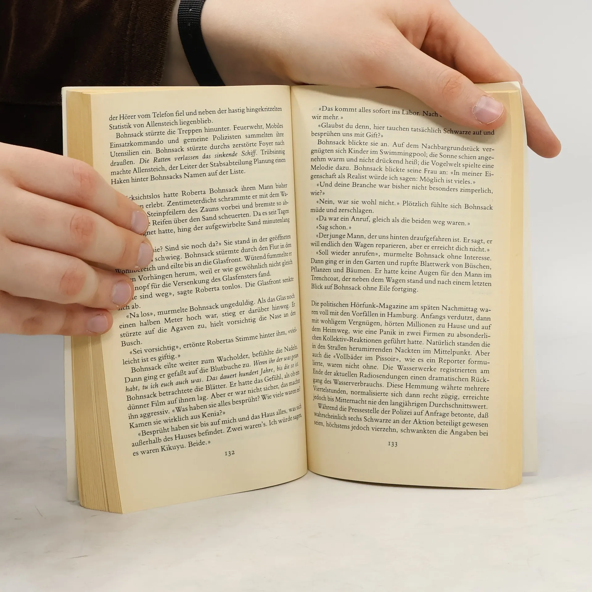 Schwarzblau schimmert der Himmel in dieser Novembernacht. Ein Mann im Trenchcoat steht einsam vor leeren Bürohäusern. Schüsse fallen. Scheiben klirren. Welches grausame Ziel verfolgt der Schütze? Die Belegschaft einer alternativen Tankstelle ist einem Millionencoup auf der Spur. Kann der Mann im Trench helfen? Zwei Schwarze auf dem Weg in das Centrum der Stadt. Ihr Gepäck, ein Kanister mit zwei gekreuzten Bananen, birgt Gefahr. Was steckt in dem unheimlichen Kanister? Eine Zwei-Mann-Entrümpelungsfirma bei der Arbeit. Als die beiden Männer ein Nebenzimmer betreten, bleibt ihnen der Mund offenstehen: ein komplett eingerichtetes Zimmer aus einem amerikanischen Detektiv-Film – Sam Spade läßt grüßen! Wo kann man bloß diese Möbel kaufen? Ein Kriminalbeamter, wie er im Buche steht: wachsam, intelligent und gerecht. Nur Liebe kann ihn außer Gefecht setzen. Er arbeitet an einem schwierigen Fall, dem Pappnasenmord. Welche schöne Frau wird ihm zum Verhängnis? Eine Kaffeefirma in Hamburg wird Opfer eines Anschlags. Massenhysterie bricht aus. Menschen springen aus dem Fenster. Hat die Feuerwehr genügend Sprungtücher? Wissen Sie überhaupt, wie gefährlich Kaffeetrinken sein kann?