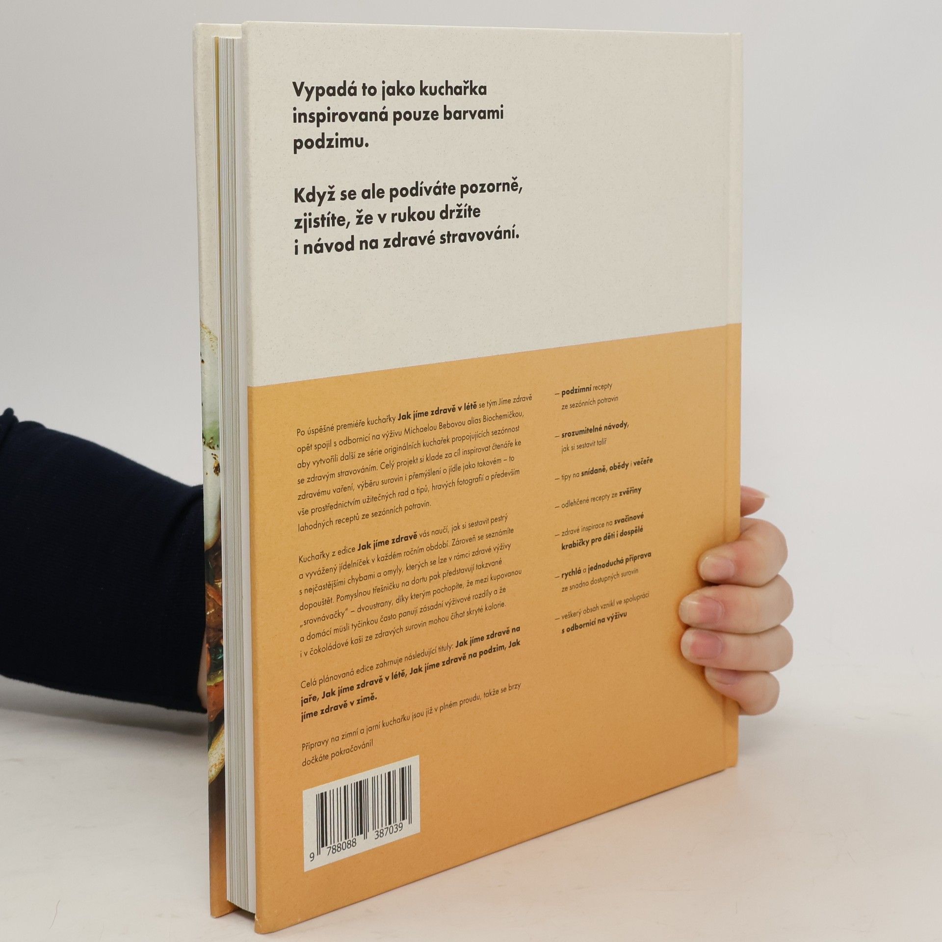 Kuchařka, nebo průvodce zdravým stravováním? Obojí! Kromě 94 sezónních receptů totiž v knize najdete celou řadu srozumitelných návodů a tipů, jak jíst zdravě. Zbrusu nový koncept je plný inspirace, překvapivého obsahu a nádherných fotografií, které vás hravou formou postupně vedou k tomu, abyste se naučili přemýšlet o skladbě jídla na talíři, výběru surovin nebo velikosti porcí. Pomocí knihy si snadno sestavíte vyvážený jídelníček, můžete jí ale i jen tak listovat a objevovat přitom nové chutě a zdravé kombinace. Ukážeme vám, že naše recepty nejsou žádná věda – většinu jídel připravíte do 30 minut, a to ze surovin, které seženete v běžném obchodě. Kuchařka plná podzimně laděných receptů přímo navazuje na Jak jíme zdravě v létě a skvěle tak rozšíří vaši sbírku – ať už hledáte nové recepty, nebo chcete proniknout do principů zdravého stravování. Na knize s námi spolupracovala odbornice na výživu RNDr. Michaela Bebová alias Biochemička.