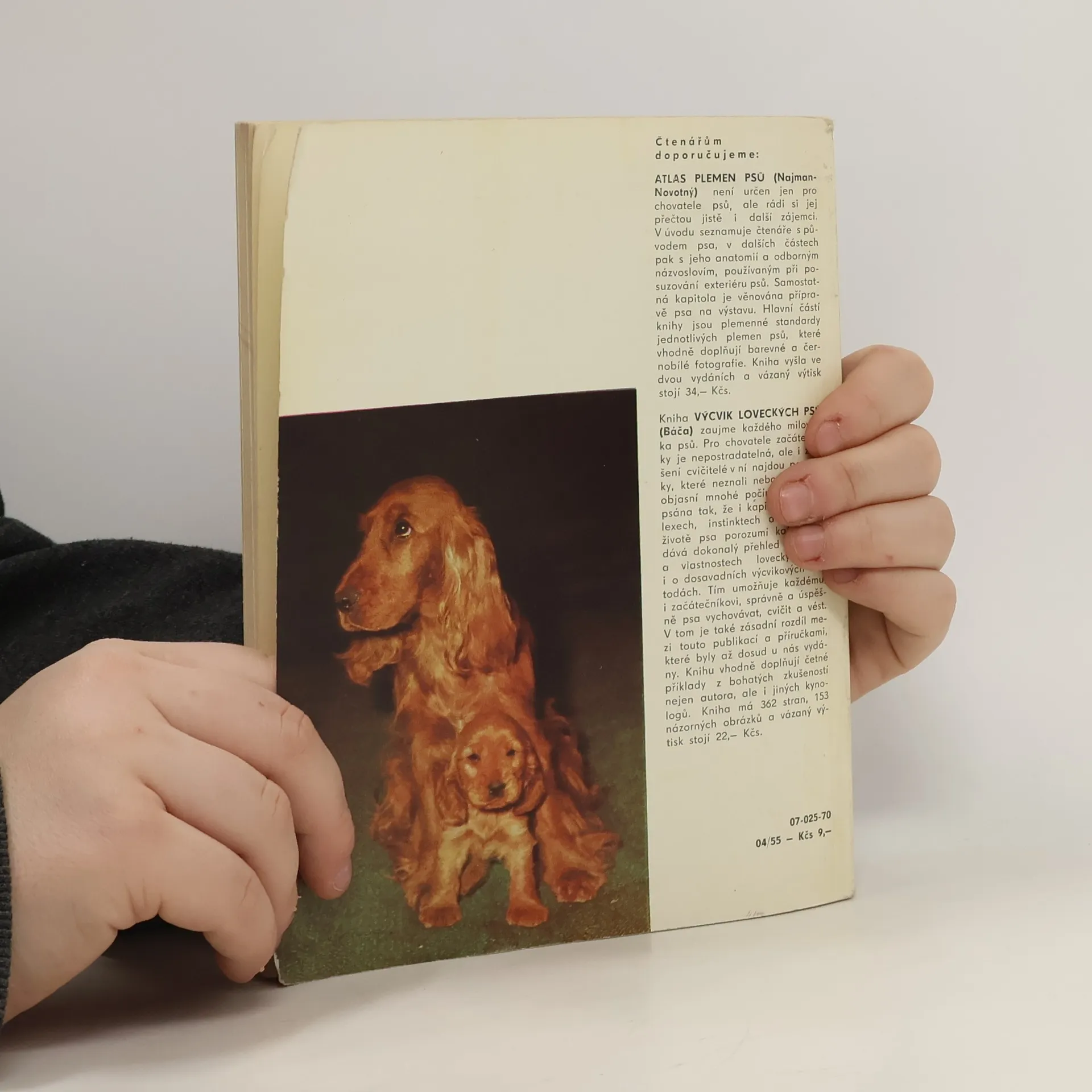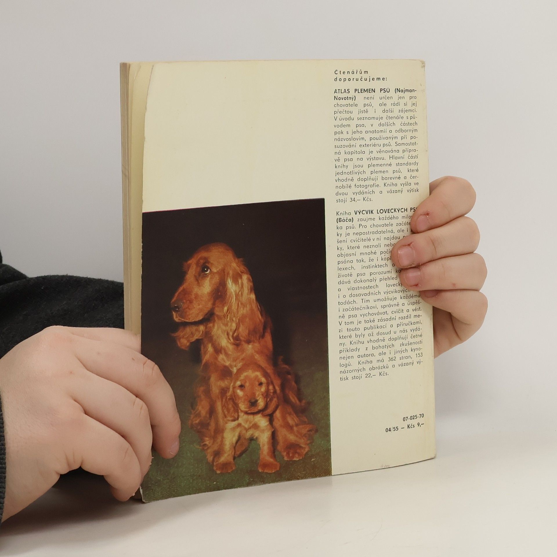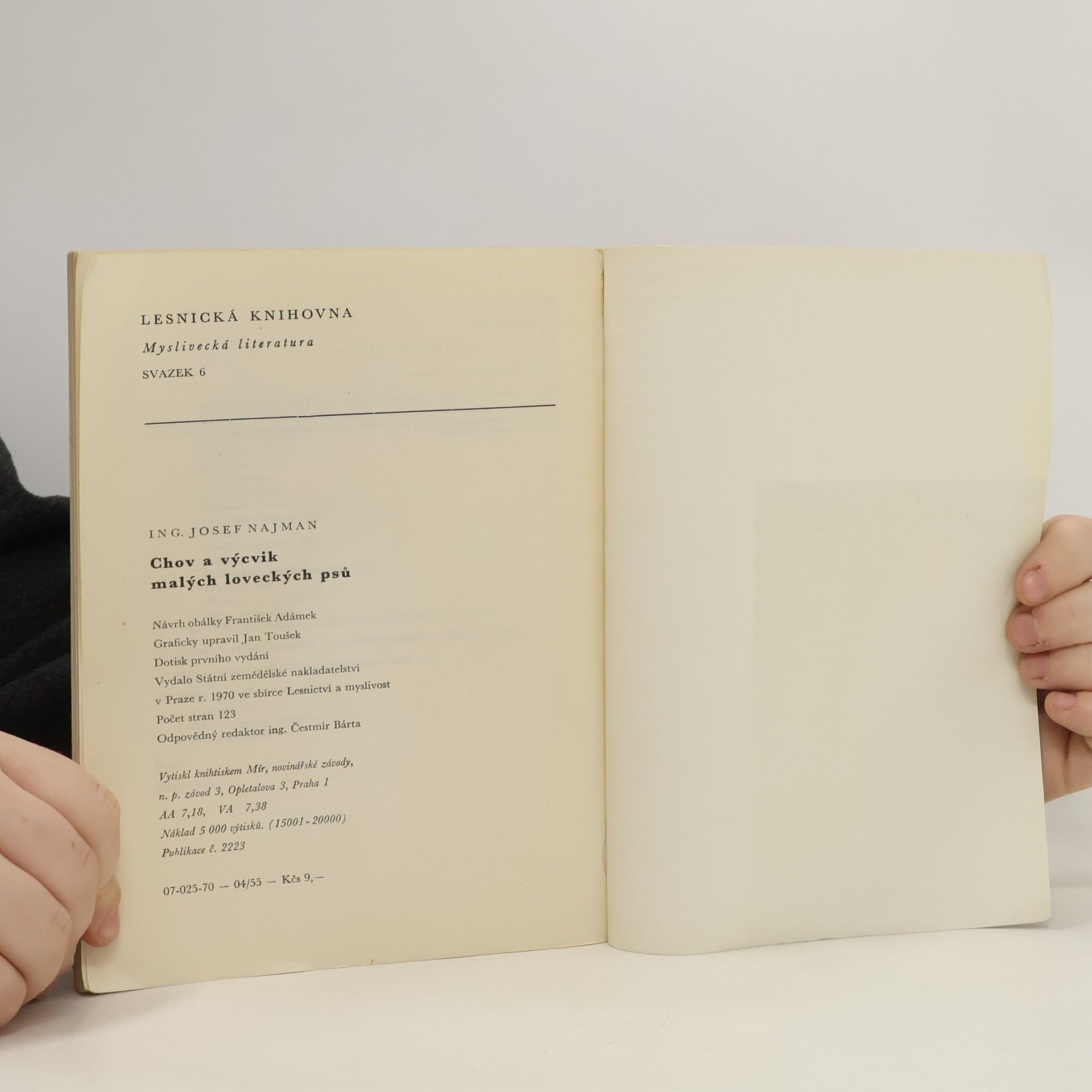 Především cvičitelům začátečníkům určená publikace přináší přehled plemen malých loveckých psů s popisem jejich zevních znaků a vlastností. Radí, jak správně pečovat o štěně i o dospělého psa, jak je cvičit k poslušnosti a jak provádět výcvik pro honitbu a norování. Závěremsi všímá problému malého psa ve městě a informuje o zkouškách a výstavách psů. Obálku s použitím barevné fotografie E. Studničky navrhl František Adámek. 1. vydání.