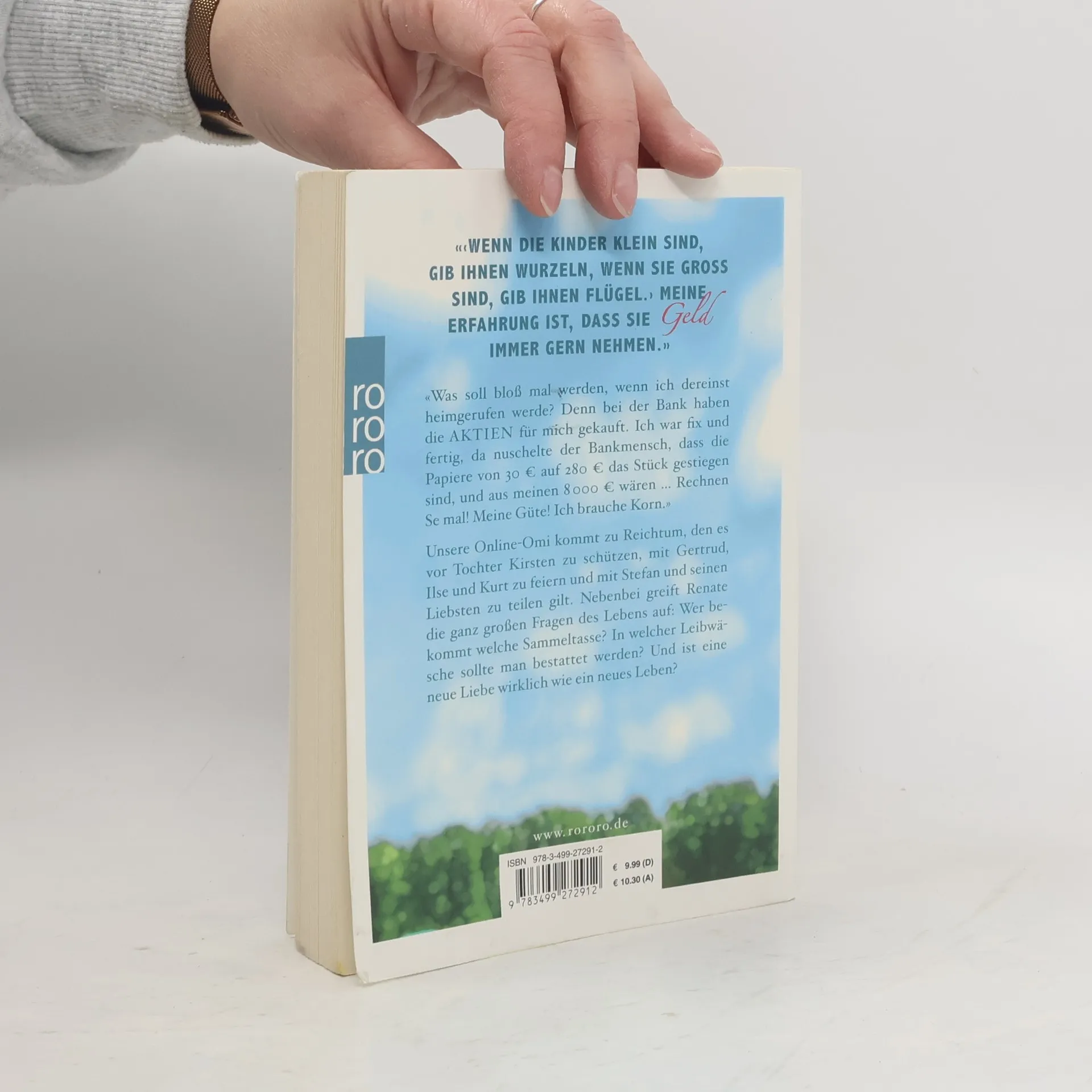 Wenn die Kinder klein sind, gib ihnen Wurzeln, wenn sie groß sind, gib ihnen Flügel.› Meine Erfahrung ist, dass sie Geld immer gern nehmen.' 'Was soll bloß mal werden, wenn ich dereinst heimgerufen werde? Denn bei der Bank haben die AKTIEN für mich gekauft. Ich war fix und fertig, da nuschelte der Bankmensch, dass die Papiere von 30 € auf 280 € das Stück gestiegen sind, und aus meinen 8.000€ wären… Rechnen Se mal! Meine Güte! Ich brauche Korn.' Unsere online-Omi kommt zu Reichtum, den es vor Tochter Kirsten zu schützen, mit Gertrud, Ilse und Kurt zu feiern und mit Stefan und seinen Liebsten zu teilen gilt. Nebenbei greift Renate die ganz großen Fragen des Lebens auf: Wer bekommt welche Sammeltasse? In welcher Leibwäsche sollte man bestattet werden? Und ist eine neue Liebe wirklich wie ein neues Leben?