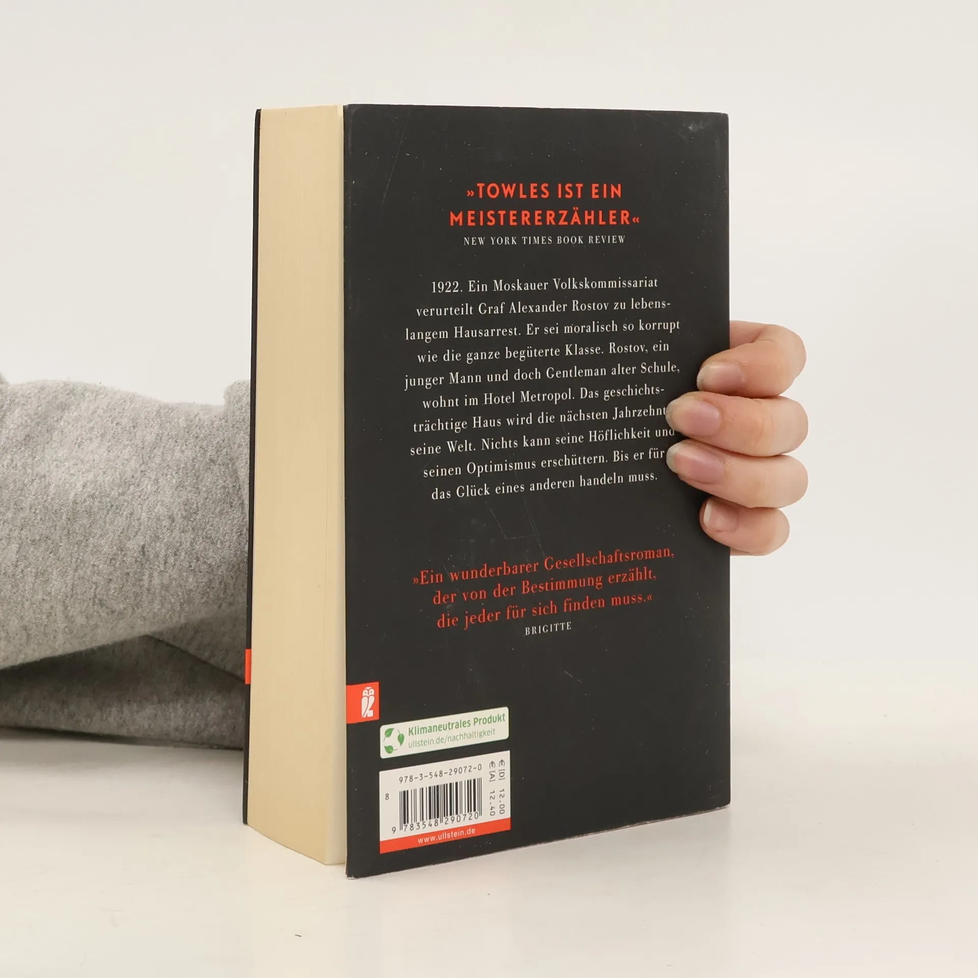 Moskau, 1922. Der genussfreudige Lebemann Graf Rostov wird verhaftet und zu lebenslangem Hausarrest verurteilt, ausgerechnet im Hotel Metropol, dem ersten Haus am Platz. Er muss alle bisher genossenen Privilegien aufgeben und eine Arbeit als Hilfskellner annehmen. Rostov mit seinen 30 Jahren ist ein äußerst liebenswürdiger, immer optimistischer Gentleman. Trotz seiner eingeschränkten Umstände lebt er ganz seine Überzeugung, dass selbst kleine gute Taten einer chaotischen Welt Sinn verleihen. Aber ihm bleibt nur der Blick aus dem Fenster, während draußen Russland stürmische Dekaden durchlebt. Seine Stunde kommt, als eine alte Freundin ihm ihre kleine Tochter anvertraut. Das Kind ändert Rostovs Leben von Grund auf. Für das Mädchen und sein Leben wächst der Graf über sich hinaus. „Towles ist ein Meistererzähler“ New York Times Book Review „Eine charmante Erinnerung an die Bedeutung von gutem Stil“ Washington Post „Elegant, dabei gleichzeitig filigran und üppig wie ein Schmuckei von Fabergé“ O, the Oprah Magazine
