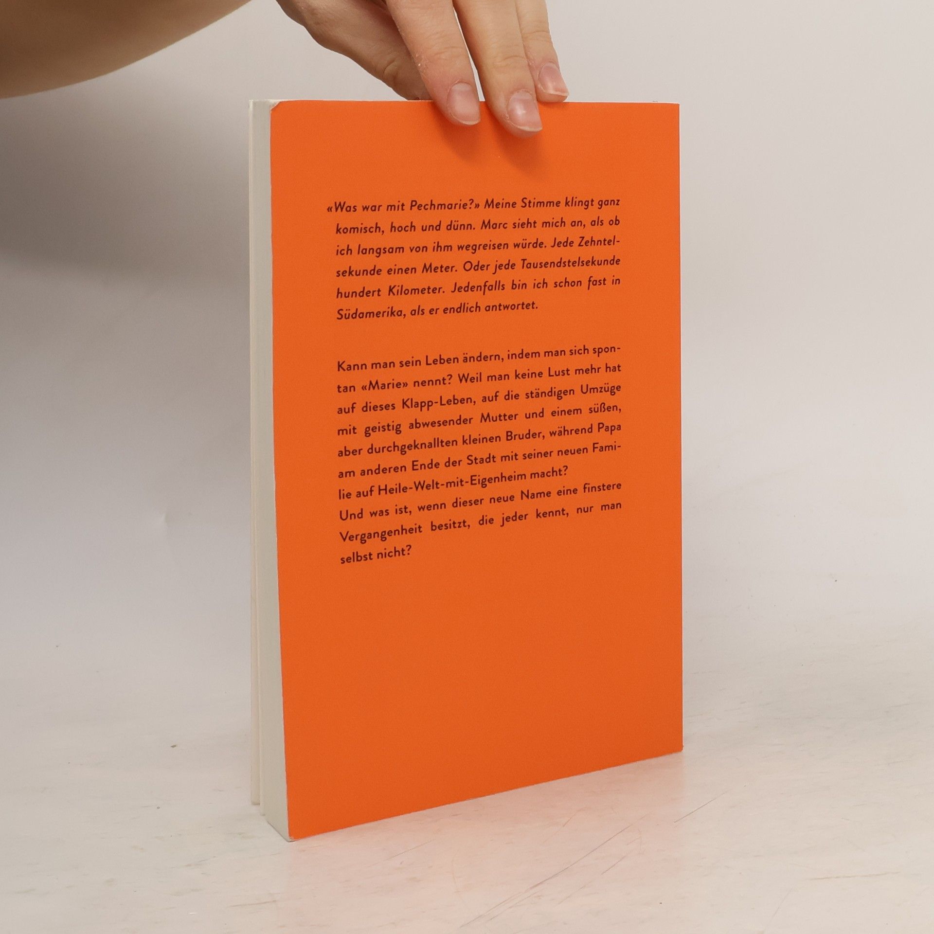 «Was war mit Pechmarie?» Meine Stimme klingt ganz komisch, hoch und dünn. Marc sieht mich an, als ob ich langsam von ihm wegreisen würde. Jede Zehntelsekunde einen Meter. Oder jede Tausendstelsekunde hundert Kilometer. Jedenfalls bin ich schon fast in Südamerika, als er endlich antwortet. Kann man sein Leben ändern, indem man sich spontan «Marie» nennt? Weil man keine Lust mehr hat auf dieses Klapp-Leben, auf die ständigen Umzüge mit geistig abwesender Mutter und einem süßen, aber durchgeknallten kleinen Bruder, während Papa am anderen Ende der Stadt mit seiner neuen Familie auf Heile-Welt-mit-Eigenheim macht? Und was ist, wenn dieser neue Name eine finstere Vergangenheit besitzt, die jeder kennt, nur man selbst nicht?