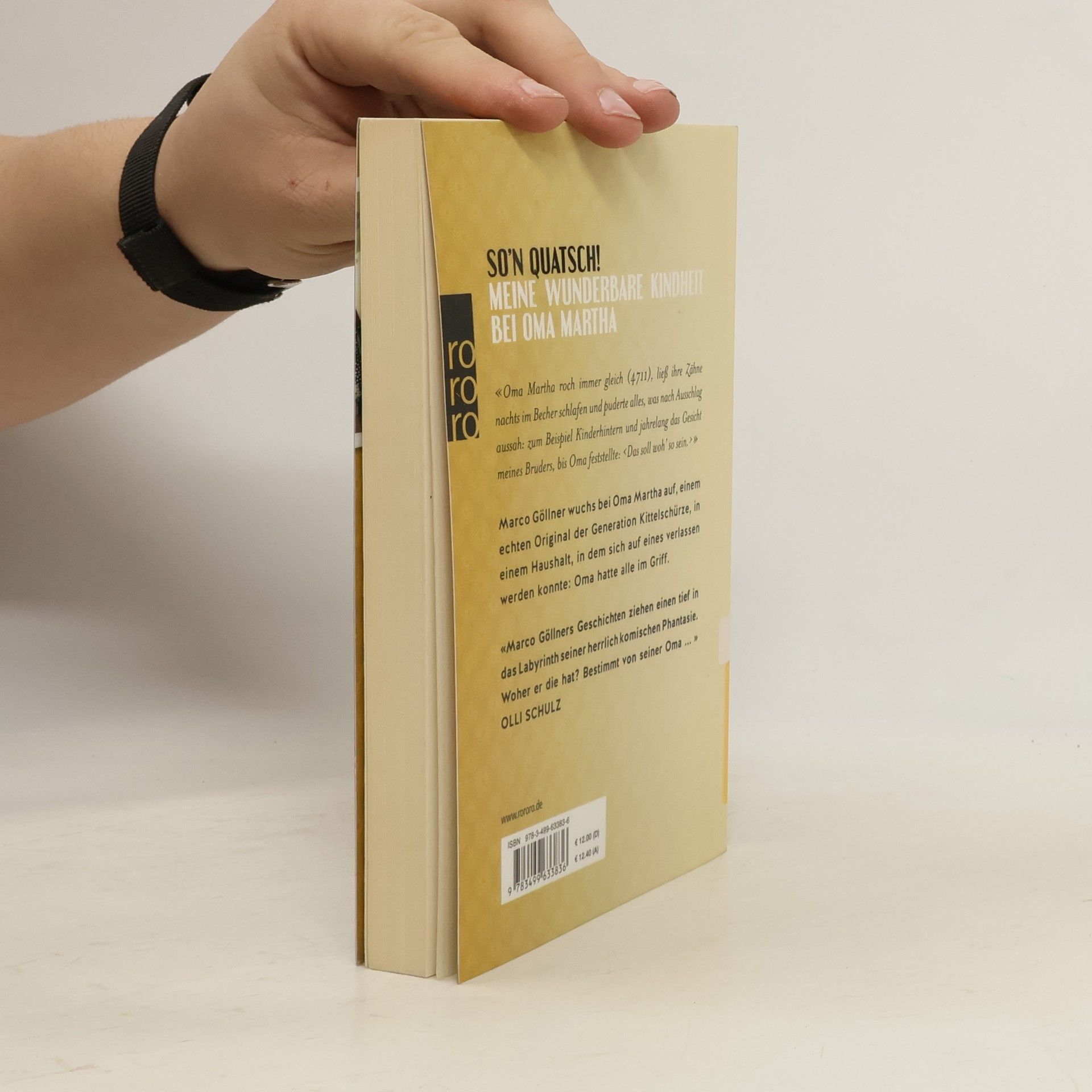 So’n quatsch! Meine wunderbare Kindheit bei Oma Martha «Oma Martha roch immer gleich (4711), ließ ihre Zähne nachts im Becher schlafen und puderte alles, was nach Ausschlag aussah: zum Beispiel Kinderhintern und jahrelang das Gesicht meines Bruders, bis Oma feststellte: ‹Das soll woh’ so sein.›» Marco Göllner wuchs bei Oma Martha auf, einem echten Original der Generation Kittelschürze, in einem Haushalt, in dem sich auf eines verlassen werden konnte: Oma hatte alle im Griff. «Marco Göllners Geschichten ziehen einen tief in das Labyrinth seiner herrlich komischen Phantasie. Woher er die hat? Bestimmt von seiner Oma ... » Olli Schulz