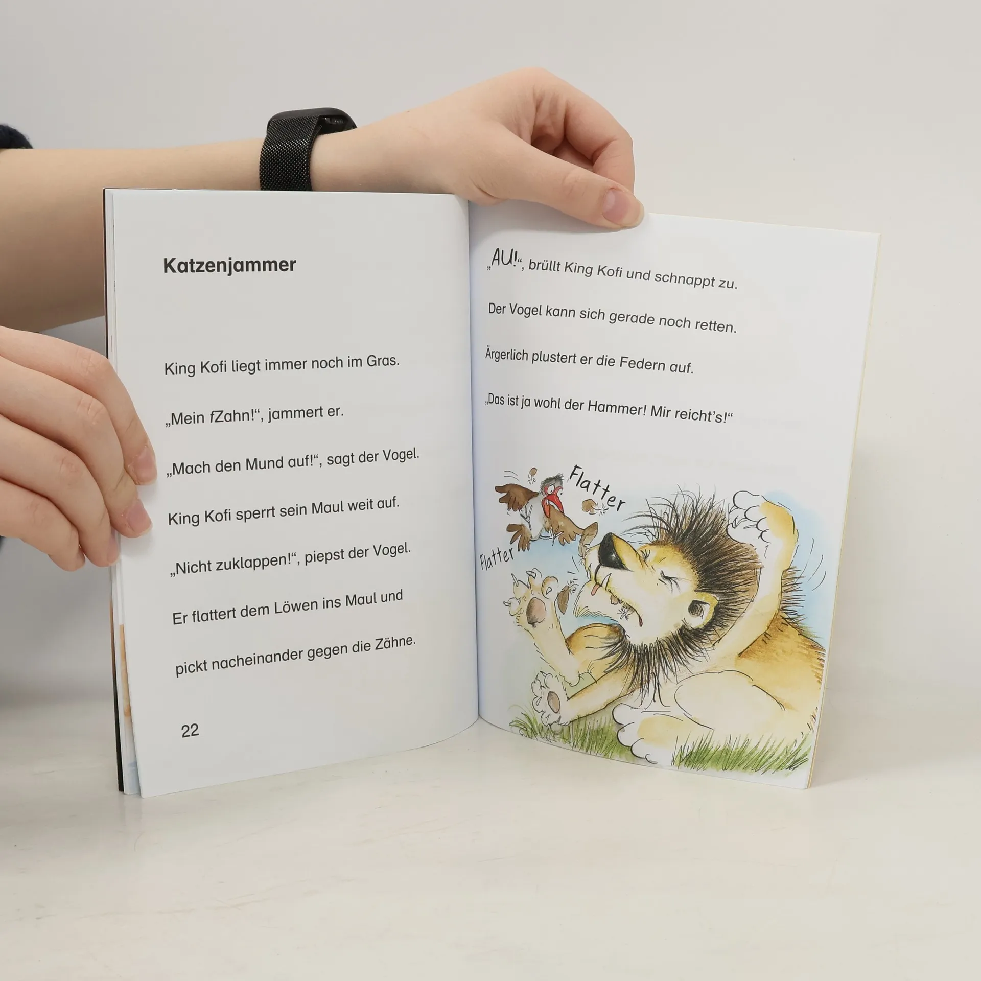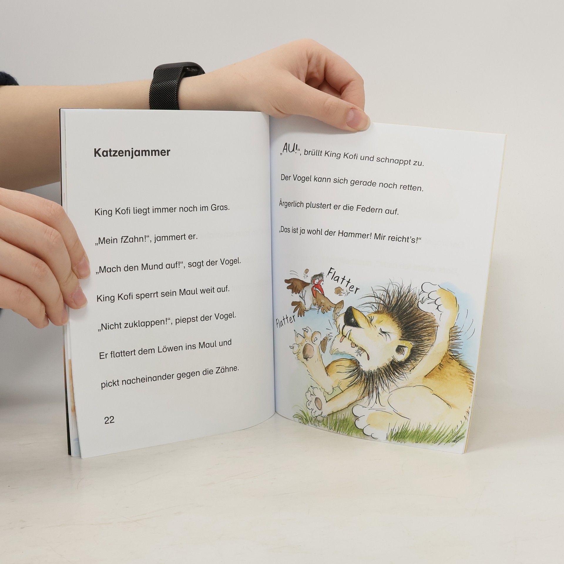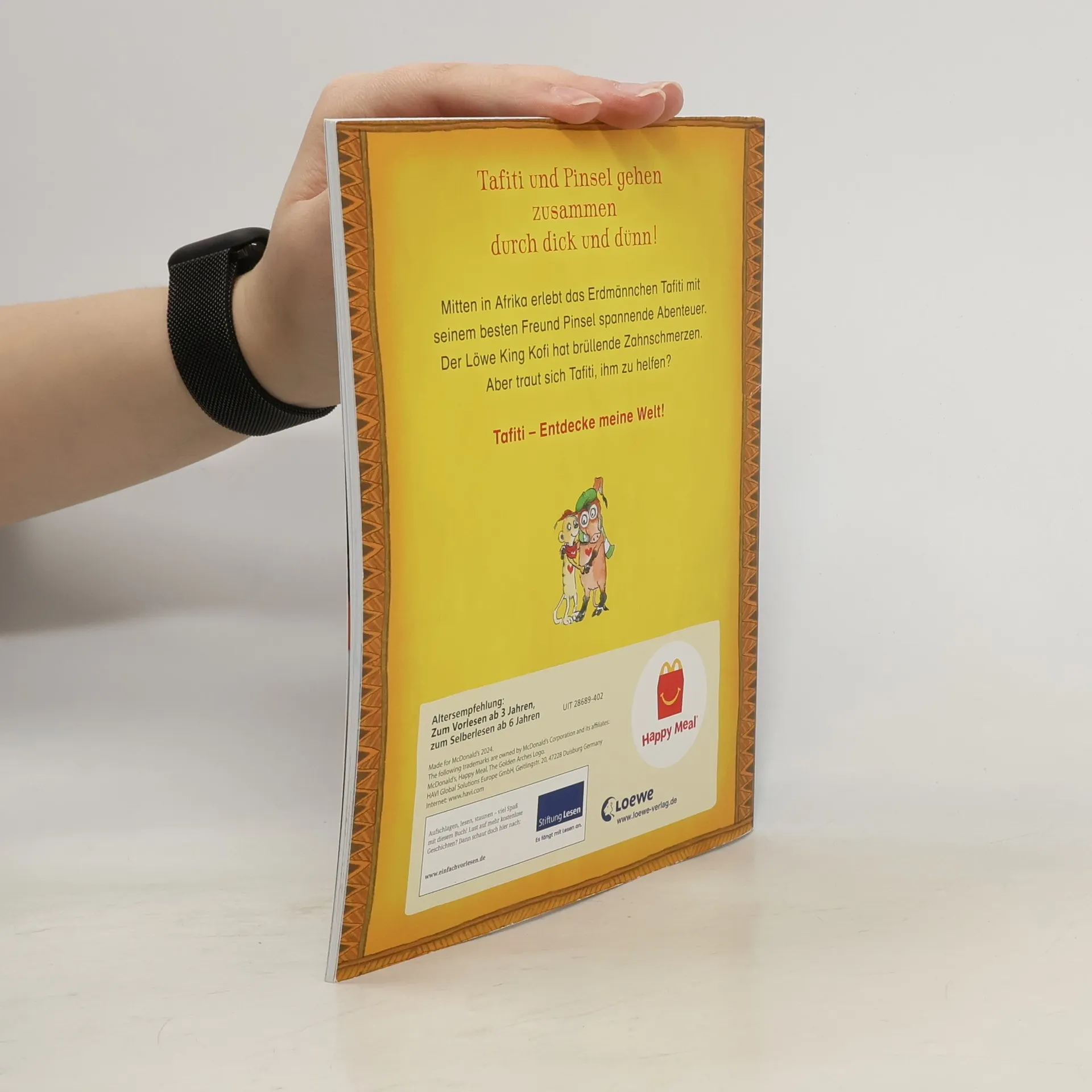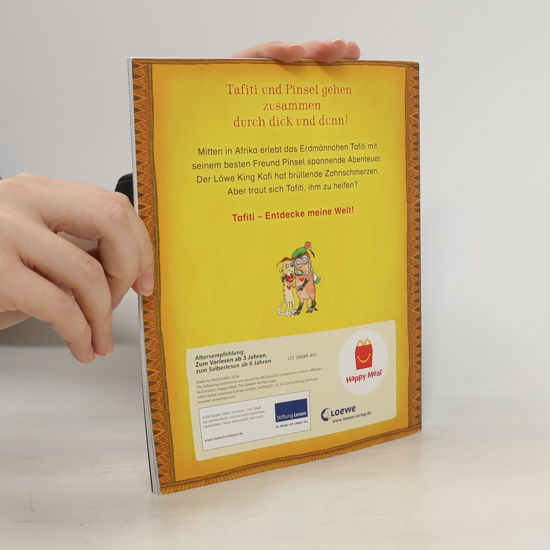 + Bücher, die Kinder gerne lesen wollen + Beliebtes Thema: Tiere + Ausgewogenes Text-Bild-Verhältnis + Große Schrift + Kurze Kapitel + Geeignet zum Vorlesen und ersten Selberlesen + Ideal zum Lesenlernen + Hochwertiges Hardcover + Mit vielen farbigen Illustrationen + Bereits über 450.000 verkaufte Tafiti-Bücher + Tafiti und Pinsel gehen zusammen durch dick und dünn! Au Backe! Als Tafiti und Pinsel am Bach Wasser holen, werden sie von King Kofi überrascht. Und der hat Appetit auf Schweinebraten mit Erdmännchenspieß. Doch der Löwe rechnet nicht mit Tafitis überraschender Gießkannenattacke. Statt in den Braten beißt er auf Blech und hat nun einen Wackelzahn. Ob Tafiti und Pinsel ihm helfen können? Julia Boehme (Conni) erzählt warmherzig und mit viel Humor vom kleinen Erdmännchen Tafiti, das zusammen mit seinen Freunden in Afrika jede Menge spannende Abenteuer erlebt. Für Fans von Walt Disney und Janosch. Ein Buch mit vielen bunten Bildern. - zum Vor- und Mitlesen für Kinder ab 5 Jahren - jedes Hauptwort ist durch ein Bild ersetzt - große Fibelschrift - kurze Sätze - viele bunte Bilder - bei Antolin gelistet Mehr über Tafiti unter www.tafitiswelt.de.