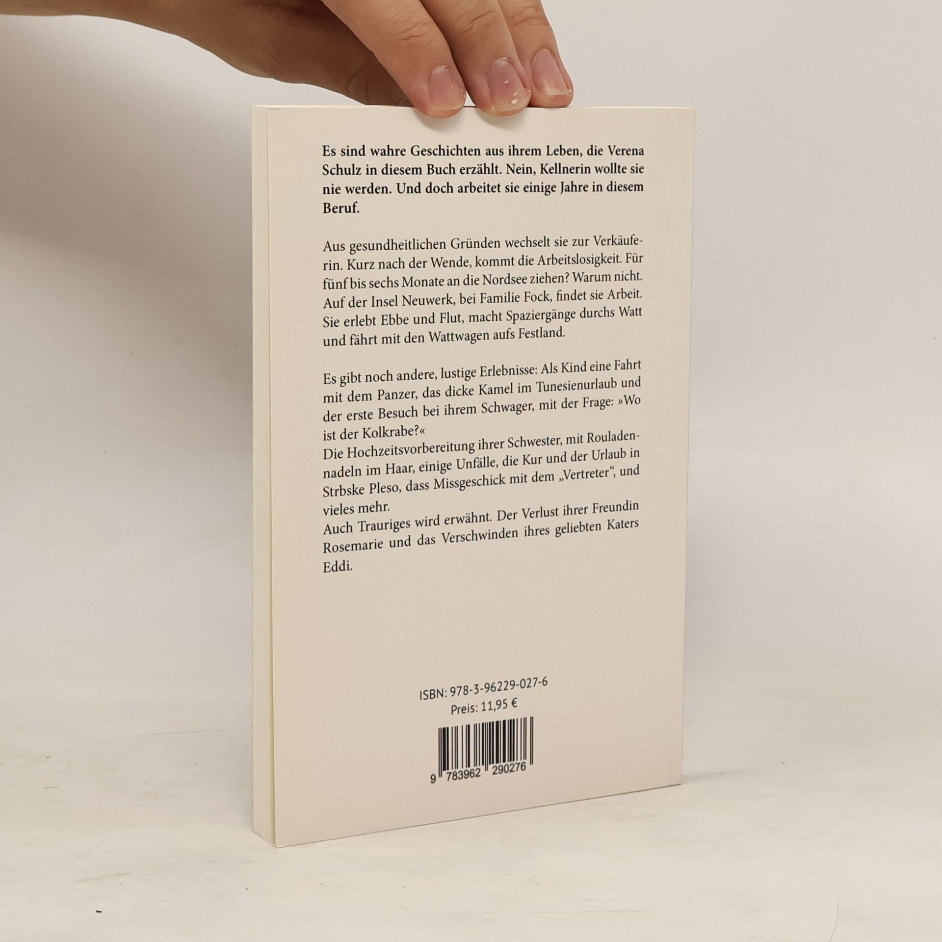Es sind wahre Geschichten aus ihrem Leben, die Verena Schulz in diesem Buch erzählt. Nein, Kellnerin wollte sie nie werden. Und doch arbeitet sie einige Jahre in diesem Beruf. Aus gesundheitlichen Gründen wechselt sie zur Verkäuferin. Kurz nach der Wende, kommt die Arbeitslosigkeit. Für fünf bis sechs Monate an die Nordsee ziehen? Warum nicht. Auf der Insel Neuwerk, bei Familie Fock, findet sie Arbeit. Sie erlebt Ebbe und Flut, macht Spaziergänge durchs Watt und fährt mit den Wattwagen aufs Festland. Es gibt noch andere, lustige Erlebnisse: Als Kind eine Fahrt mit dem Panzer, das dicke Kamel im Tunesienurlaub und der erste Besuch bei ihrem Schwager, mit der Frage: »Wo ist der Kolkrabe?« Die Hochzeitsvorbereitung ihrer Schwester, mit Rouladennadeln im Haar, einige Unfälle, die Kur und der Urlaub in Strbske Pleso, dass Missgeschick mit dem „Vertreter“, und vieles mehr. Auch Trauriges wird erwähnt. Der Verlust ihrer Freundin Rosemarie und das Verschwinden ihres geliebten Katers Eddi.