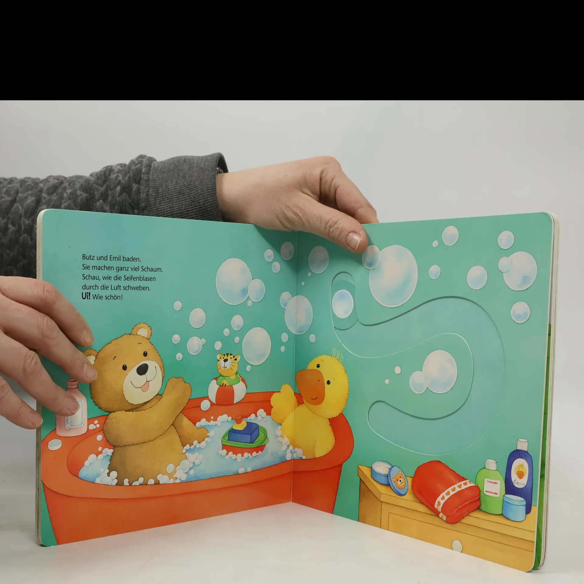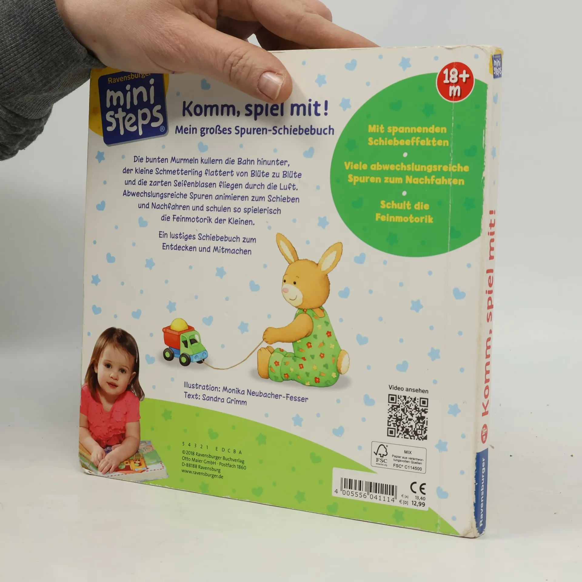 Hier kommt Bewegung ins Buch! Dank der kleinen Motivscheiben können schon die Kleinsten aktiv in die Geschichten eingreifen und die Welt der ministeps Freunde lebendig werden lassen: Die Murmeln kullern die Bahn hinunter, der Schmetterling flattert übers Feld, der Ball hüpft den Hügel hinab und schließlich geht der Mond auf. In den verschiedenen Schiebespuren geht’s mal hoch und runter, mal im Zickzack oder im Kreis. Die fünf ministeps Freunde haben jede Menge Spaß zusammen. Sie spielen mit der Murmelbahn, lassen kleine Boote auf dem Teich schwimmen und machen auch mal ein Picknick zusammen. Am Abend gehen alle Schlafen und sehen dem Mond zu, der am Himmel empor steigt. Dank kleiner Motivscheiben auf jeder Seite können Kinder ab 18 Monaten selbst an den Geschichten teilnehmen. Die zwei Murmeln kullern die Bahn hinunter und das Boot schwimmt auf dem Teich im Kreis herum. Durch das Bewegen der kleinen Scheiben greifen Kleinkinder aktiv ins Geschehen ein und erleben die Geschichte viel intensiver. Spannende Spuren in unterschiedlichen Formen bieten auf jeder Seite ein neues Erlebnis und animieren die Kinder dazu, die Motive an die richtige Stelle zu schieben. Kurze Texte und plakative Bilder führen durch die kleinen Abenteuer. Dieses Spuren-Spielbuch ist genau auf die Entwicklung von Kleinkindern abgestimmt. Es wurde von Pädagogen entwickelt und fördert die Feinmotorik der Kleinkinder altersgerecht und mit viel Spaß!