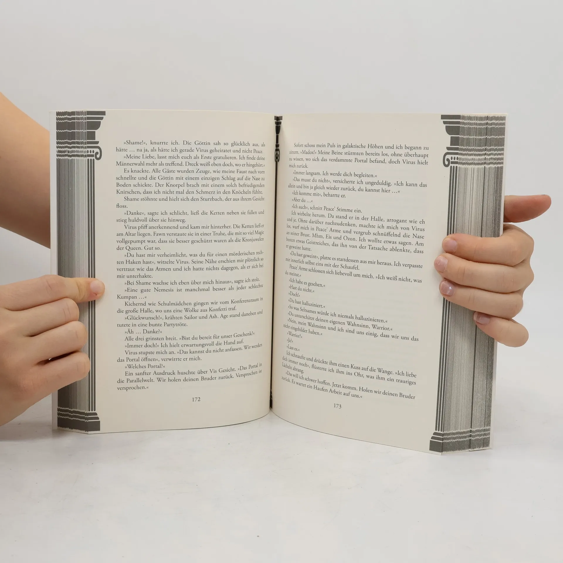 Es gibt fünf Dinge, die du wissen solltest, bevor du dieses Buch liest: 1. Mein Name ist Warrior Pandemos und seit Neuestem bin ich eine Chaos-Göttin. 2. Leider habe ich noch nicht herausgefunden, wie ich diesen Job kündigen kann. 3. Bei unserer hirnrissigen Mission, die griechischen Götter aus dem Olymp werfen zu wollen, haben wir nicht nur versagt, uns wurde sprichwörtlich der Arsch aufgerissen. 4. Weil das Schicksal eine miese Bitch ist, wurde ich auch noch von einem Gott gekidnappt. Sein Name ist Virus (Sohn der Nemesis / grüne Haare / sarkastischer Idiot / schizophren…) 5. Er will Peaces Platz als Gottvater in der Elite streitig machen und bietet mir dafür einen Deal an: Er holt jemanden für mich von den Toten zurück, wenn ich ihn heirate. Und ich? Ich weiß verdammt nochmal nicht, was ich tun soll. Die Fortsetzung von „Warrior & Peace - Göttliches Blut“ Band 1: Warrior & Peace - Göttliches Blut Band 2: Warrior & Peace - Göttlicher Zorn
